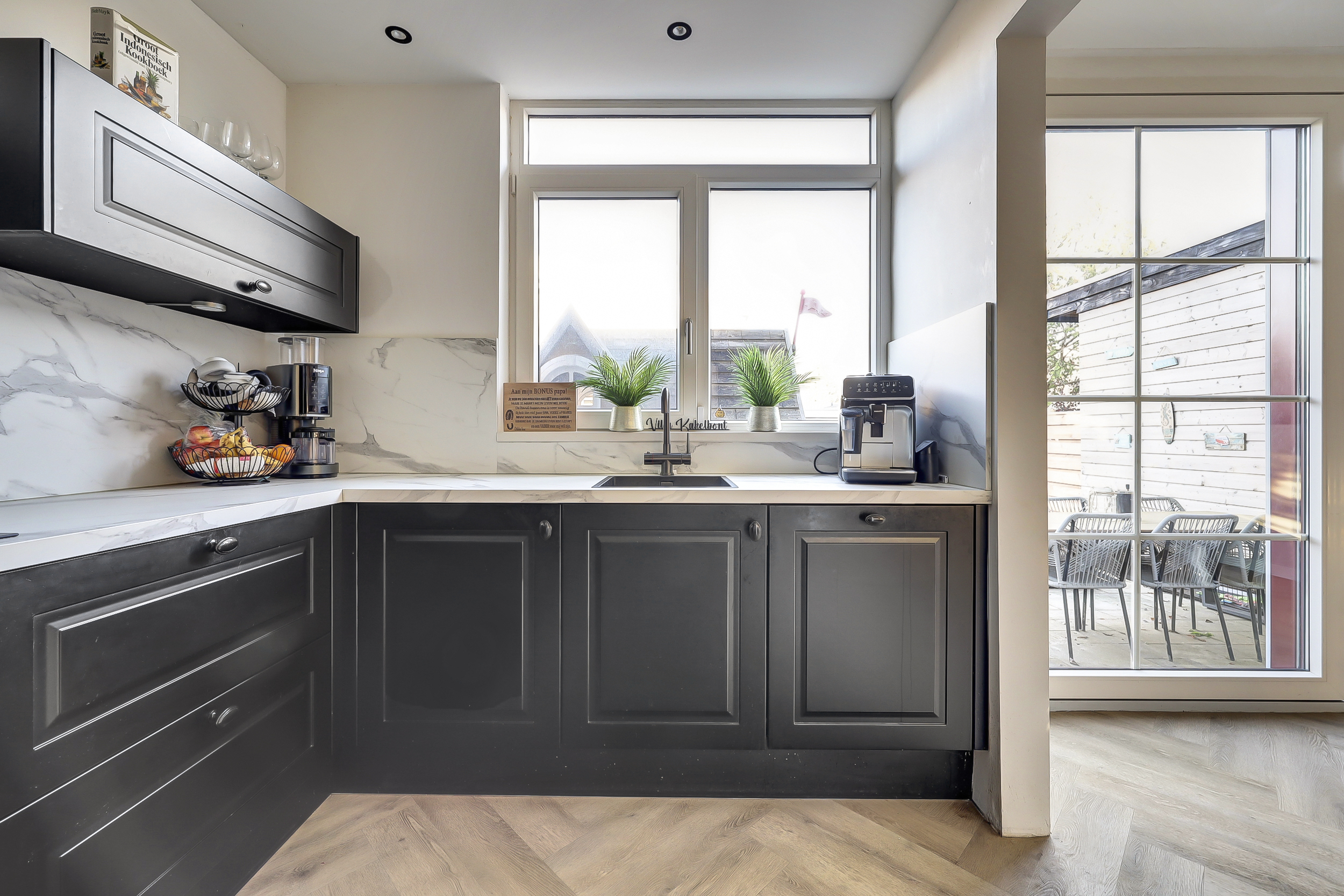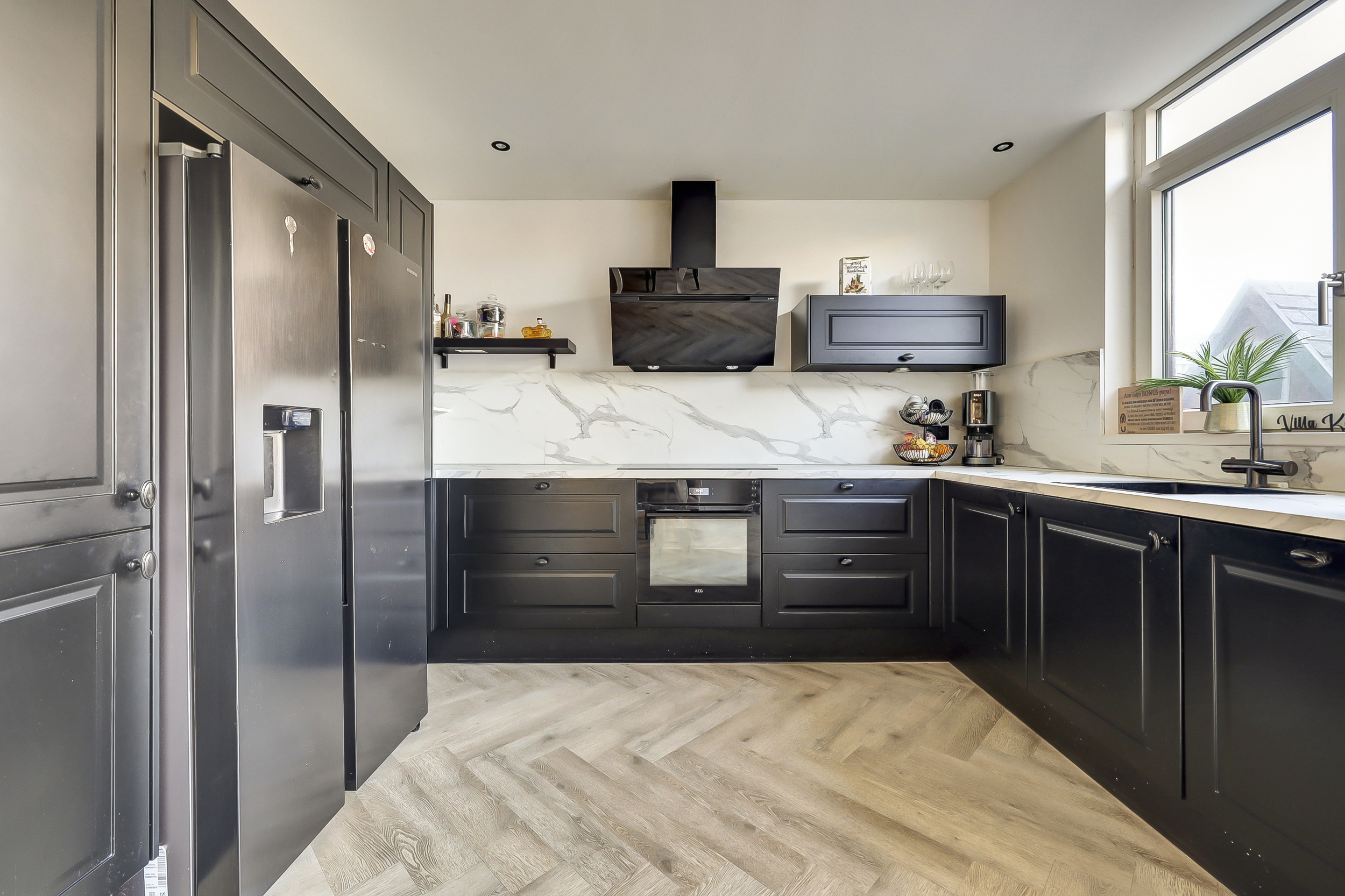 De in 2022 geplaatste moderne open keuken (ca. 9 m²) is U-vormig opgesteld en uitgerust met diverse apparatuur zoals een oven, inductiekookplaat, moderne afzuigkap, vaatwasser, kookendwaterkraan, een Amerikaanse koelkast (Samsung) en ingebouwde verlichting. Zowel de vloer als wandafwerking van de woonkamer lopen vloeiend over in de keuken en geven het totaal een sfeervol geheel.