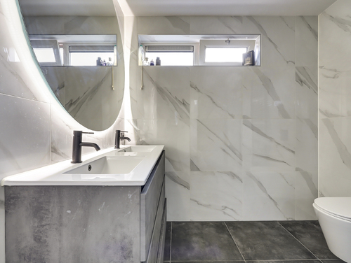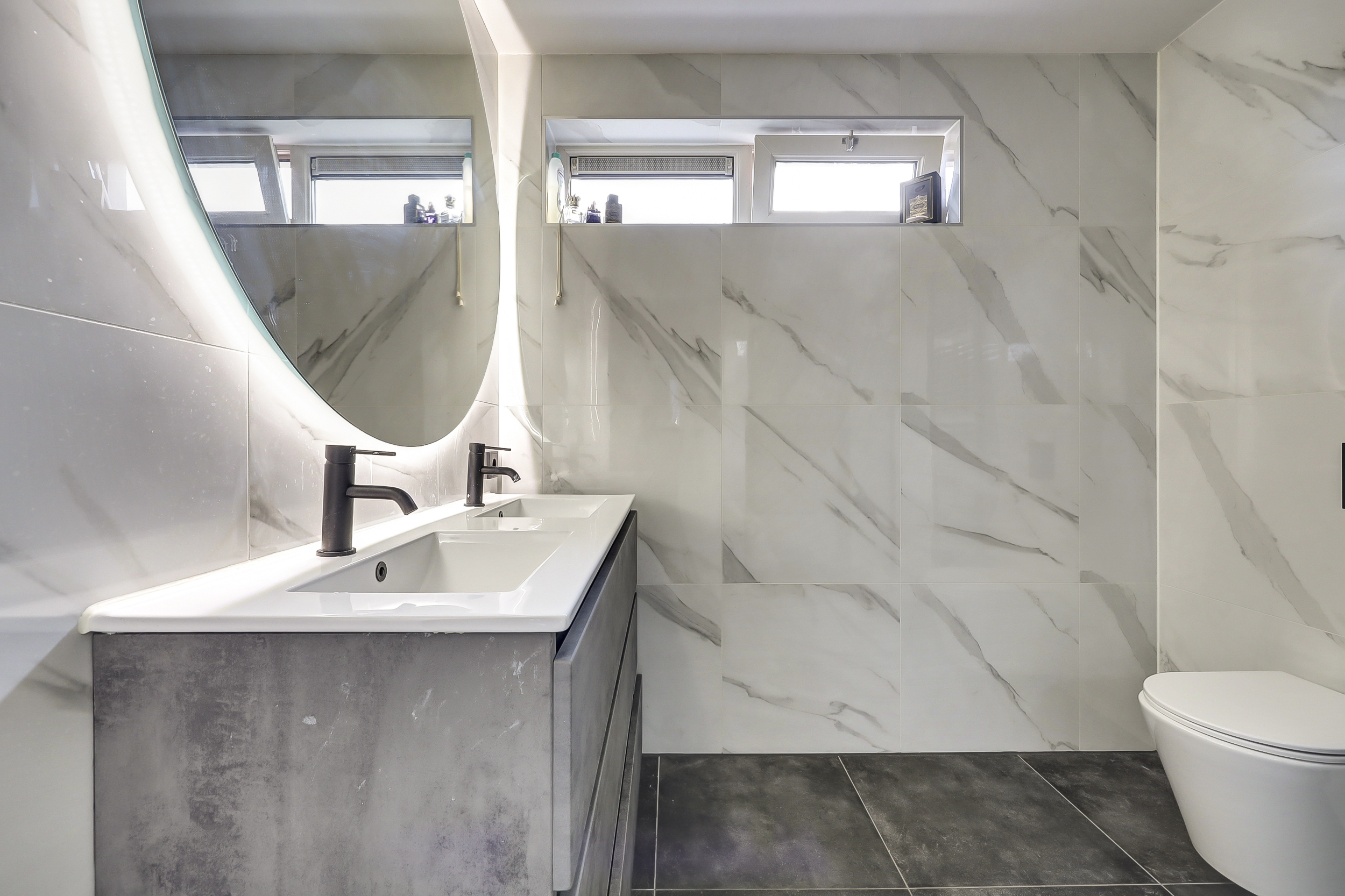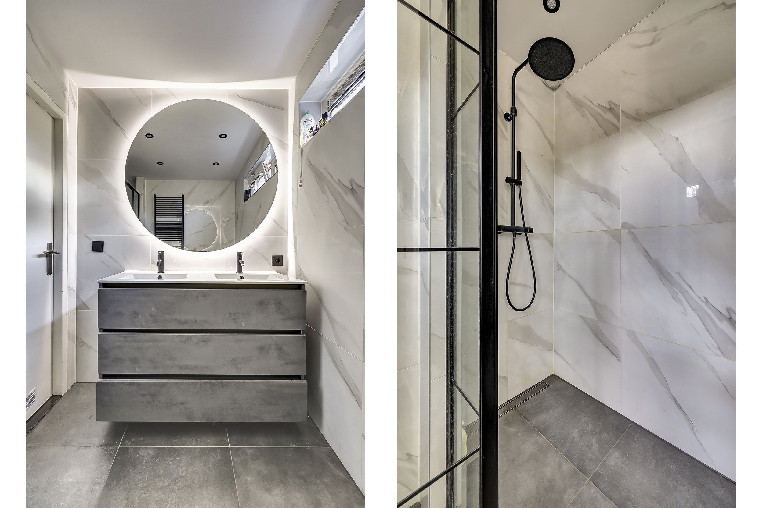 De schitterende badkamer (ca. 2.36 m x 2.67 m) is geplaatst in 2023 en voorzien van een ruime douchecabine, ingebouwde verlichting, een 2e toilet met zwevend closet, design radiator, een uitzetraam en een wastafel met meubel.