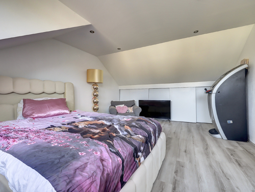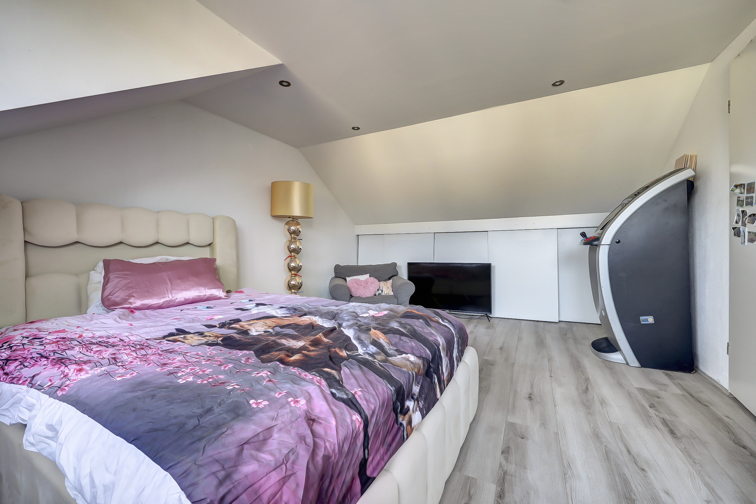 Deze ruime kamer (ca. 4.97 m x 3.70 m) is uitgerust met een brede kunststof dakkapel en ingebouwde verlichting.