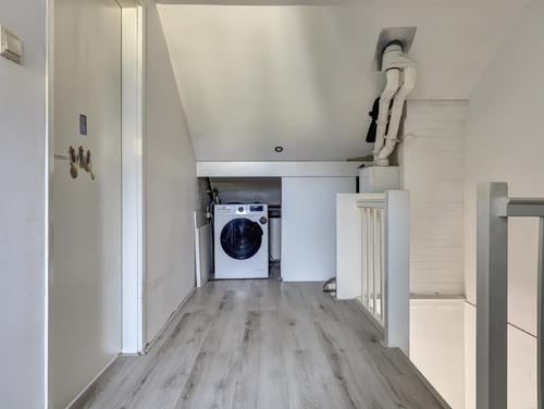 Via een vaste trap bereik je de overloop met dakkapel en diverse bergruimten achter de knieschotten. Hier bevinden zich tevens de cv combiketel (type Nefit, bouwjaar 2022, huur) de wasmachine en de droger. Op deze verdieping tref je ook de 4e slaapkamer.