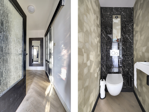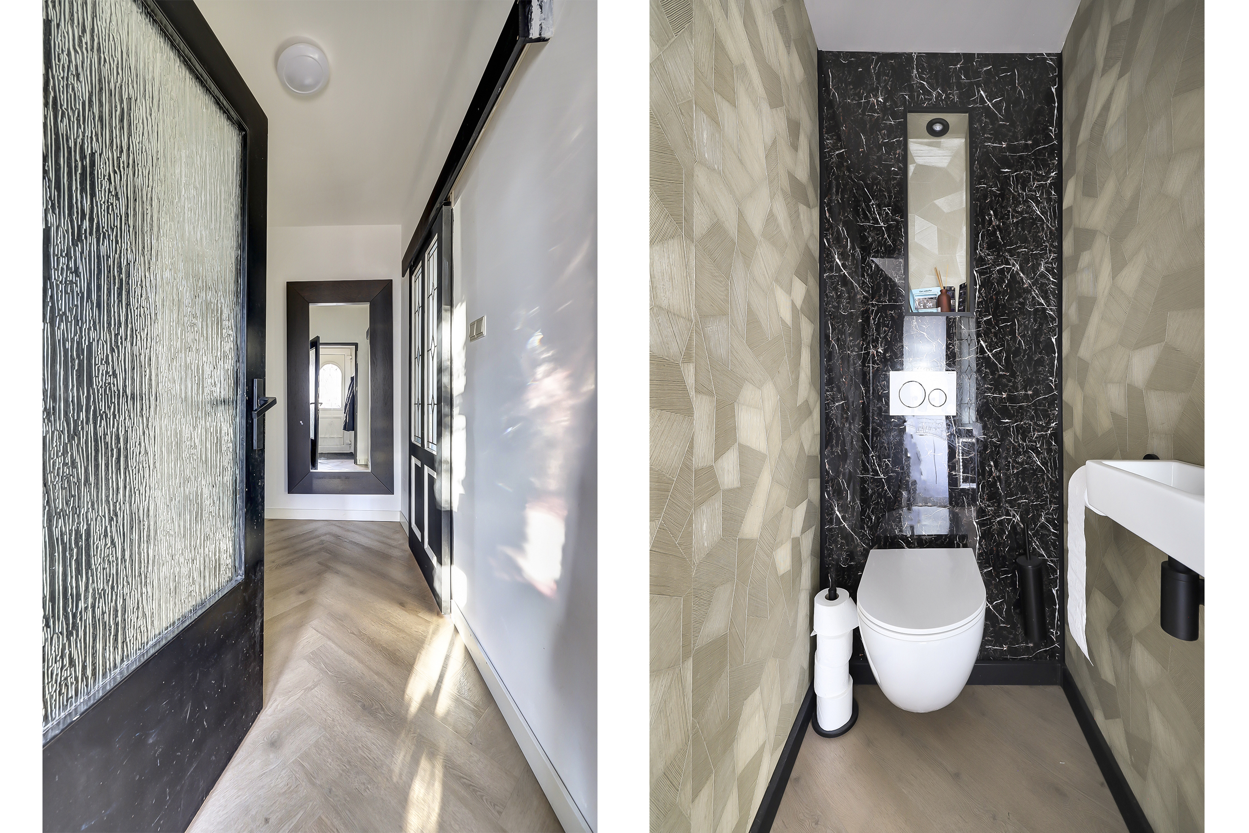 Hal/entree met meterkast (10 groepen met slimme meters/glasvezel), pvc vloer, licht gesausde wandafwerking, toilet met zwevend closet en handwasbakje (2023), een handige voorraadkast, trapopgang en de toegang tot de doorzonwoonkamer.