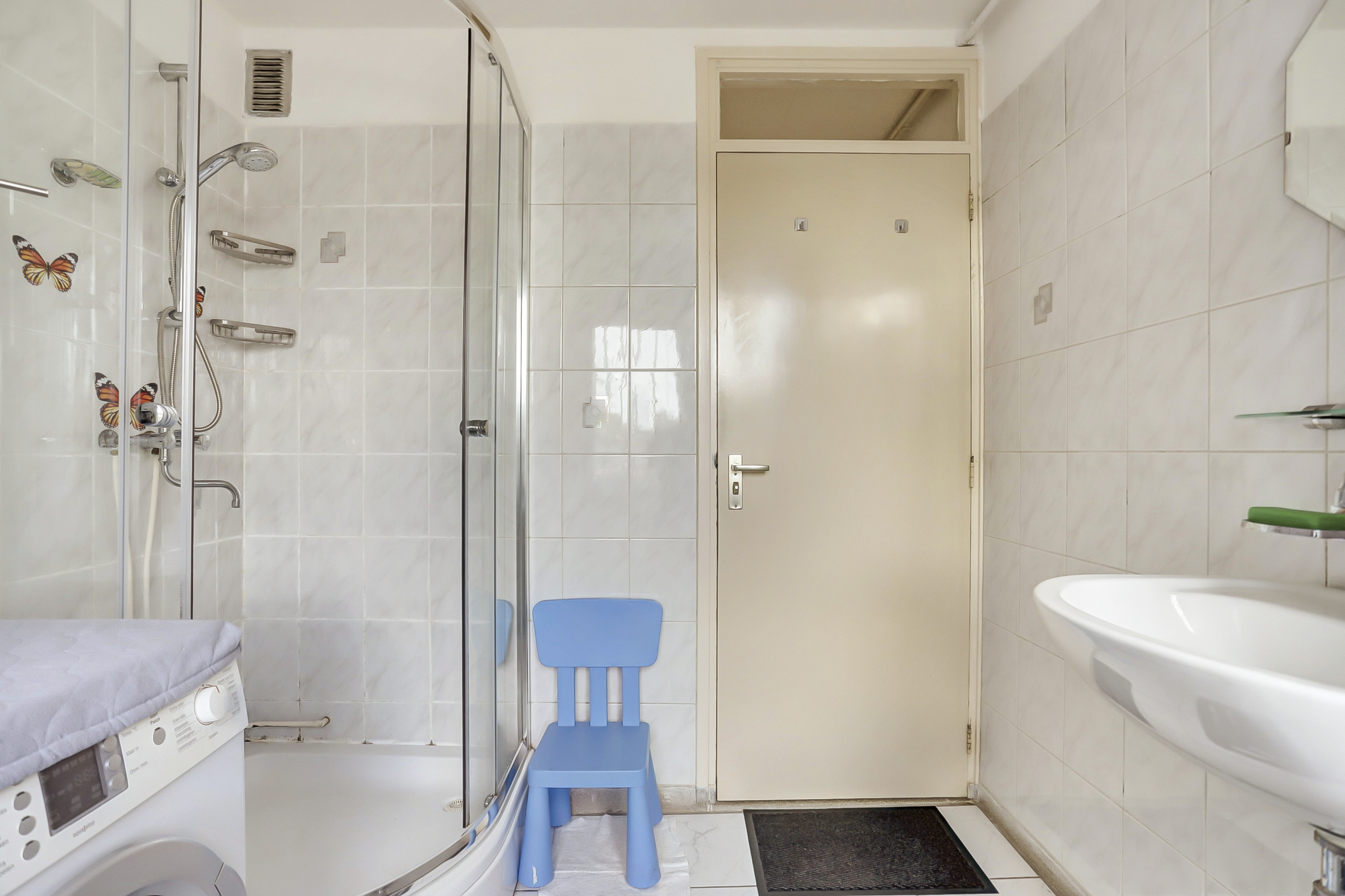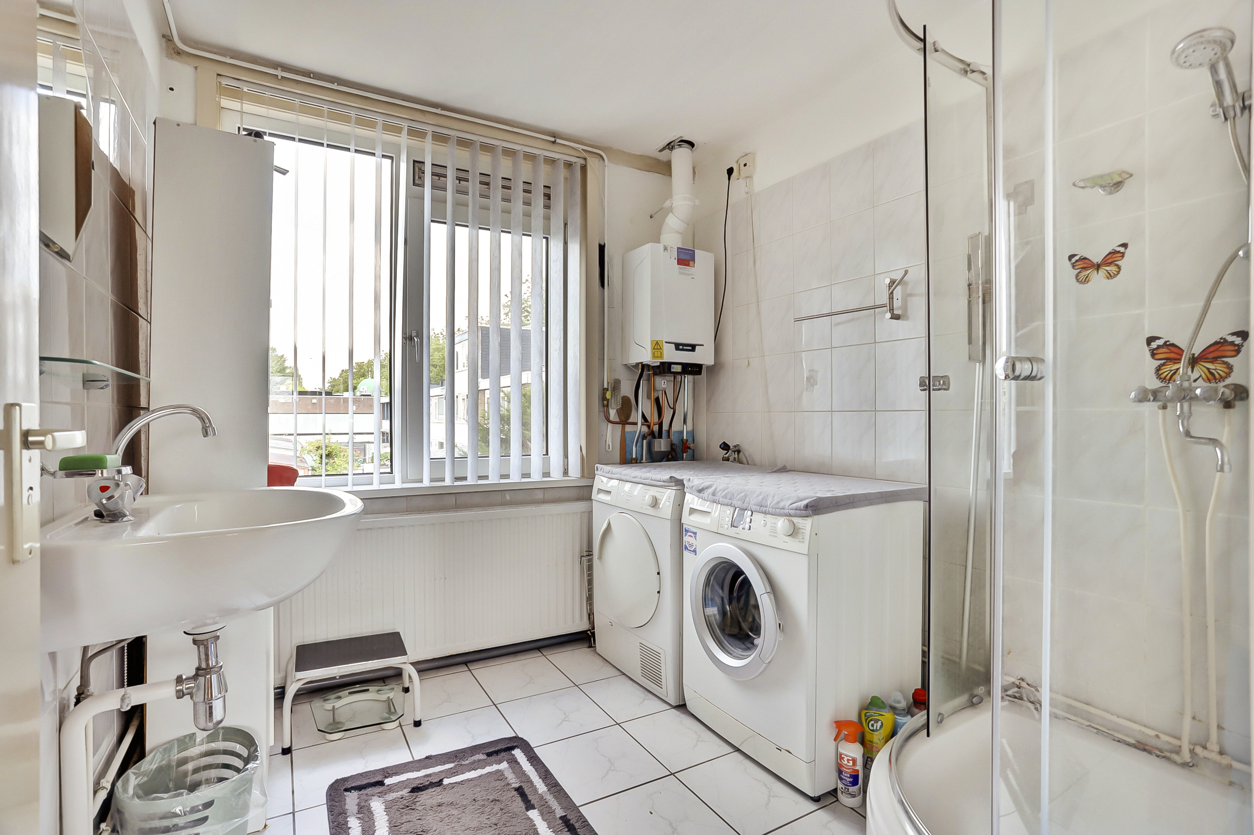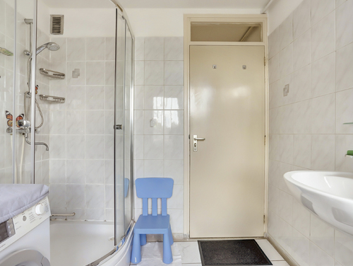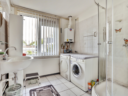 De licht betegelde badkamer (ca. 2.33 m x 2.45 m) is uitgerust met een douche, wasmachine aansluiting en een wastafel. Tevens staat de cv combiketel (Remeha, bouwjaar 2024) hier opgesteld.