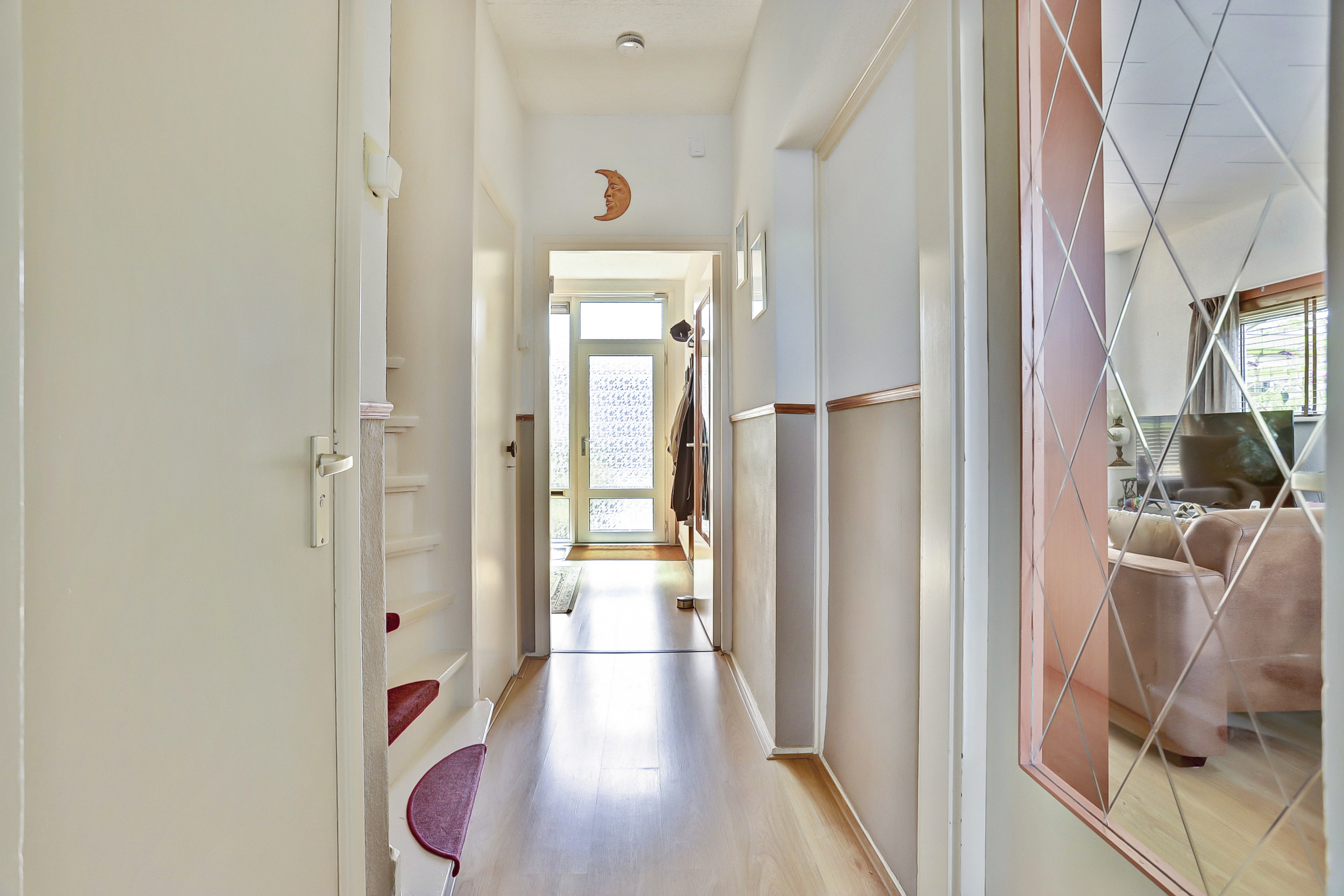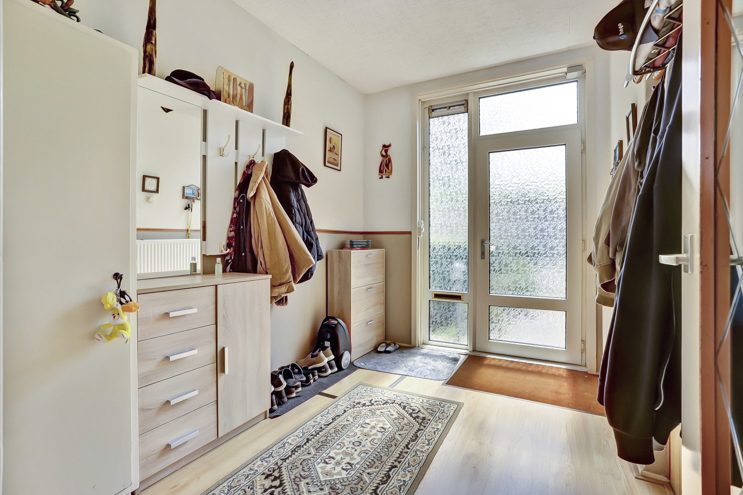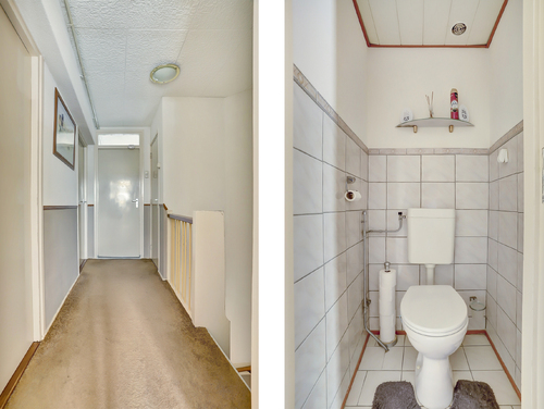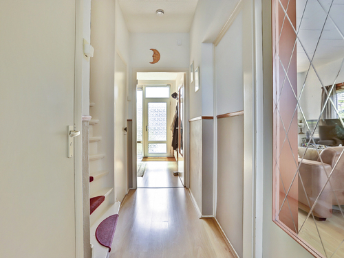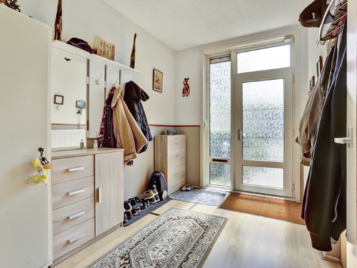 Ruime hal/entree (ca. 3.26 m x 2.28 m) met garderoberuimte, meterkast (5 groepen, 2 aardlekschakelaars), trapkast, trapopgang en een toilet met mechanische ventilatie.