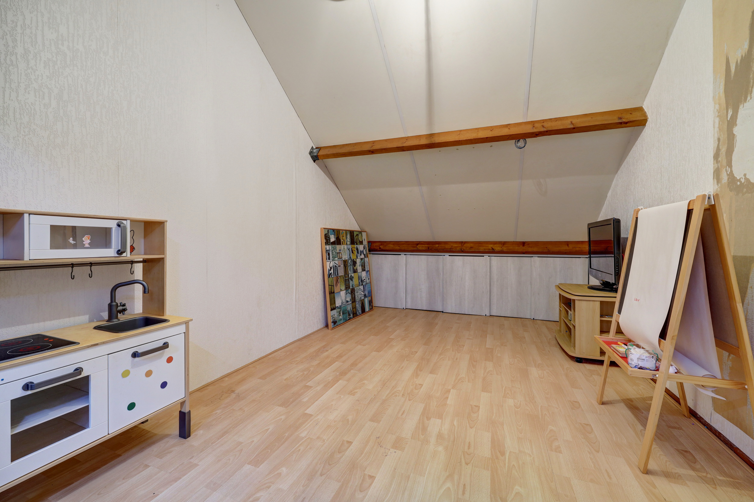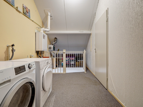 Via een vaste trap bereik je de overloop waar de wasmachine, droger en cv combiketel (Intergas hre, bouwjaar 2025) staan opgesteld. Tevens tref je hier de 4e slaapkamer (ca. 16 m²) met een groot "Velux" dakraam en opberggelegenheid achter het knieschot.