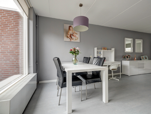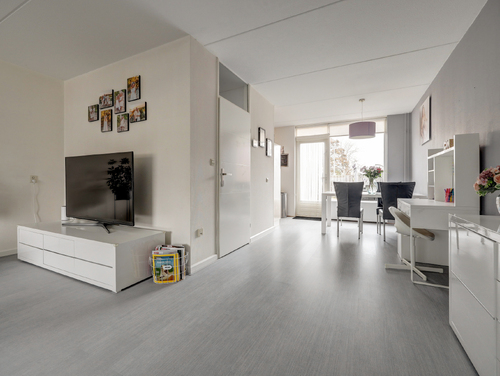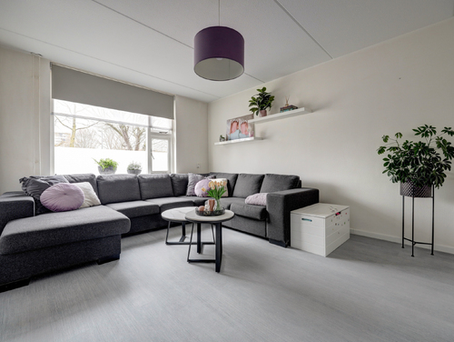 De sfeervolle woonkamer van ca. 30 m² is voorzien van een laminaatvloer, licht gesausde wanden met glasvezel, een achterdeur en grote ramen waardoor er hier een zeer prettige lichtinval aanwezig is.