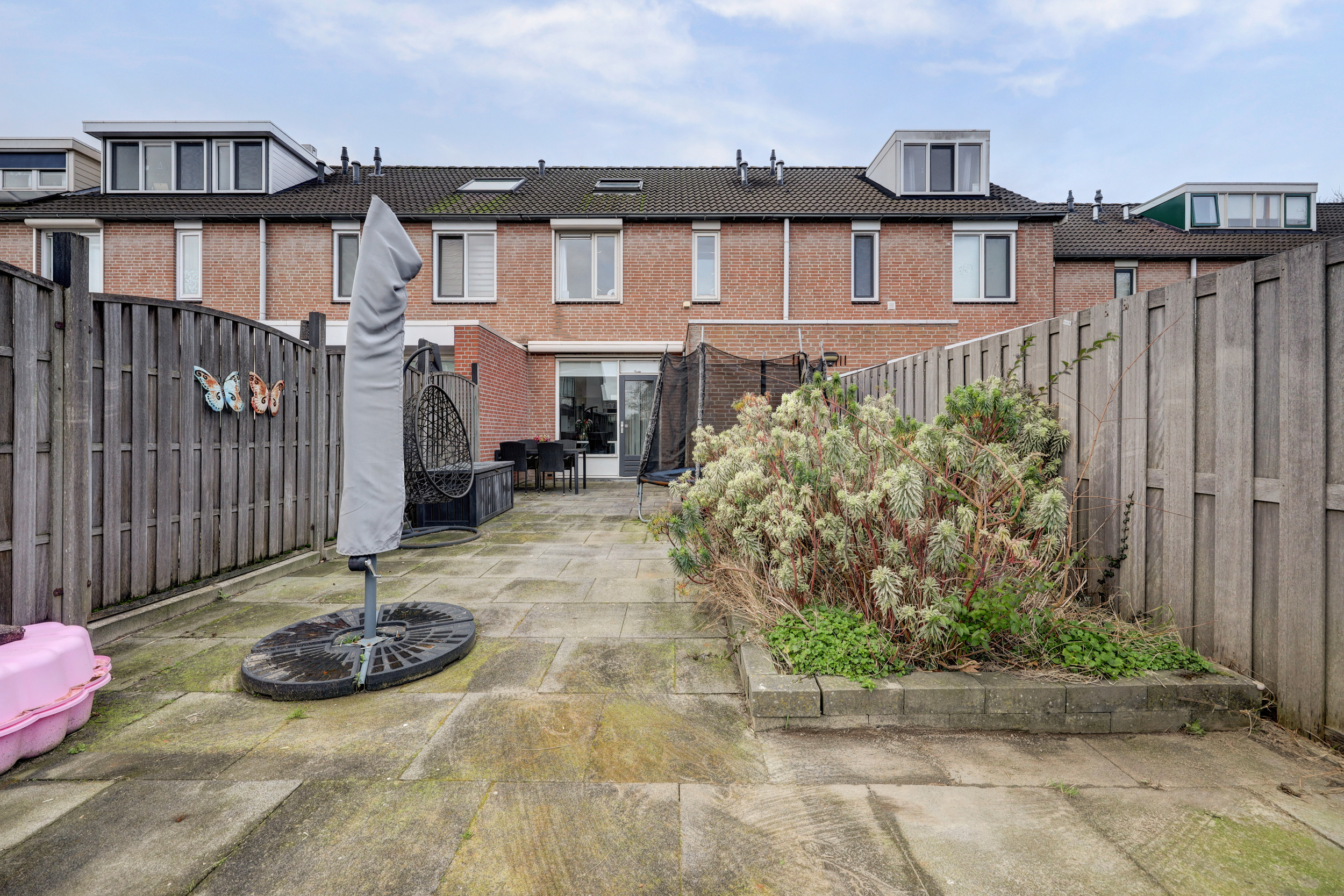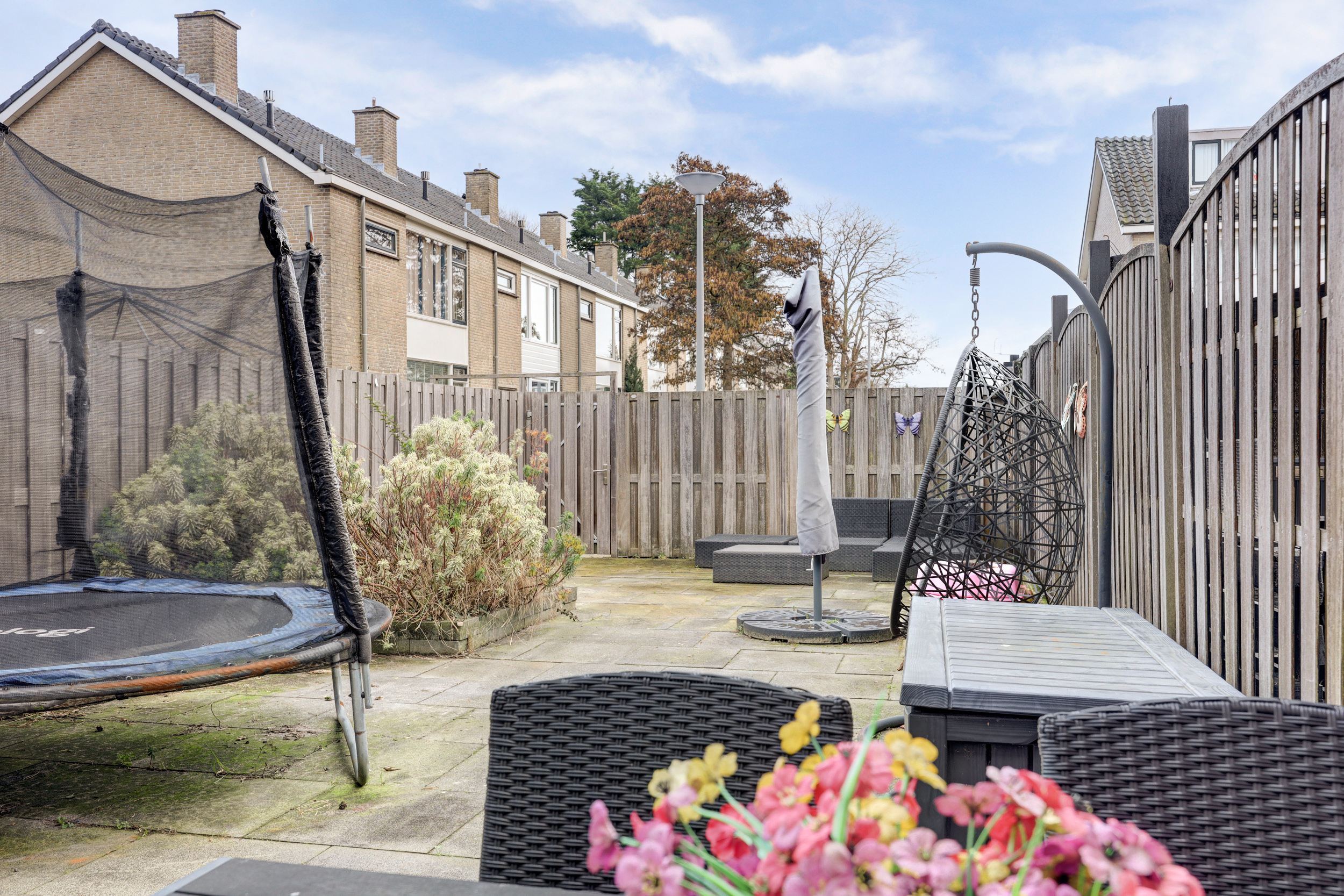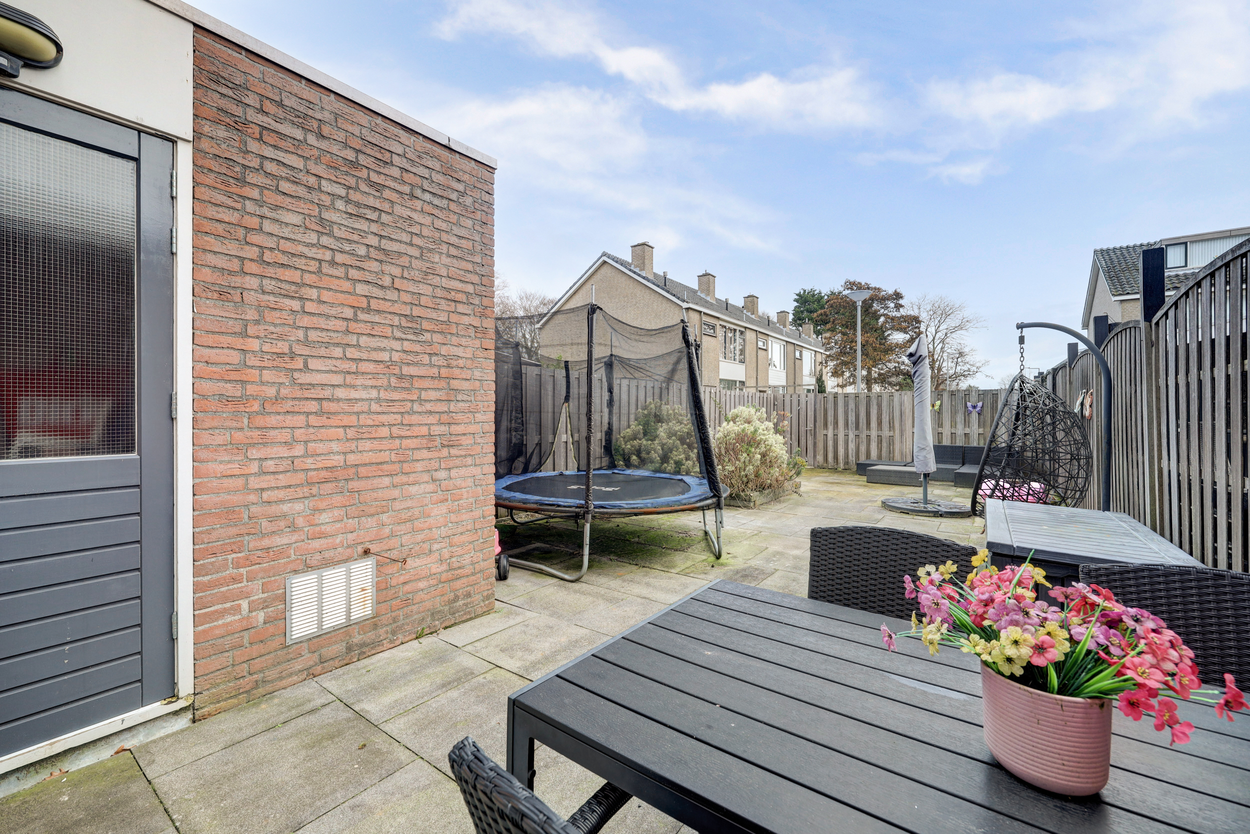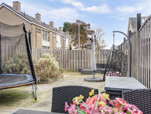De diepe achtertuin is gesitueerd op het zuidoosten en uitgerust met elektrische zonwering, een aangebouwde stenen berging, achterom, geheel omheind en sierbestrating. De voortuin is eveneens bestraat en voorzien van een buitenkraan.