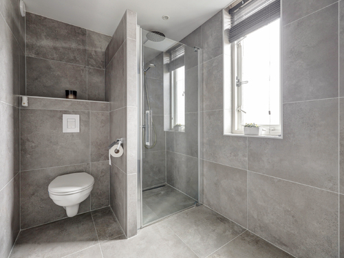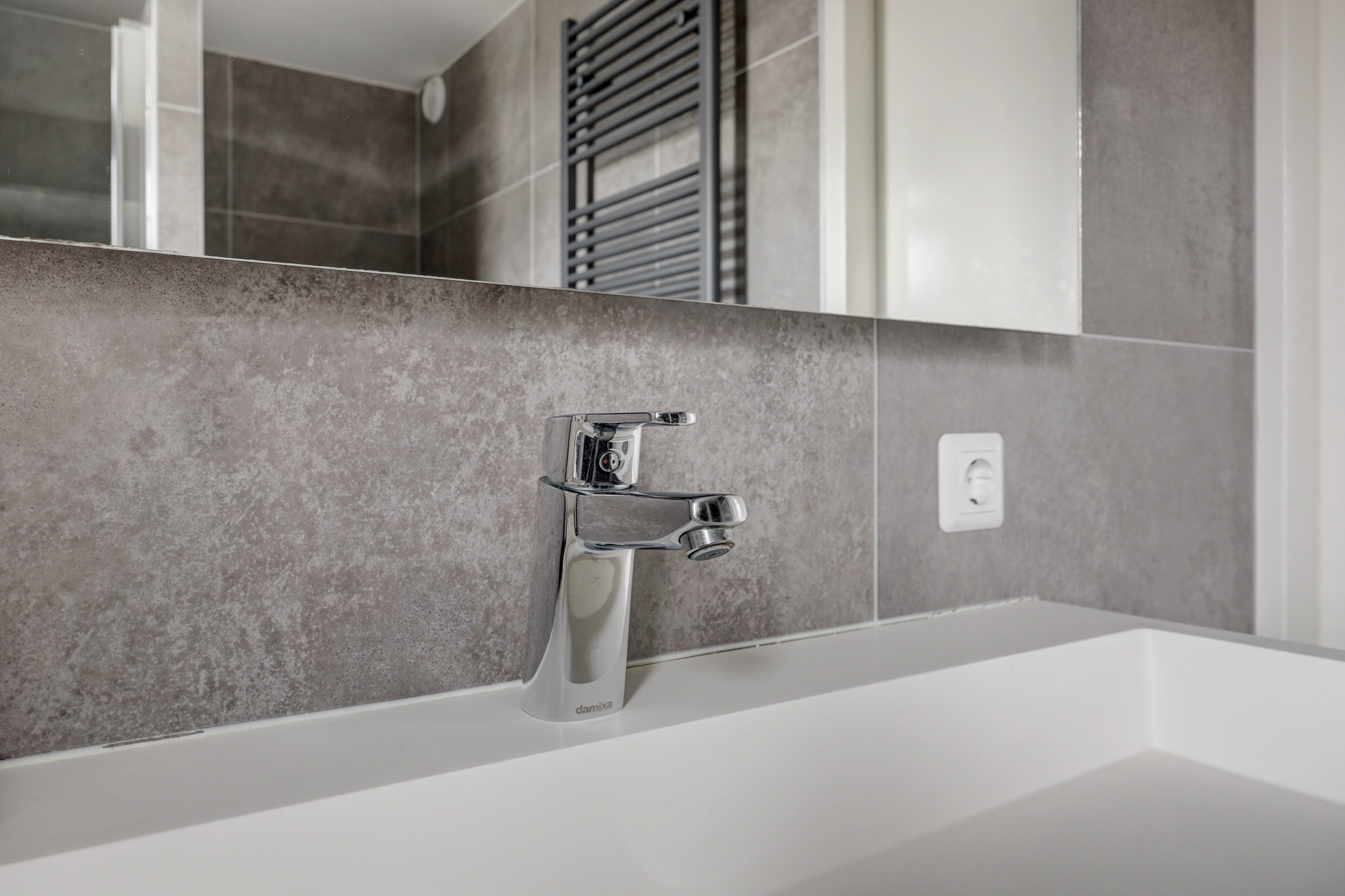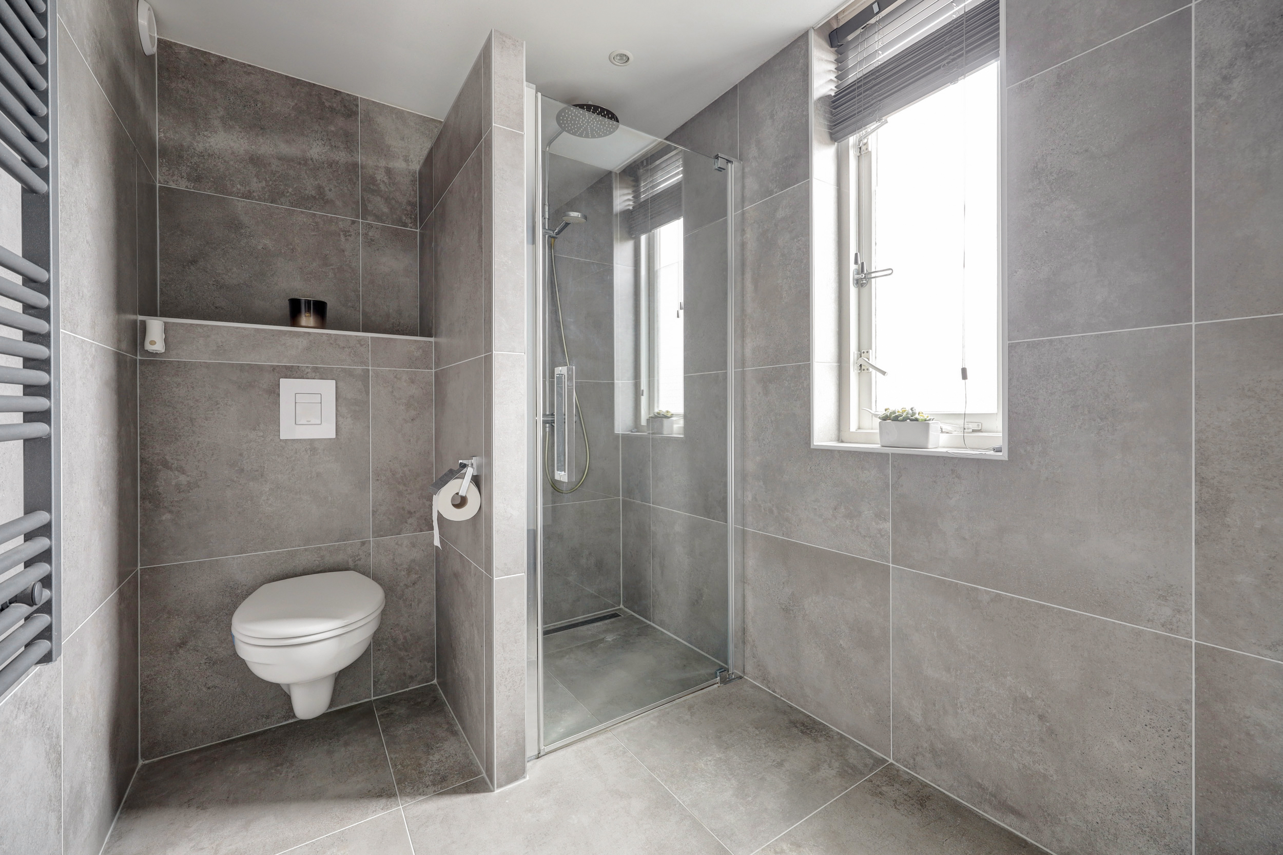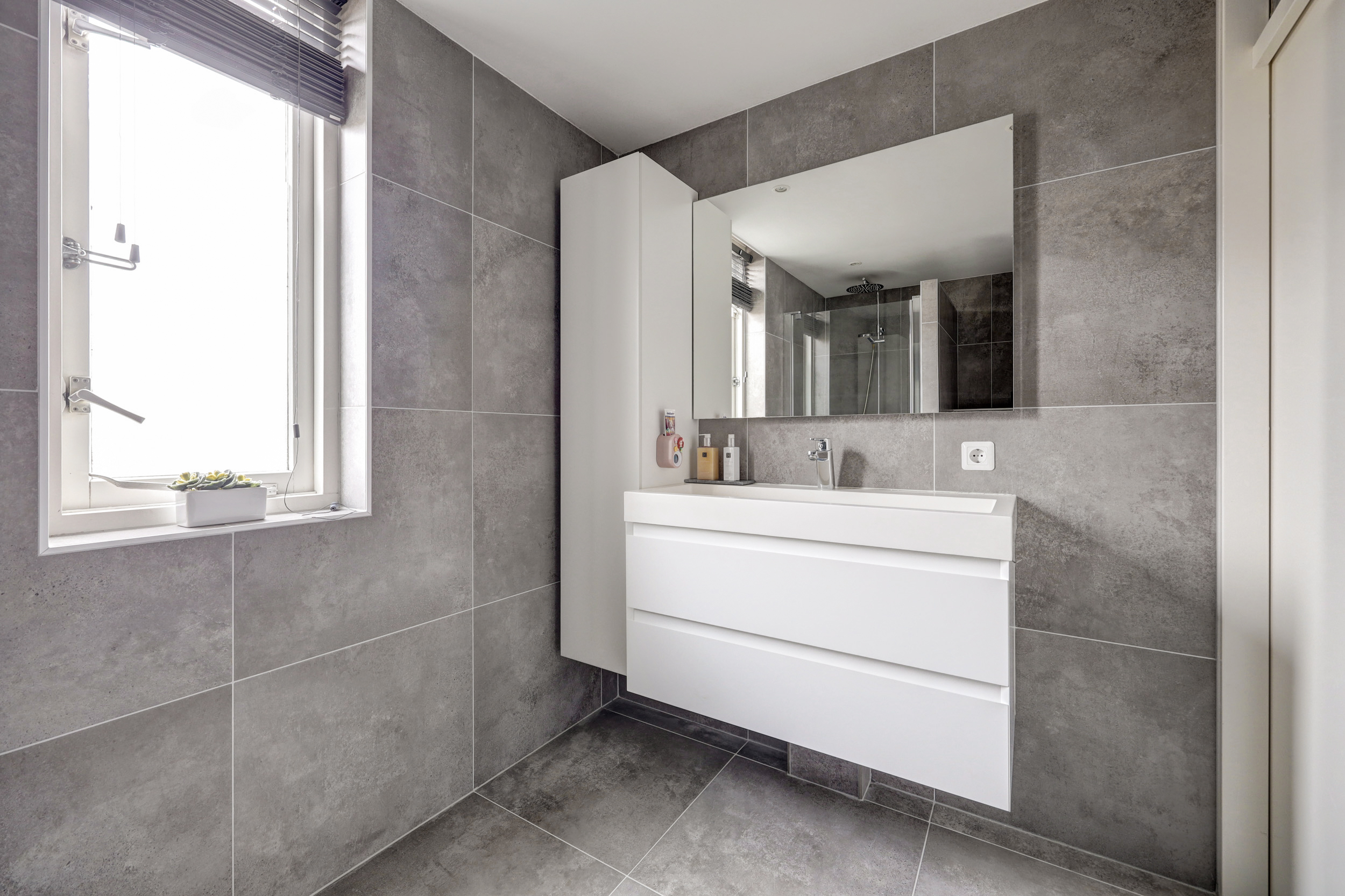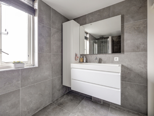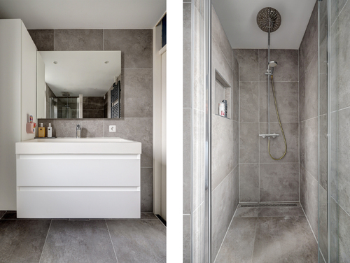 De in 2021 geplaatste badkamer (ca. 4 m²) is geheel modern getegeld en voorzien van een douchecabine met regendouche, 2e toilet, design radiator, wastafel met meubel, ingebouwde verlichting, mechanische ventilatie en een uitzetraam voor de natuurlijke ventilatie.