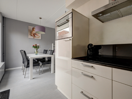 De open keuken (ca. 10 m²) bevindt zich aan de achterzijde van de woning en is uitgerust met een L-vormige inrichting en diverse apparatuur zoals een combimagnetron, inductiekookplaat, rvs afzuigschouw, vaatwasser en een koelkast. De vloer en wandafwerking van de woonkamer lopen naadloos over in de keuken en geven het een bijpassend geheel. Vanuit de keuken bereik je de aangebouwde stenen berging (ca. 5 m²) met plavuizenvloer en deur naar de tuin.