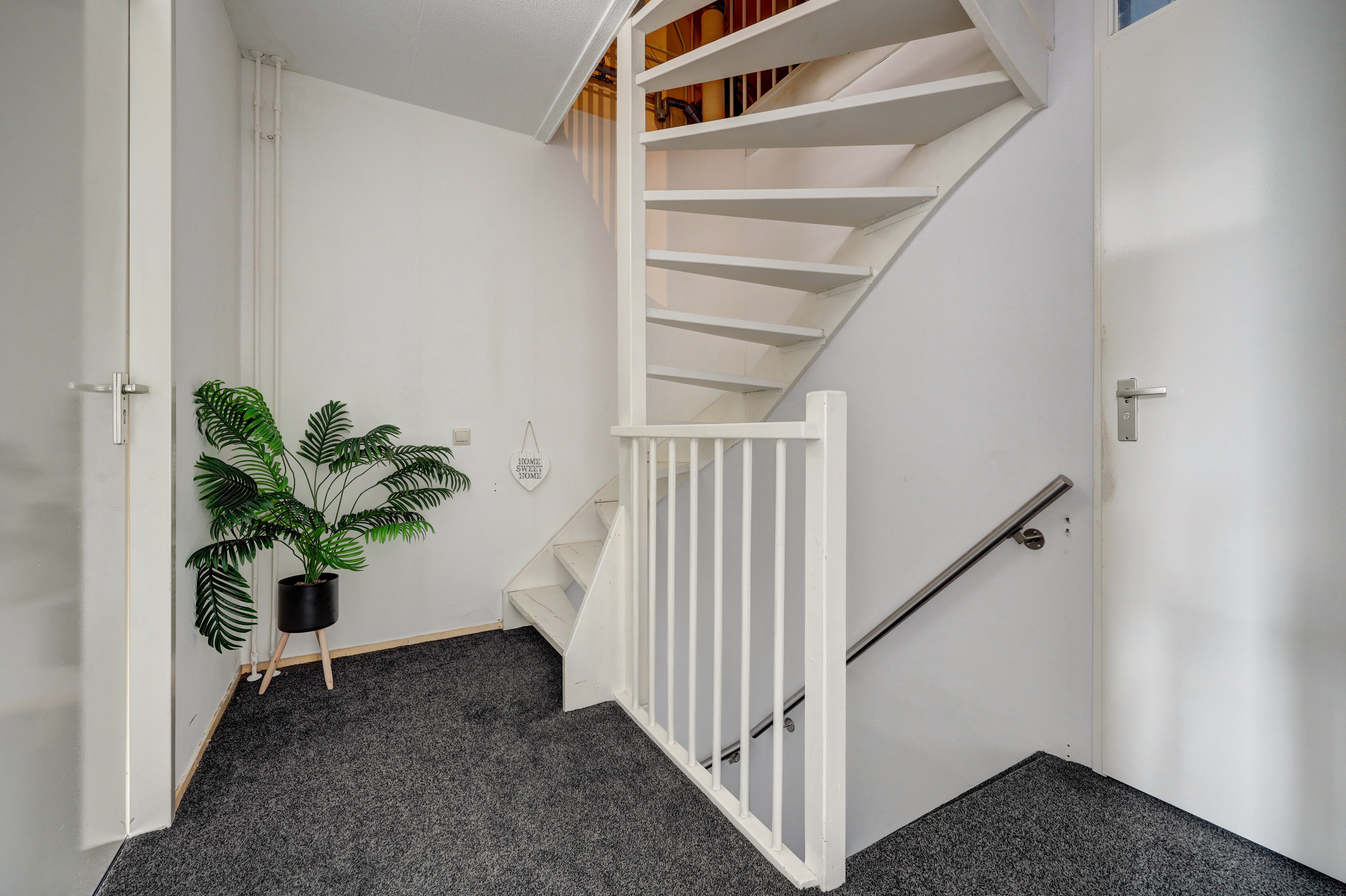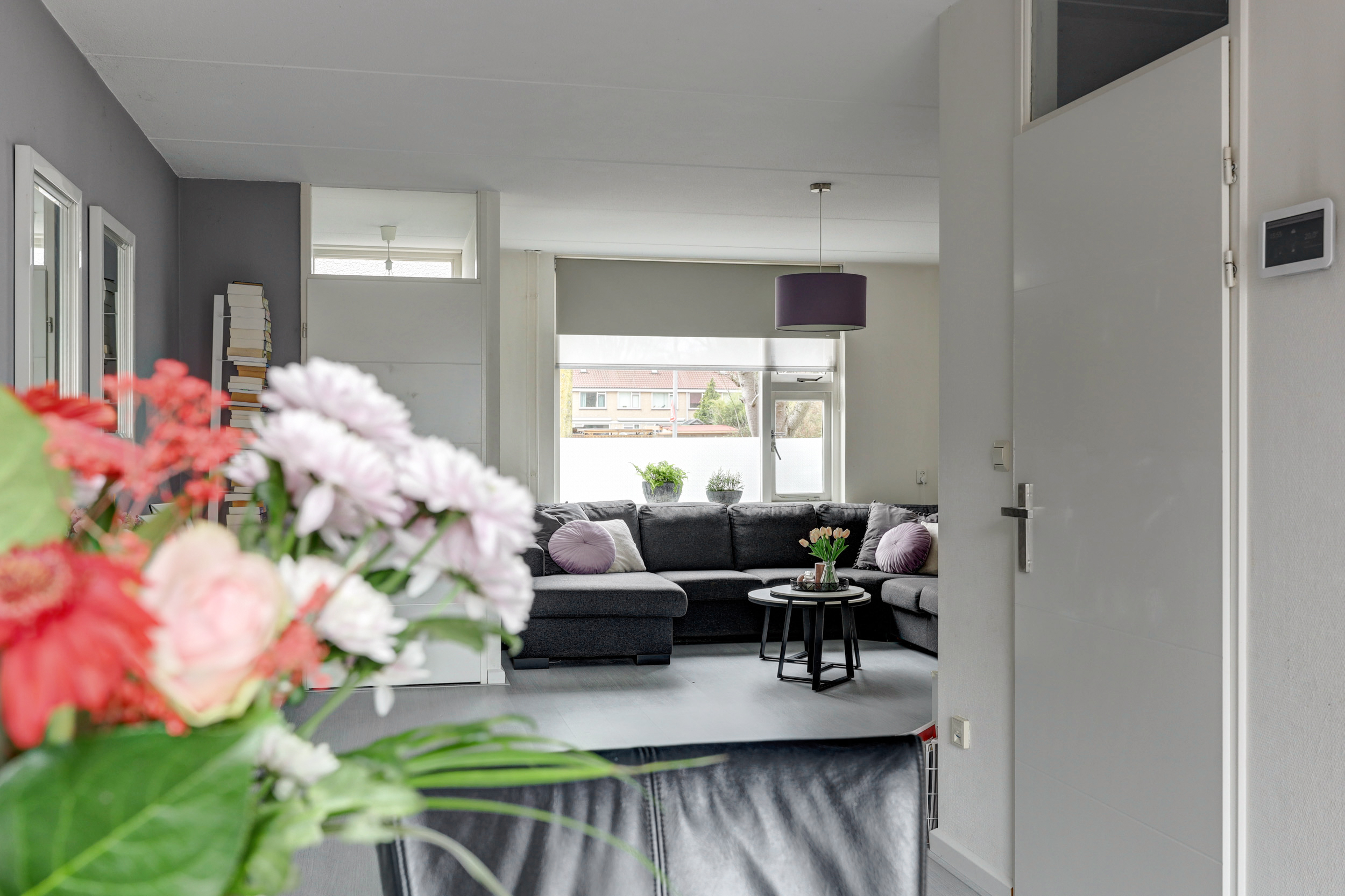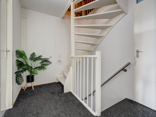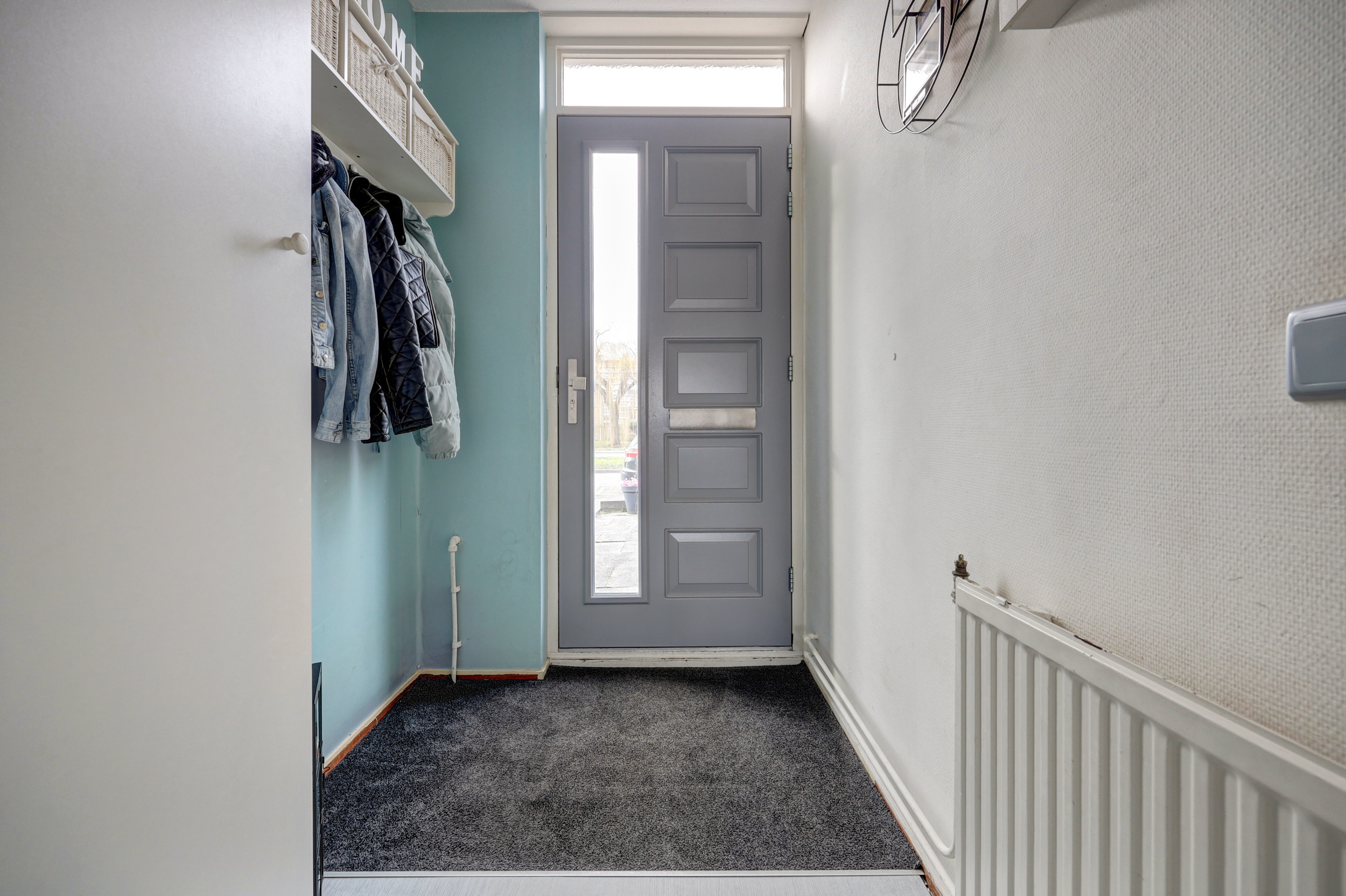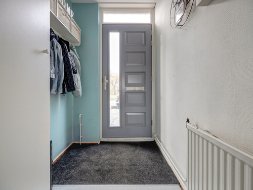 Hal/entree met laminaatvloer, glasvezelwandafwerking, meterkast (8 groepen met slimme meters), garderoberuimte en de toegang tot de woonkamer.