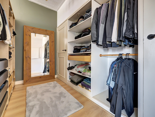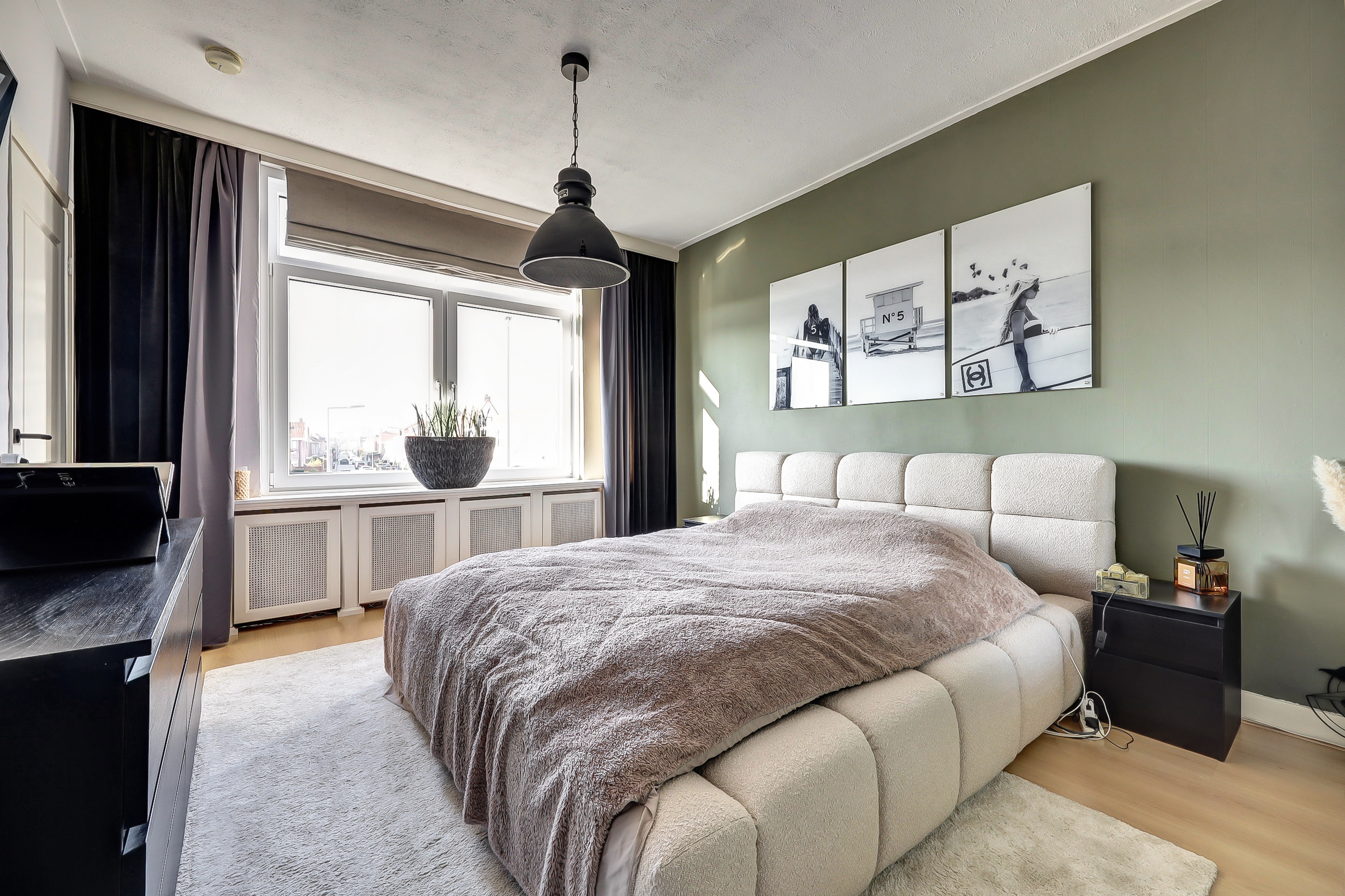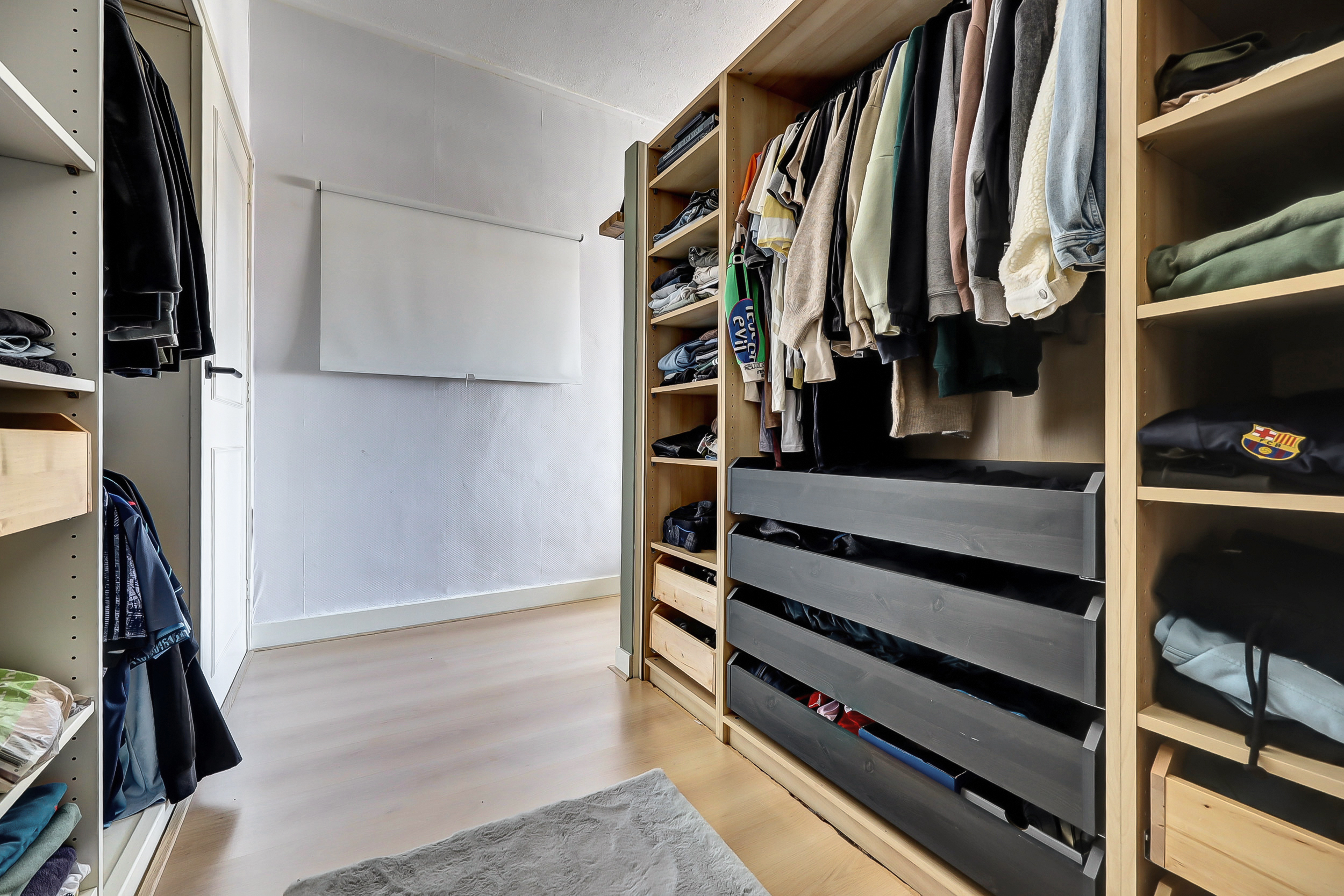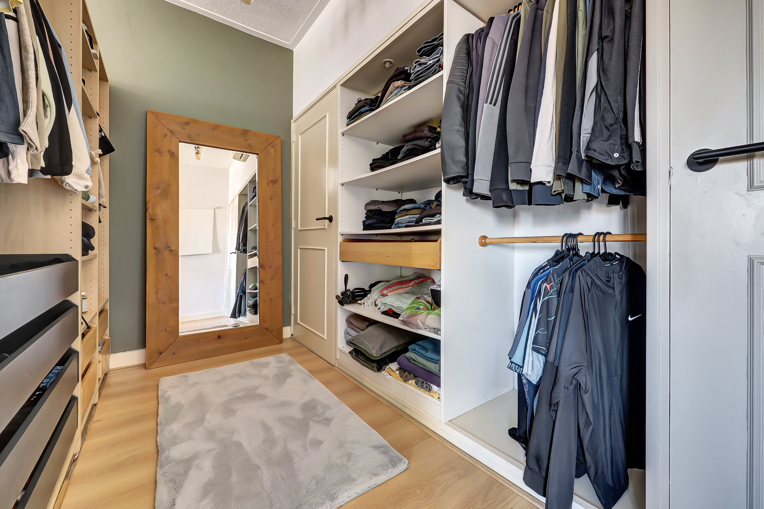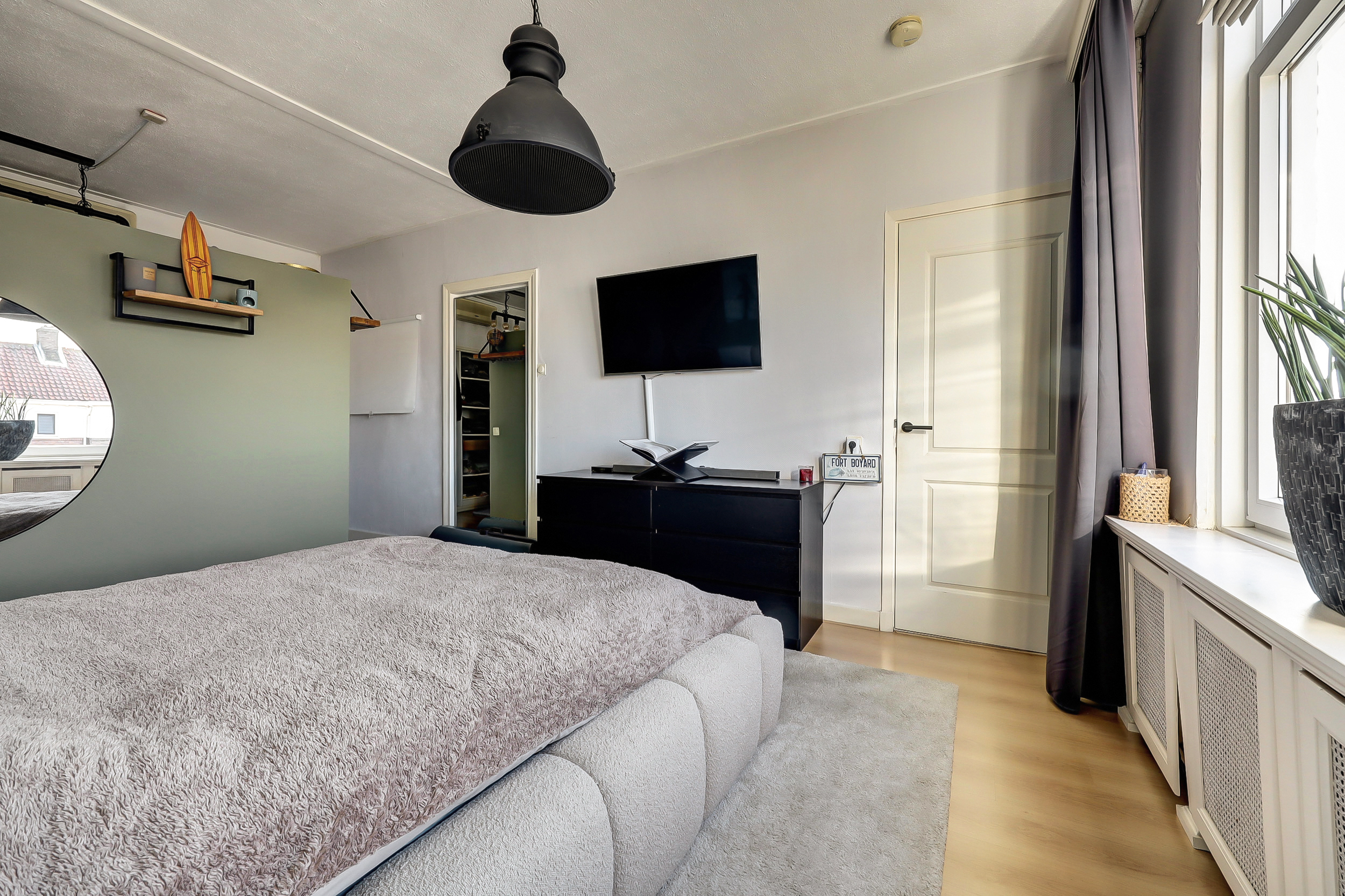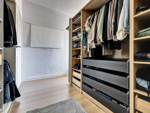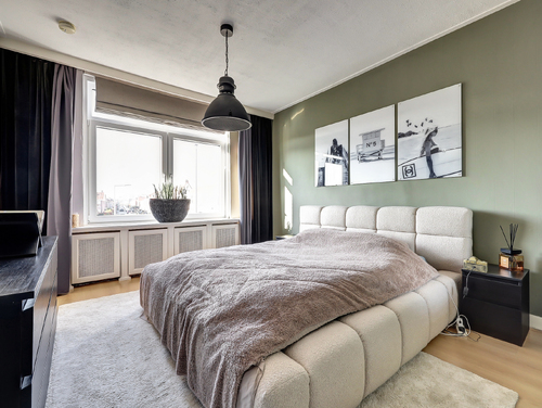De royale en bijzonder lichte ouderslaapkamer (ca. 3.30 x 7.00 m) biedt een fraai uitzicht op de Burgemeester van Esstraat en ademt luxe en comfort. Achter de stijlvolle scheidingswand bevindt zich een ruime inloopkast met een speels doorkijkje naar de badkamer. De kamer is bovendien uitgerust met airconditioning (Sharp). Direct aangrenzend vind je de tweede slaap-/hobbykamer (ca. 2.30 x 4.60 m), voorzien van een praktische kastenwand met schuifdeuren. Een perfecte ruimte voor een thuiswerkplek, hobbykamer of gezellige babykamer.