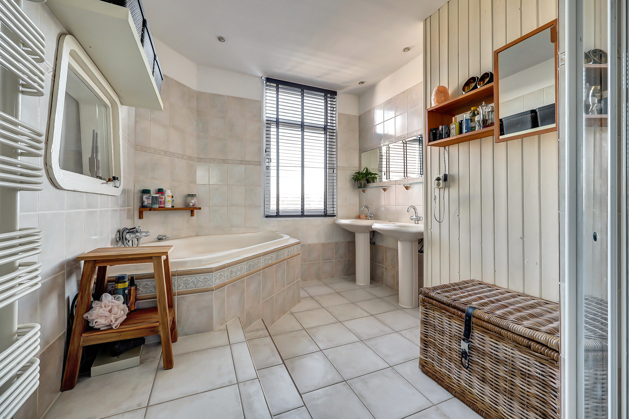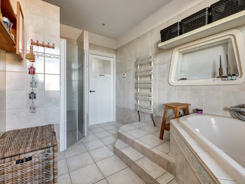 De riante badkamer (ca. 3.50 x 2.70 m) is afgewerkt met stijlvolle vloertegels en beschikt over elektrische vloerverwarming en een verwarmd handdoekenrek, zodat je altijd geniet van een aangename warmte. Verder is de badkamer uitgerust met een royaal hoekligbad, een ruime douchecabine en twee wastafels.