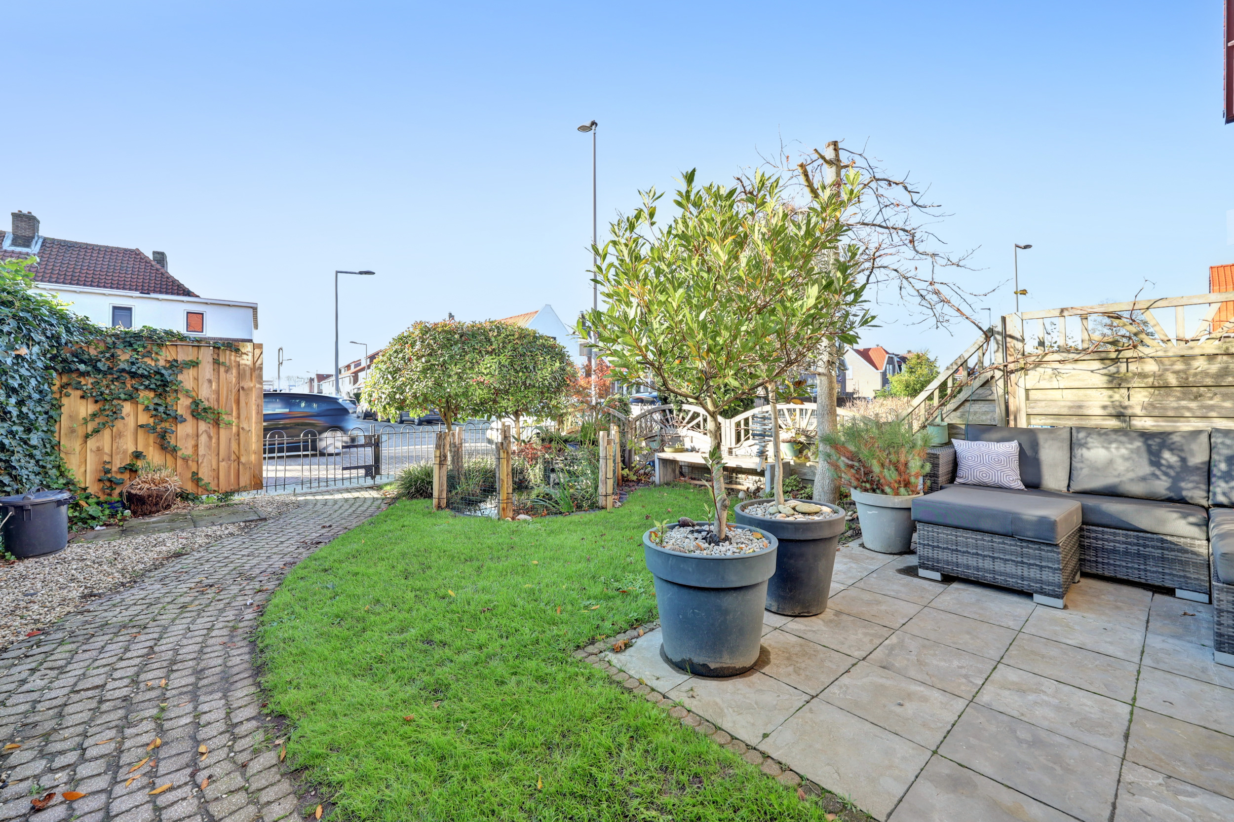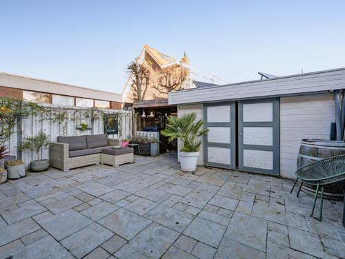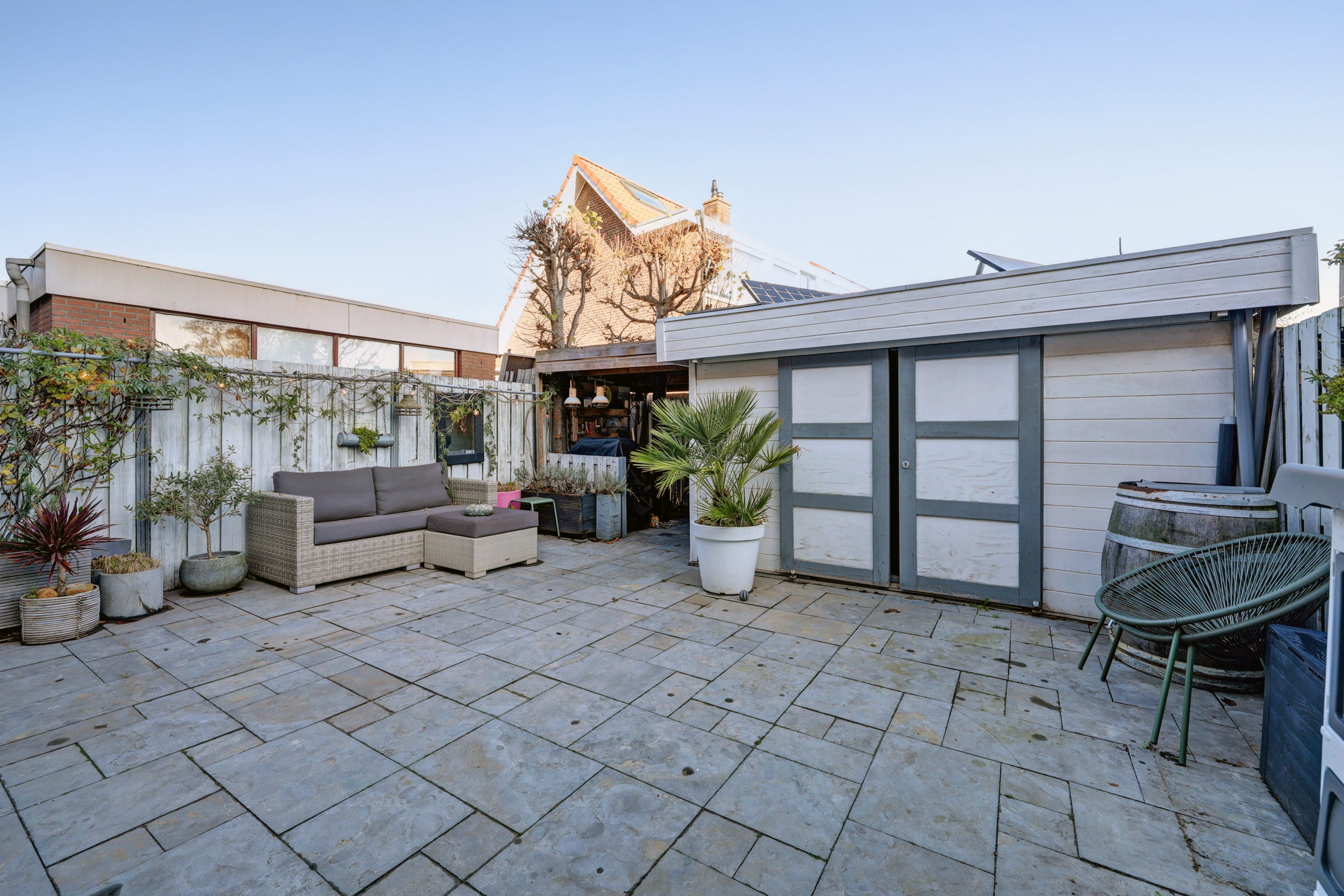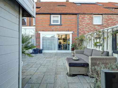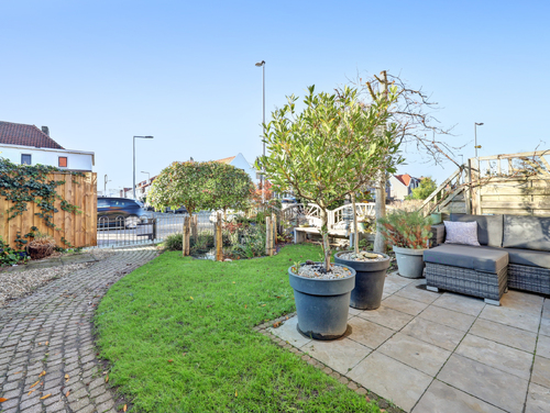 Deze woning beschikt over twee heerlijke, ruime tuinen. De diepe voortuin (ca. 9.50 m x 6.50 m) is sfeervol aangelegd met diverse beplanting, een zonnig terras, een vijver, zonwering en een verzorgd gazon. De achtertuin is praktisch én karaktervol ingericht. Hier vind je een vrijstaande houten berging met overkapping, voorzien van twee zonnepanelen en verlichting. De tuin is fraai afgewerkt met sierbestrating en beplanting, beschikt over een buitenkraan en is tevens achterom bereikbaar. Een fijne, onderhoudsvriendelijke buitenruimte met volop mogelijkheden.