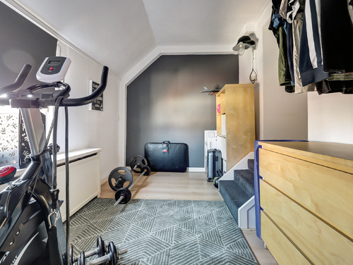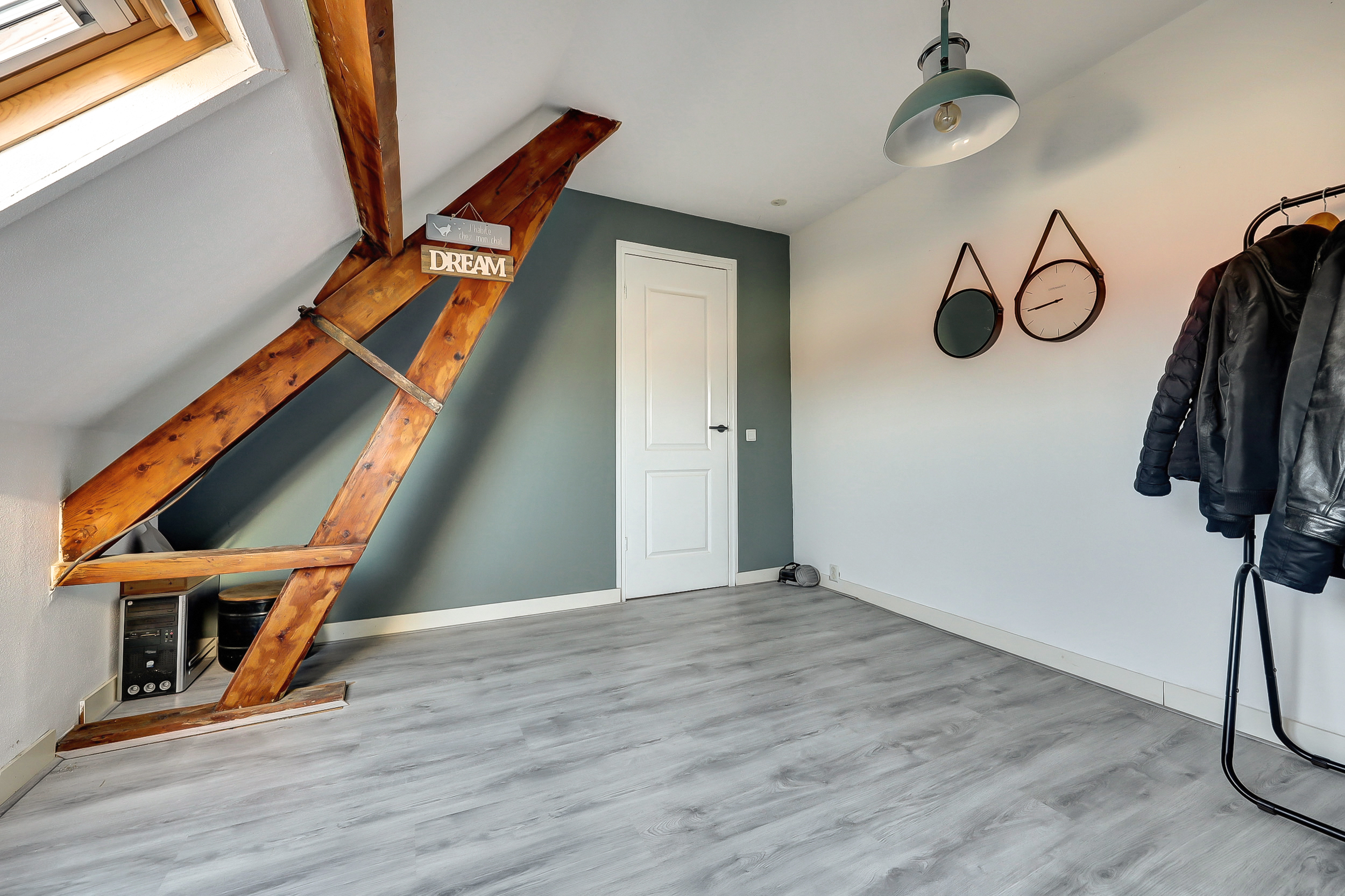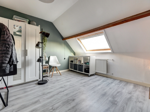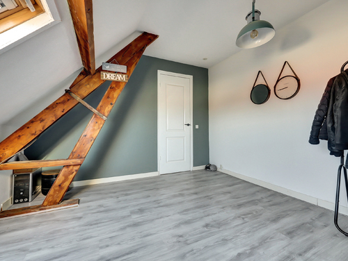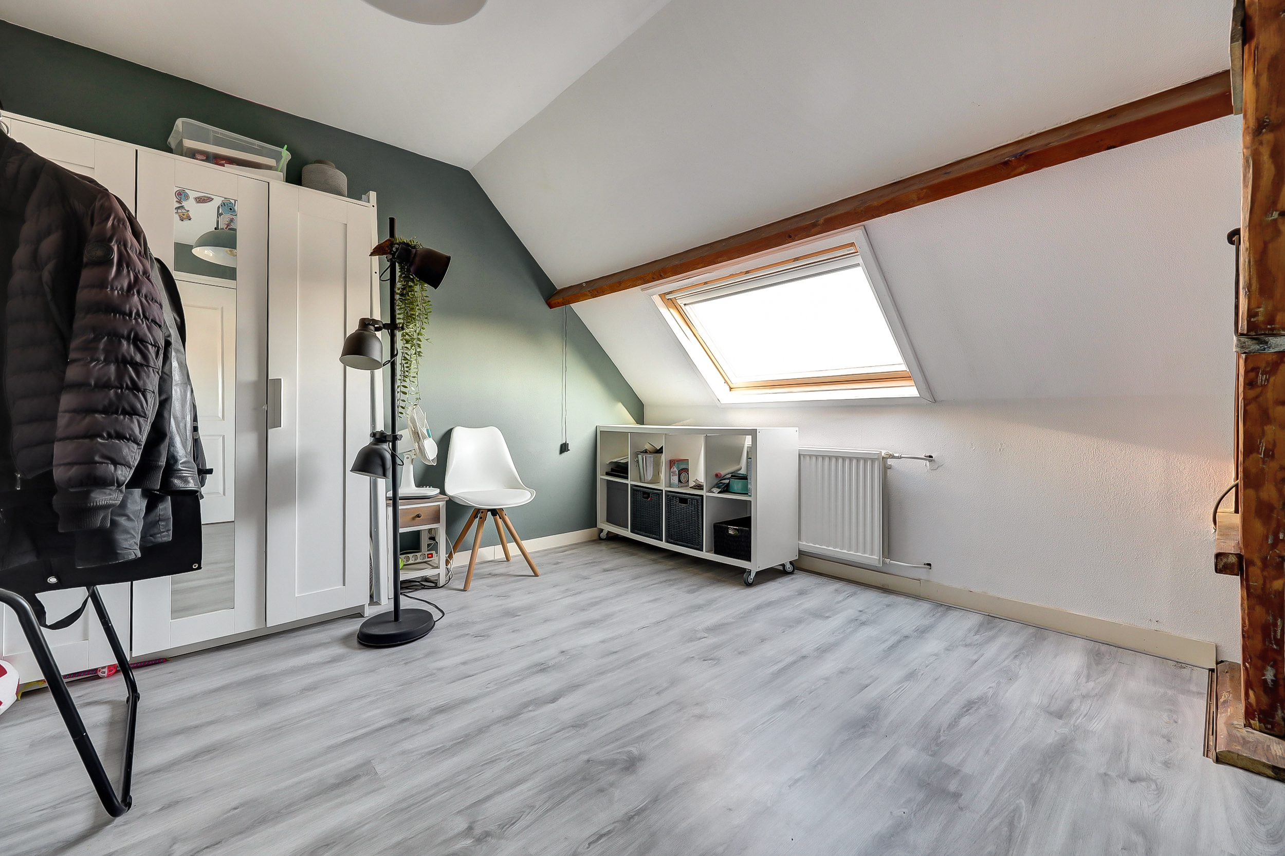 Deze schitterende, lichte slaapkamer (ca. 4.00 x 3.00 m) straalt direct warmte en karakter uit. De ruimte is voorzien van een laminaatvloer en een groot Velux-dakraam, waardoor er heerlijk veel daglicht binnenvalt. De authentieke houten balken zijn op stijlvolle wijze in het interieur verwerkt en geven de kamer een unieke, charmante uitstraling.
