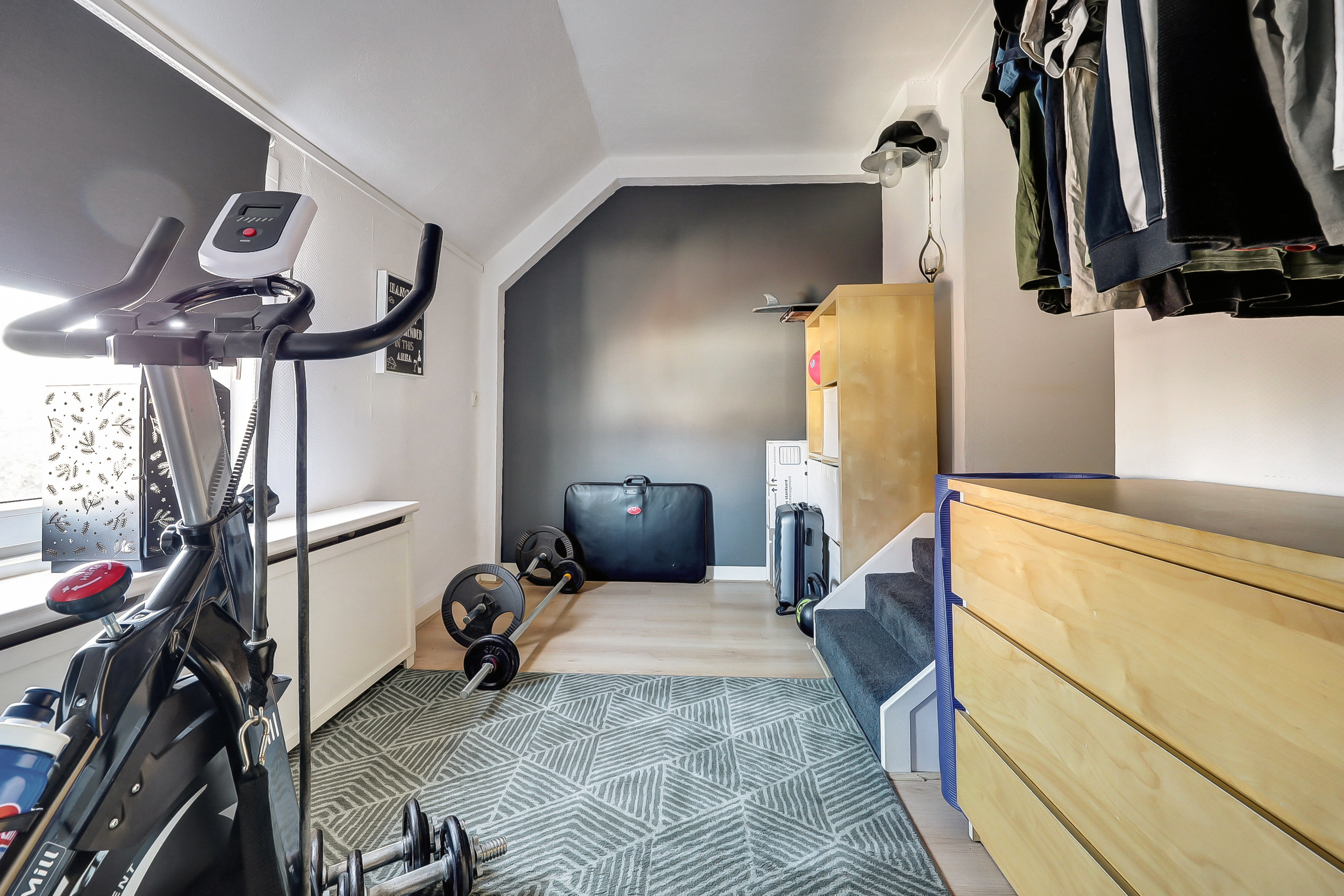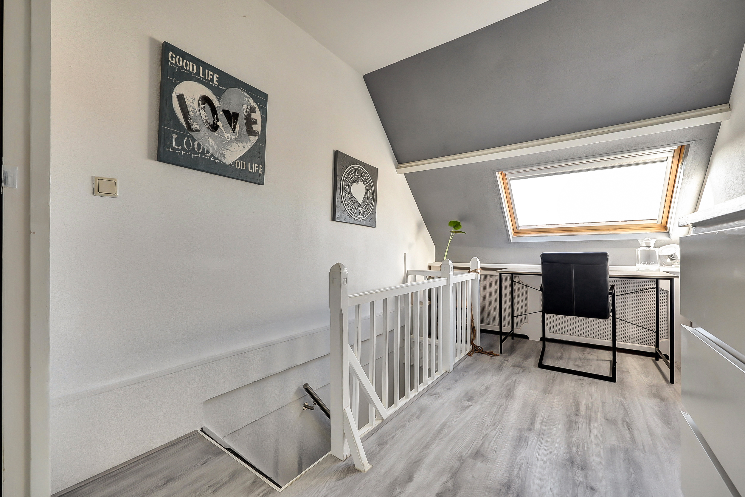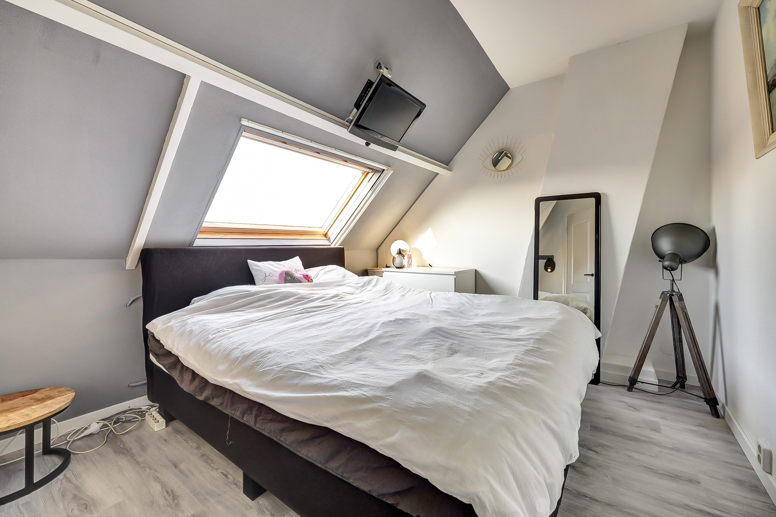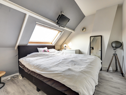 Ook deze ruime slaapkamer (ca. 4.00 x 3.50 m) is stijlvol afgewerkt met een laminaatvloer en beschikt over een groot Velux-dakraam, waardoor de kamer baadt in het natuurlijke licht. Een fijne, multifunctionele ruimte die geheel naar wens is in te richten.