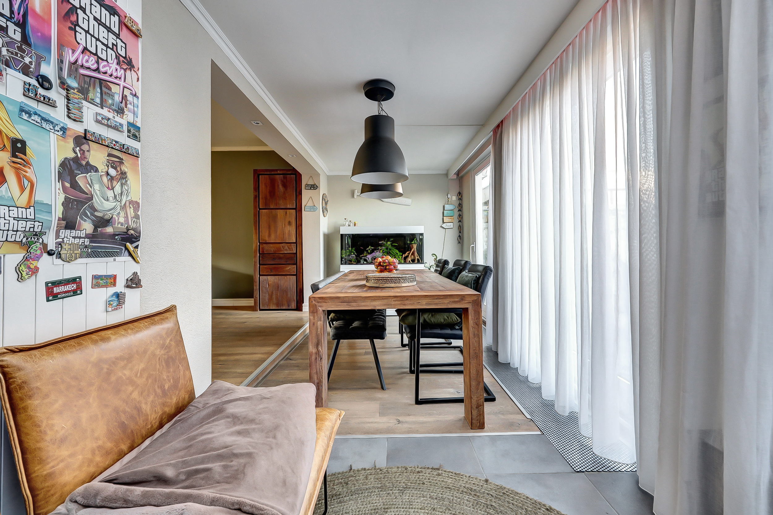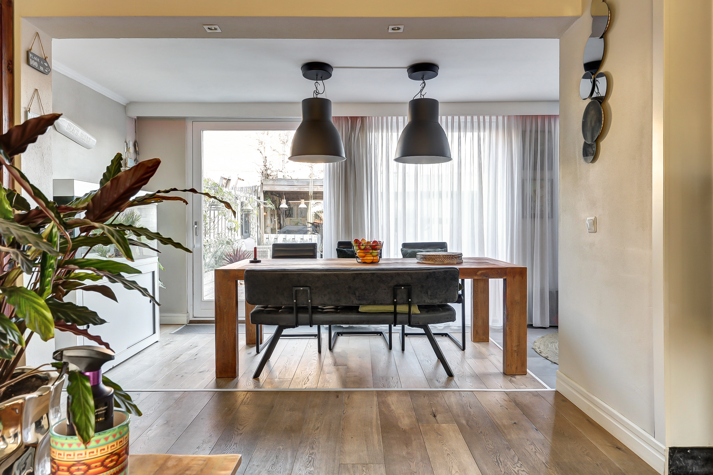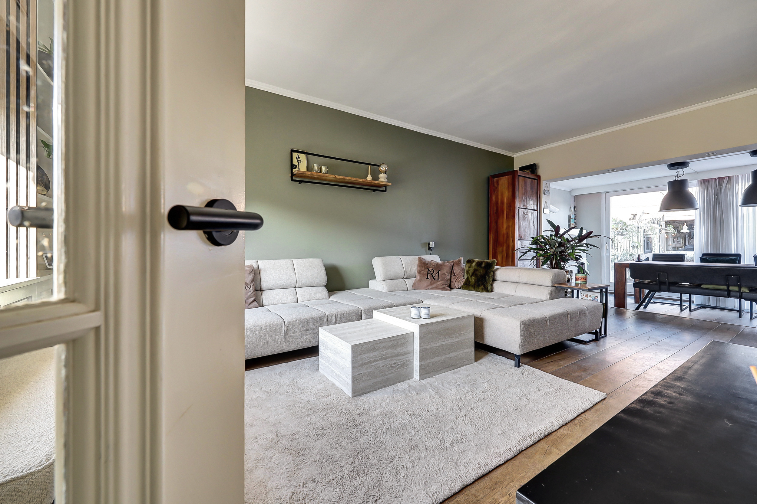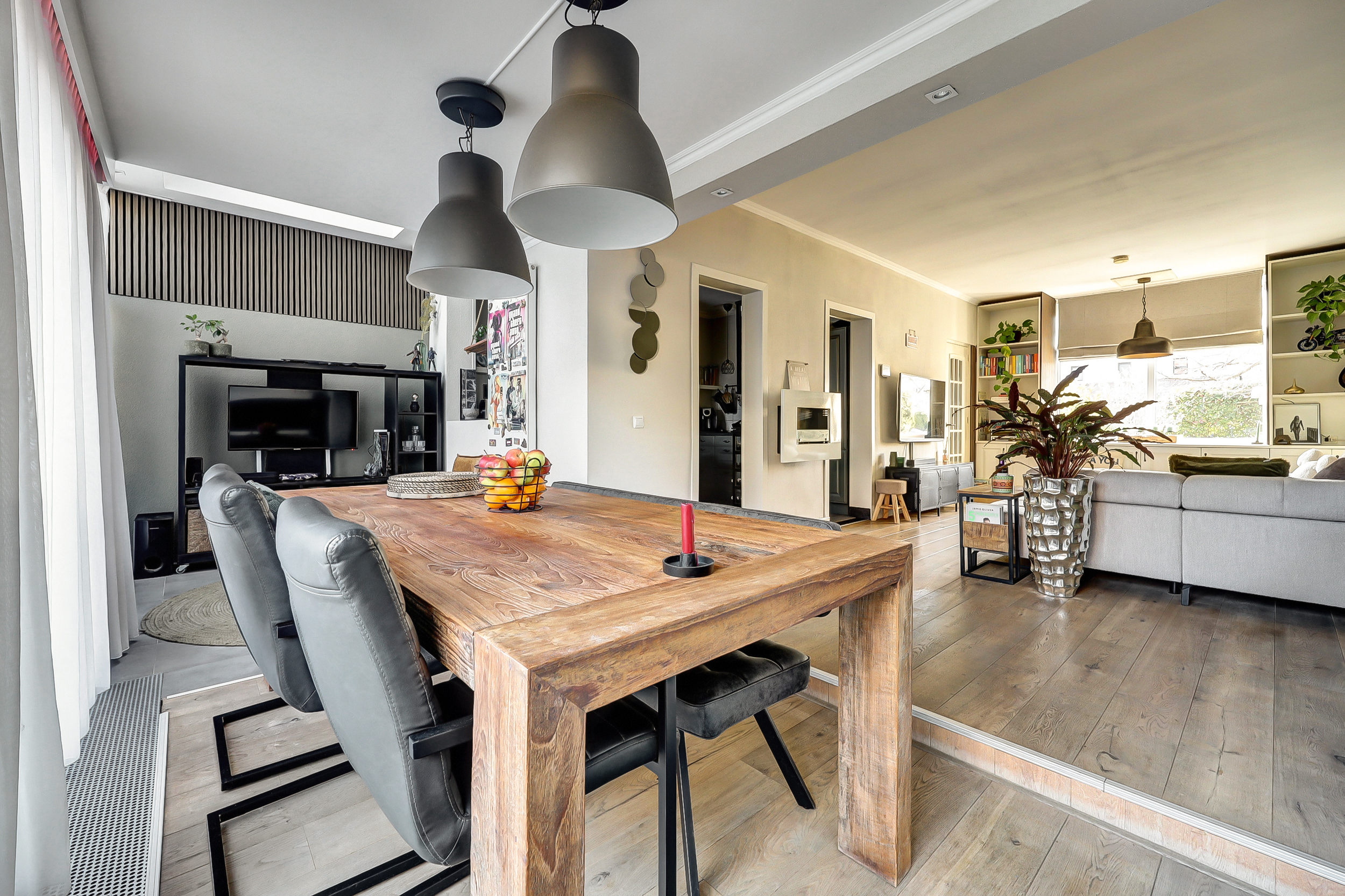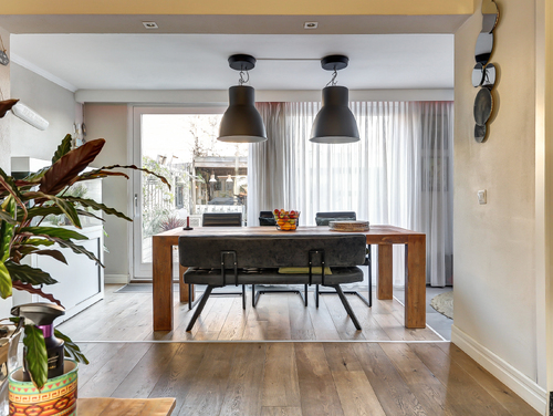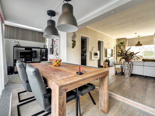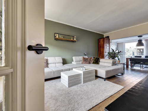 Stap binnen in een heerlijk lichte en royale woonkamer van ca. 35 m². Aan de voorzijde geven de grote ramen, omkaderd door een sfeervolle kamerkast, de ruimte karakter én een prachtige brede vensterbank. De warme eikenhouten vloer zorgt direct voor een uitnodigende sfeer. Aan de achterzijde opent de indrukwekkende glazen pui, over de volledige breedte van de woning, zich naar de tuin, waarbij de schuifpui het binnen- en buitenleven moeiteloos met elkaar verbindt. Grenzend aan de woonkamer vind je de fraaie aanbouw (ca. 2.90 m x 2.50 m) met dakkoepel en convectorput. Dankzij het vele glas geniet je hier de hele dag door van een schitterende lichtinval, waardoor deze ruimte ideaal is als werkplek, leeshoek of speelkamer.