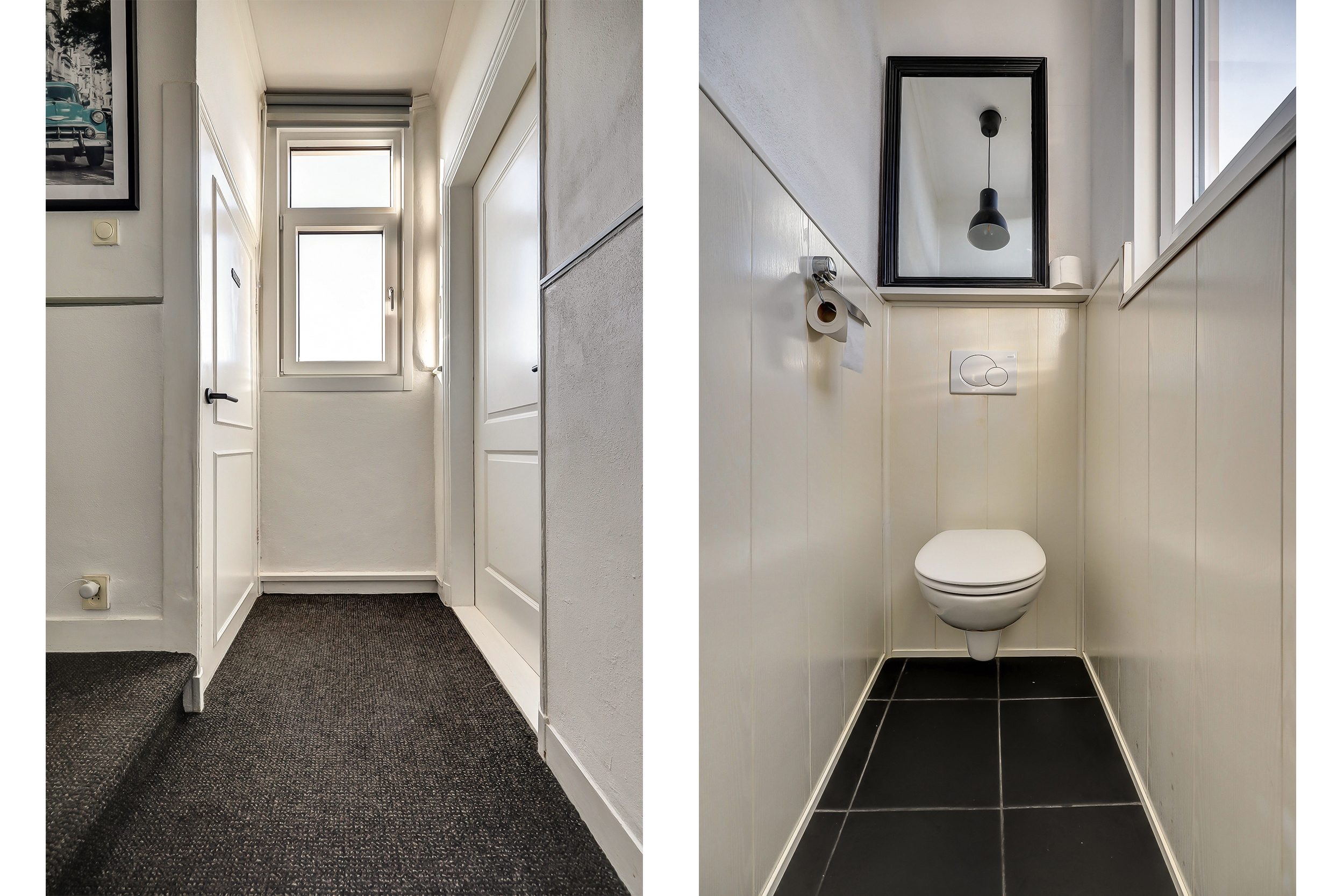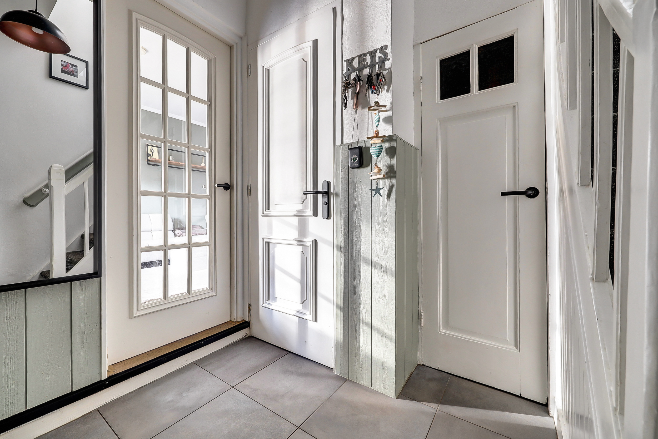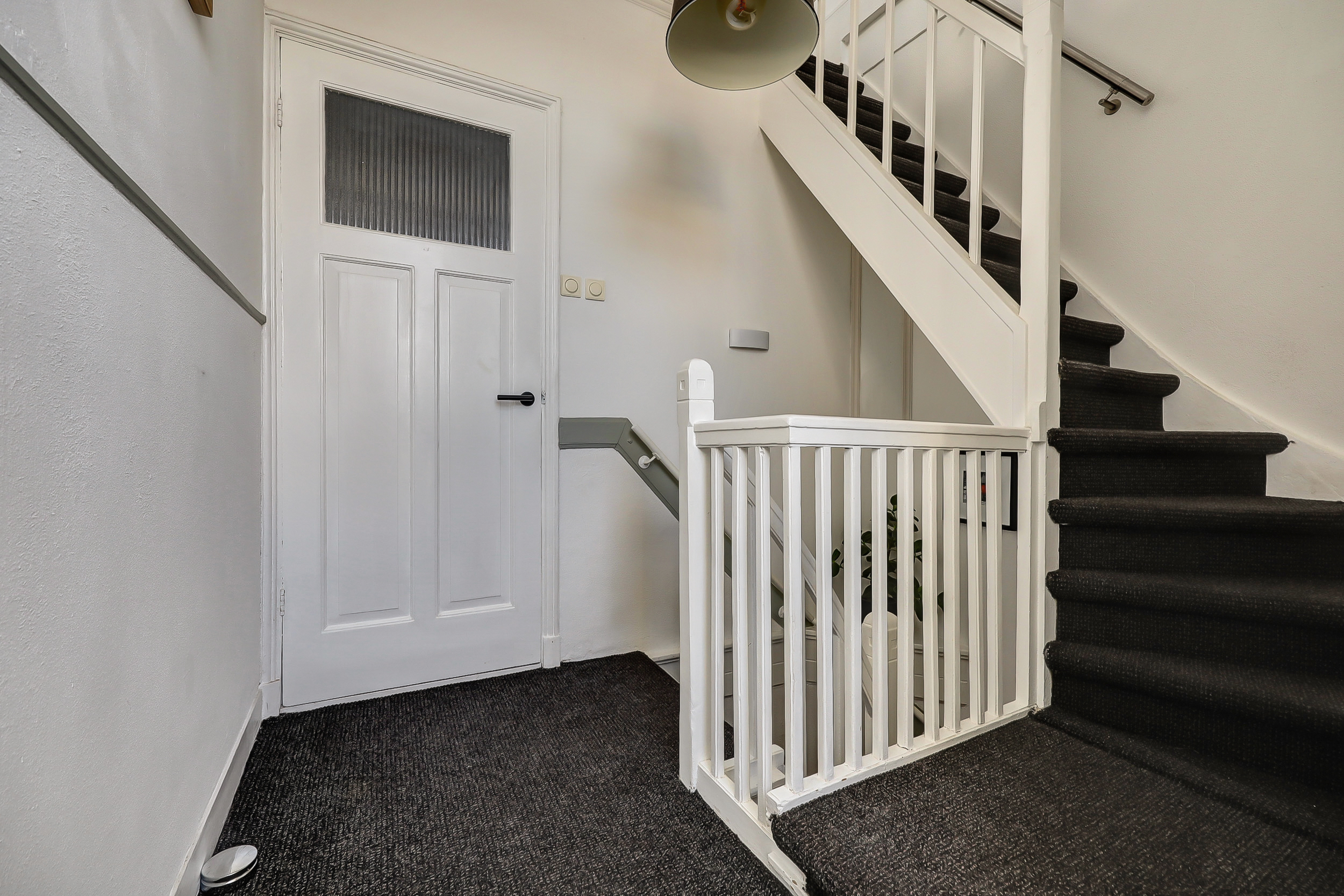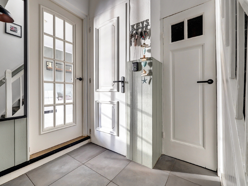 Hal/entree met plavuizenvloer, trapopgang, garderoberuimte, toilet met zwevend closet en een handige voorraadkast waarin de elektrische installatie is weggewerkt (10 groepen).