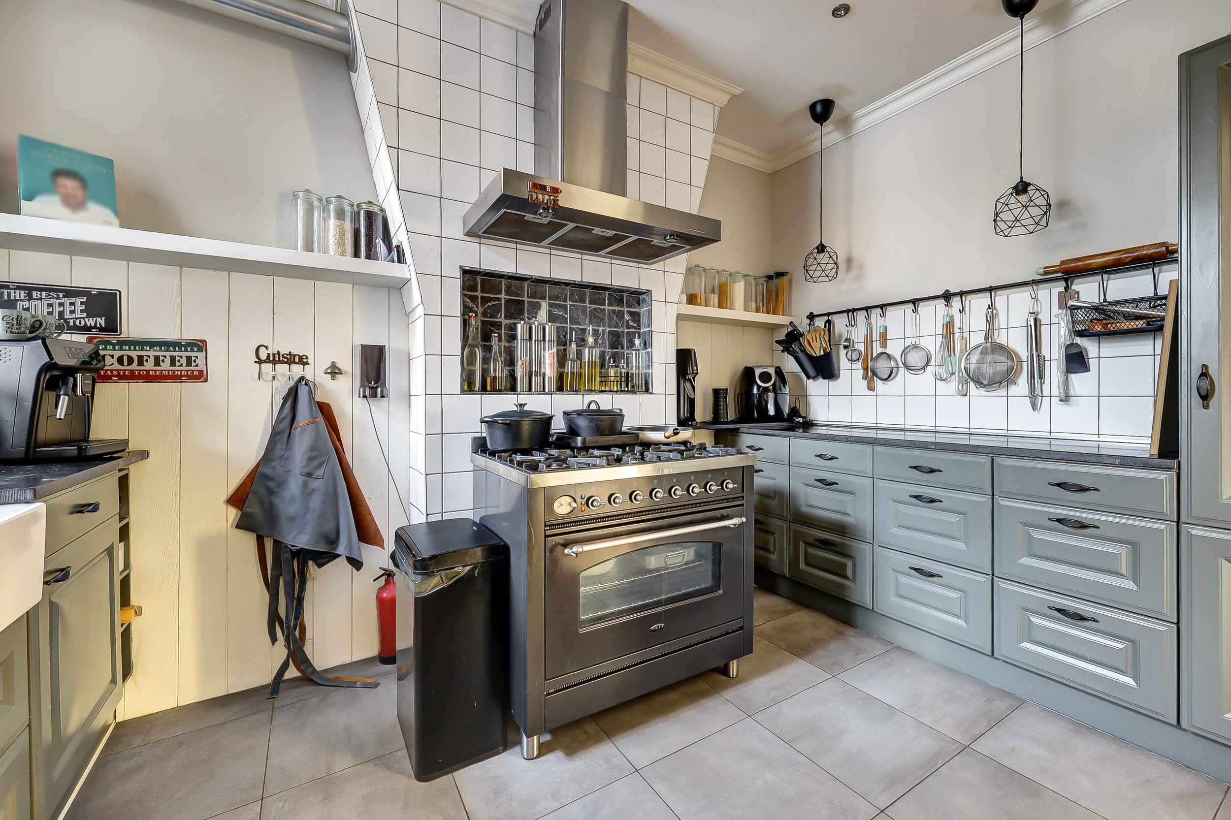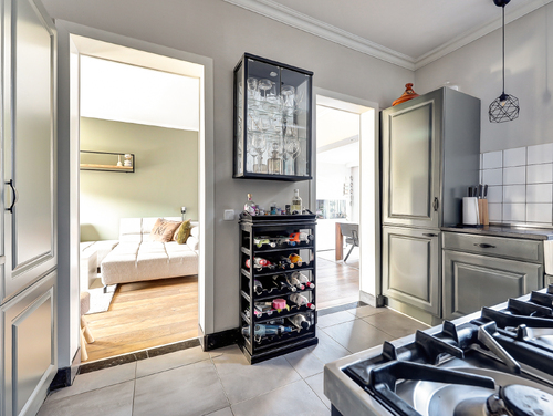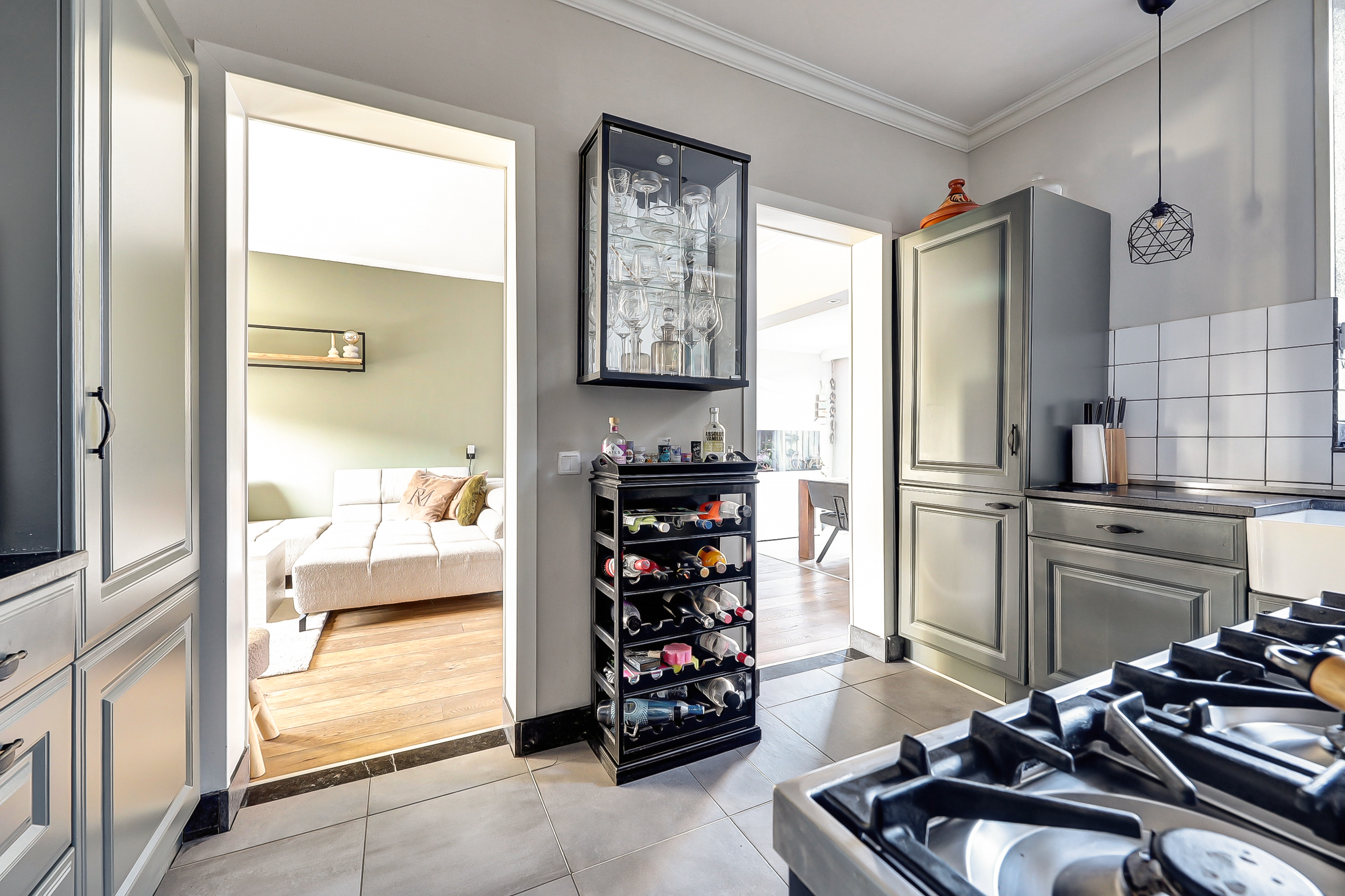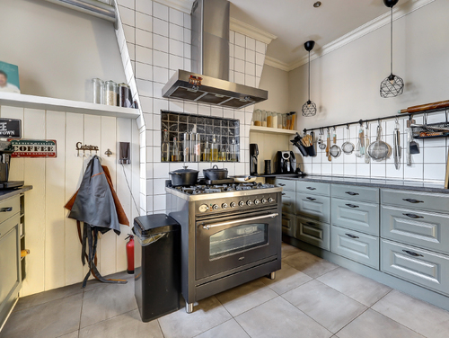 In het hart van de woning ligt de halfopen keuken (ca. 3.50 x 2.70 m), een heerlijke plek waar koken en samenzijn perfect samenkomen. De U-vormige opstelling is een echte eyecatcher, met een 6-pits "Boretti" kookunit met oven/grill, rvs-afzuigschouw en alle gewenste inbouwapparatuur. Het luxe granieten werkblad, de brede lades en de onderhoudsvriendelijke plavuizenvloer maken de keuken compleet: stijlvol, praktisch én klaar voor elke culinaire uitdaging.