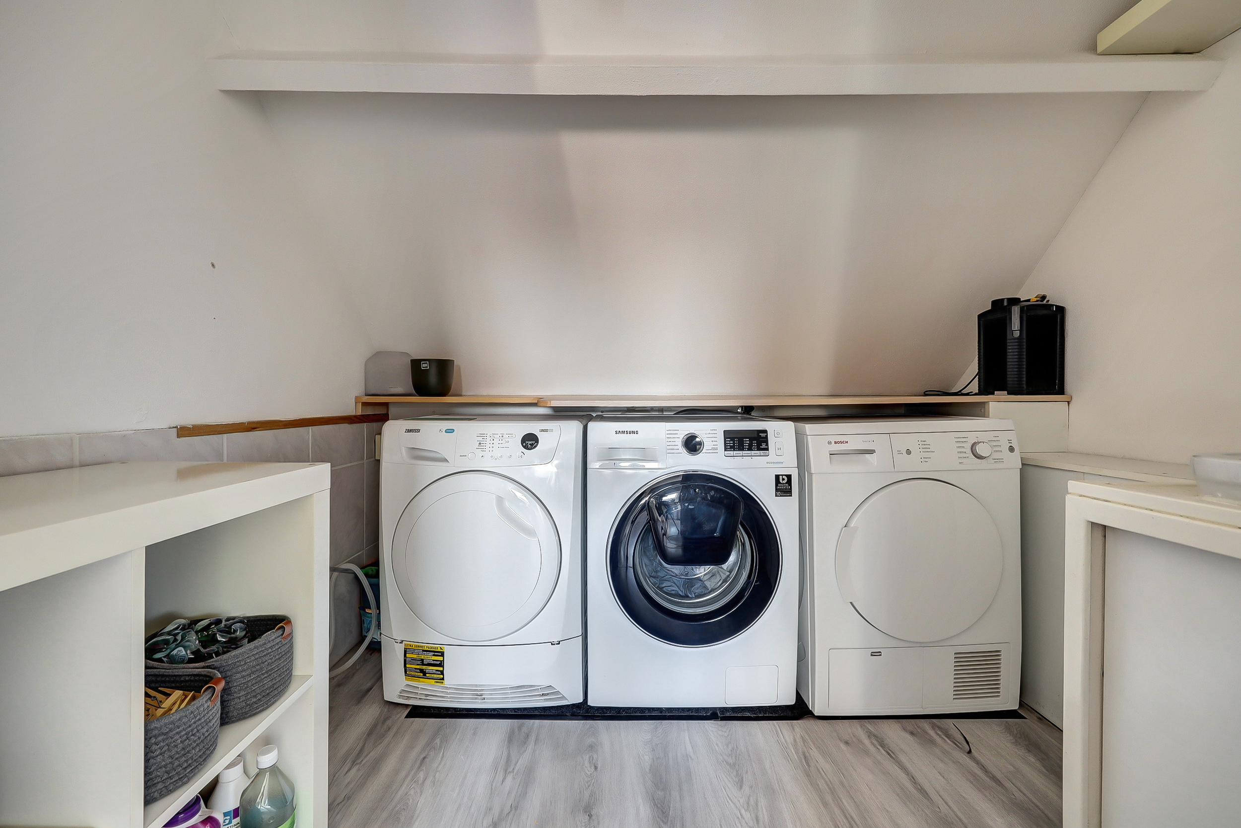 De tweede verdieping biedt verrassend veel ruimte. De grote, lichte overloop is voorzien van een moderne laminaatvloer en een royaal Velux-dakraam, waardoor de etage een frisse en open uitstraling krijgt. Vanuit de overloop bereik je twee ruime slaapkamers, een praktische cv-kast met de Remeha/Avanta Ace 35C-combiketel (2025, huur) en een ruime bergzolder voor extra opbergruimte. Daarnaast is er een aparte, volledig ingerichte wasruimte met aansluitingen voor wasmachine en droger én een handige wastafel met warm- en koudwateraansluiting.