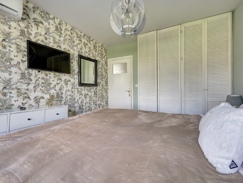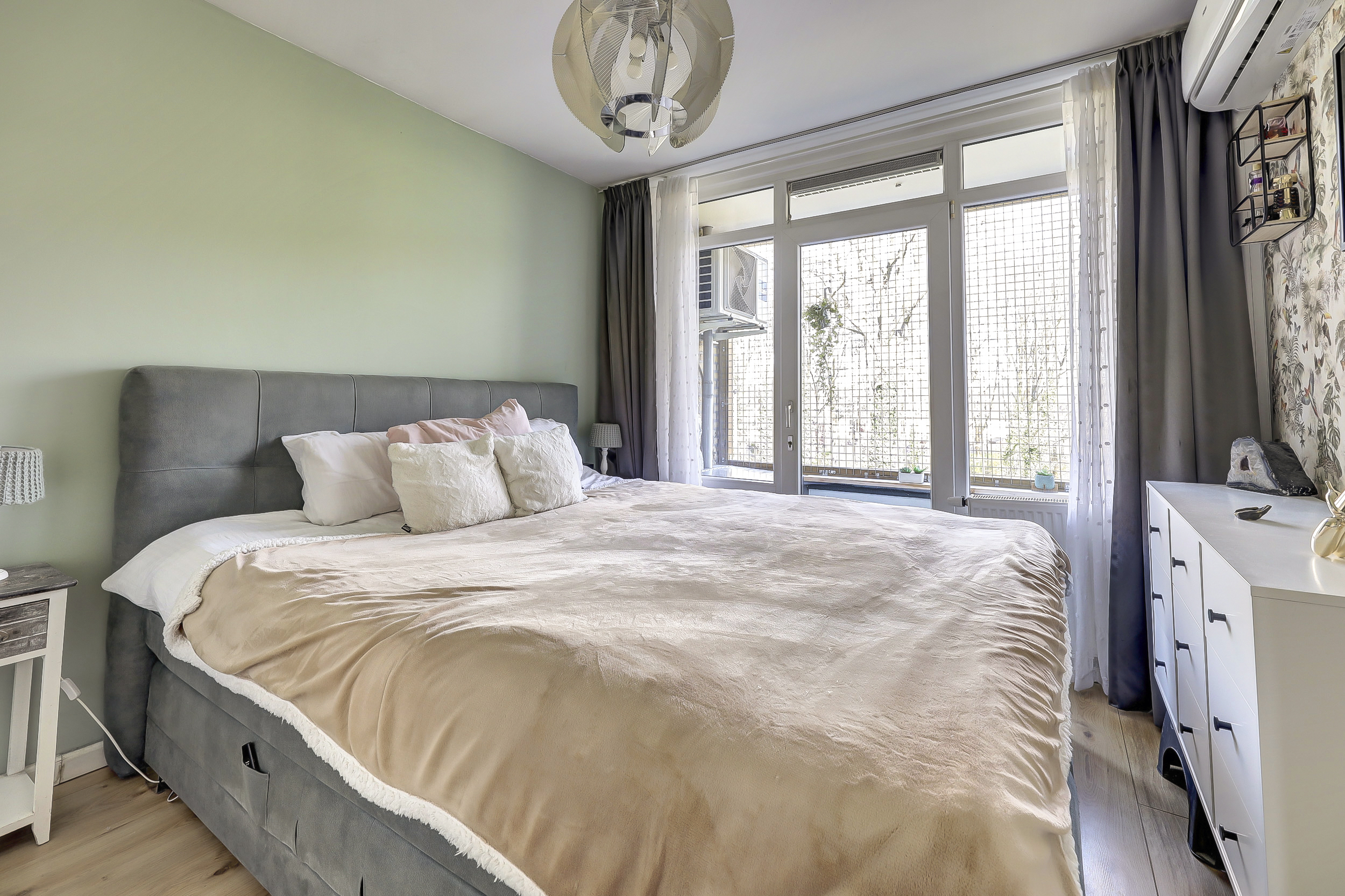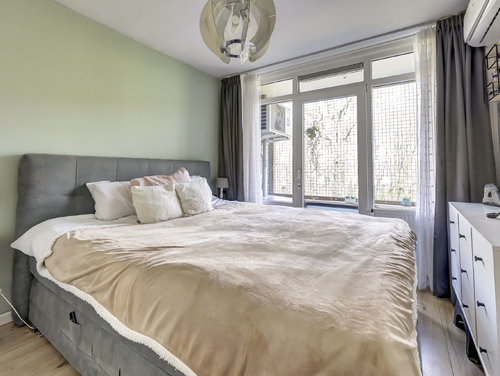 De ouderslaapkamer (ca. 10 m²) heeft toegang tot het aangrenzende balkon en beschikt over airconditioning, een laminaatvloer en vaste kasten.