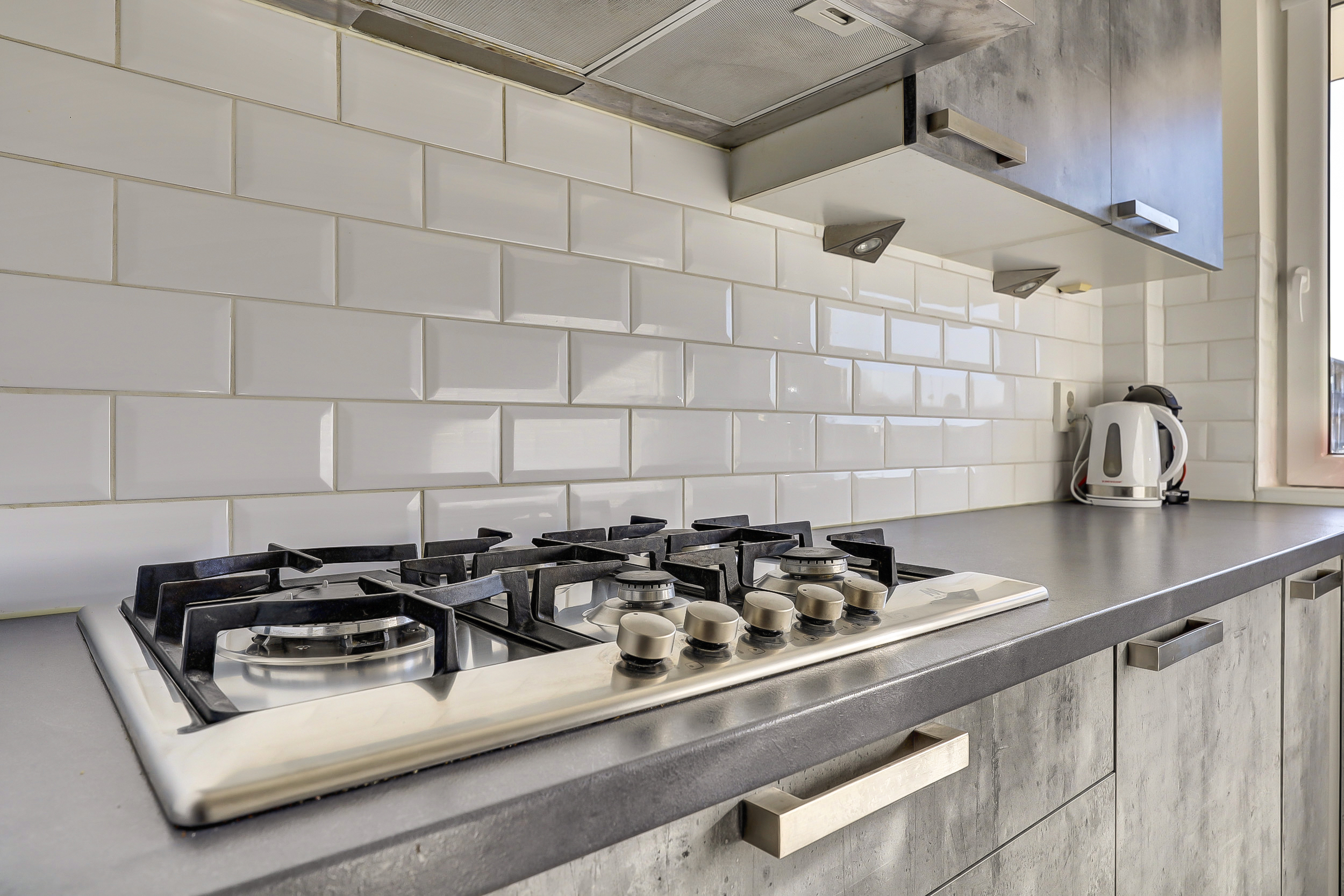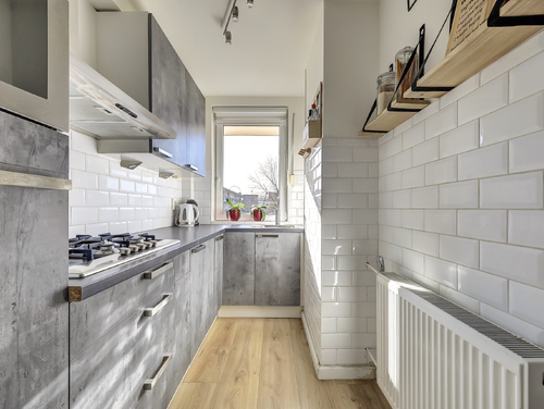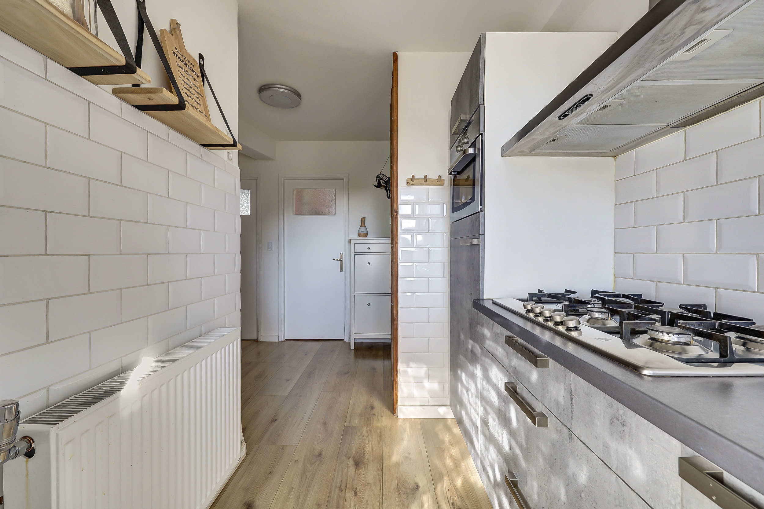Bij binnenkomst in de hal tref je de meterkast (5 groepen/slimme meters), een intercom, garderoberuimte, een laminaatvloer en de open keuken (ca. 6 m²) met een moderne L-vormige keukeninrichting met 5-pits gaskookplaat, een rvs afzuigschouw, combimagnetron, koelkast en diverse boven- en onderkastjes. Tevens tref je hier netjes weggewerkt de cv combiketel (type Intergas hre, bouwjaar 2020).