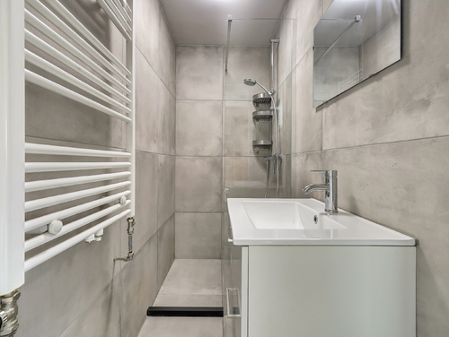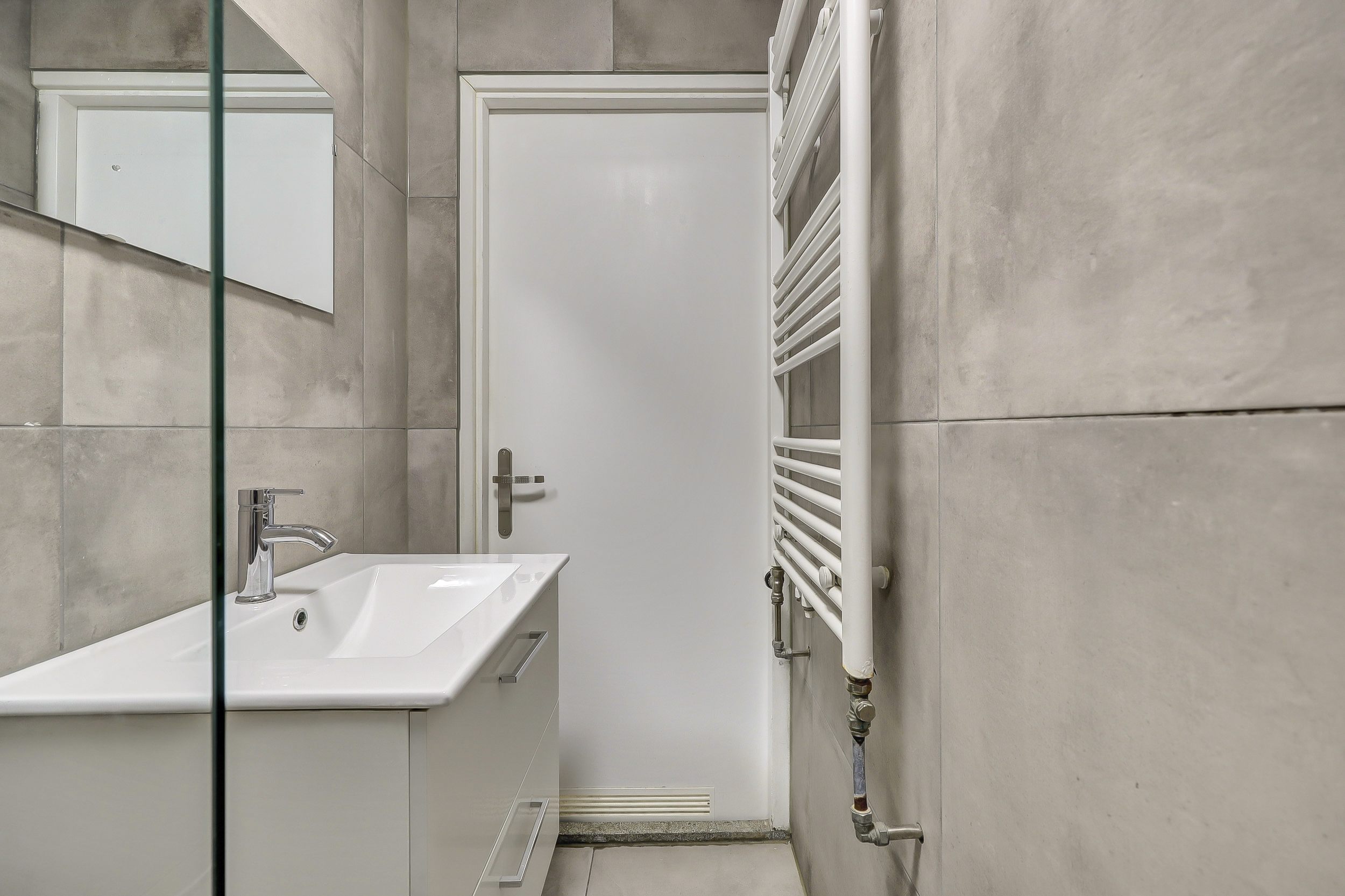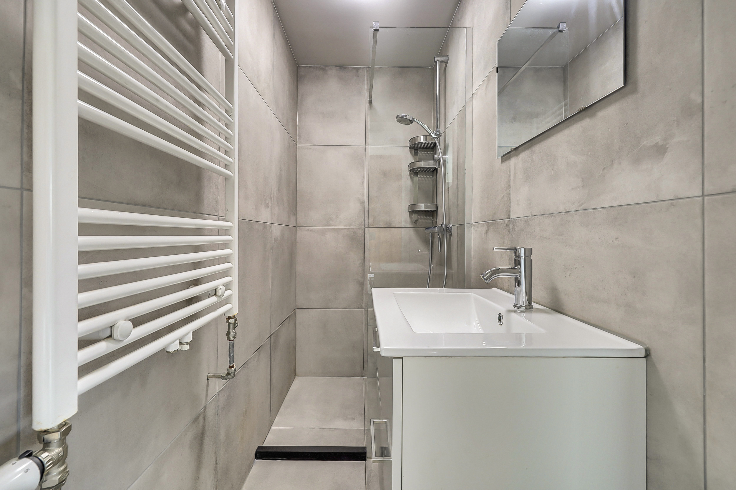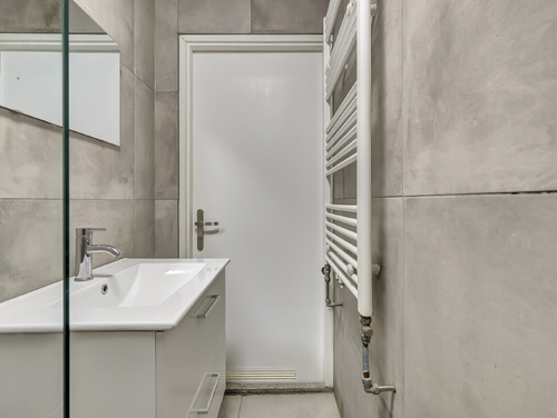 De compacte (ca. 2 m²) in 2020 gemoderniseerde badkamer is geheel betegeld en uitgerust met een design radiator, mechanische ventilatie, wastafel met meubel en een inloopdouche.