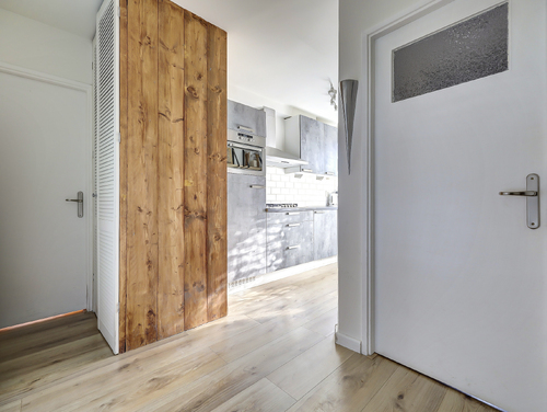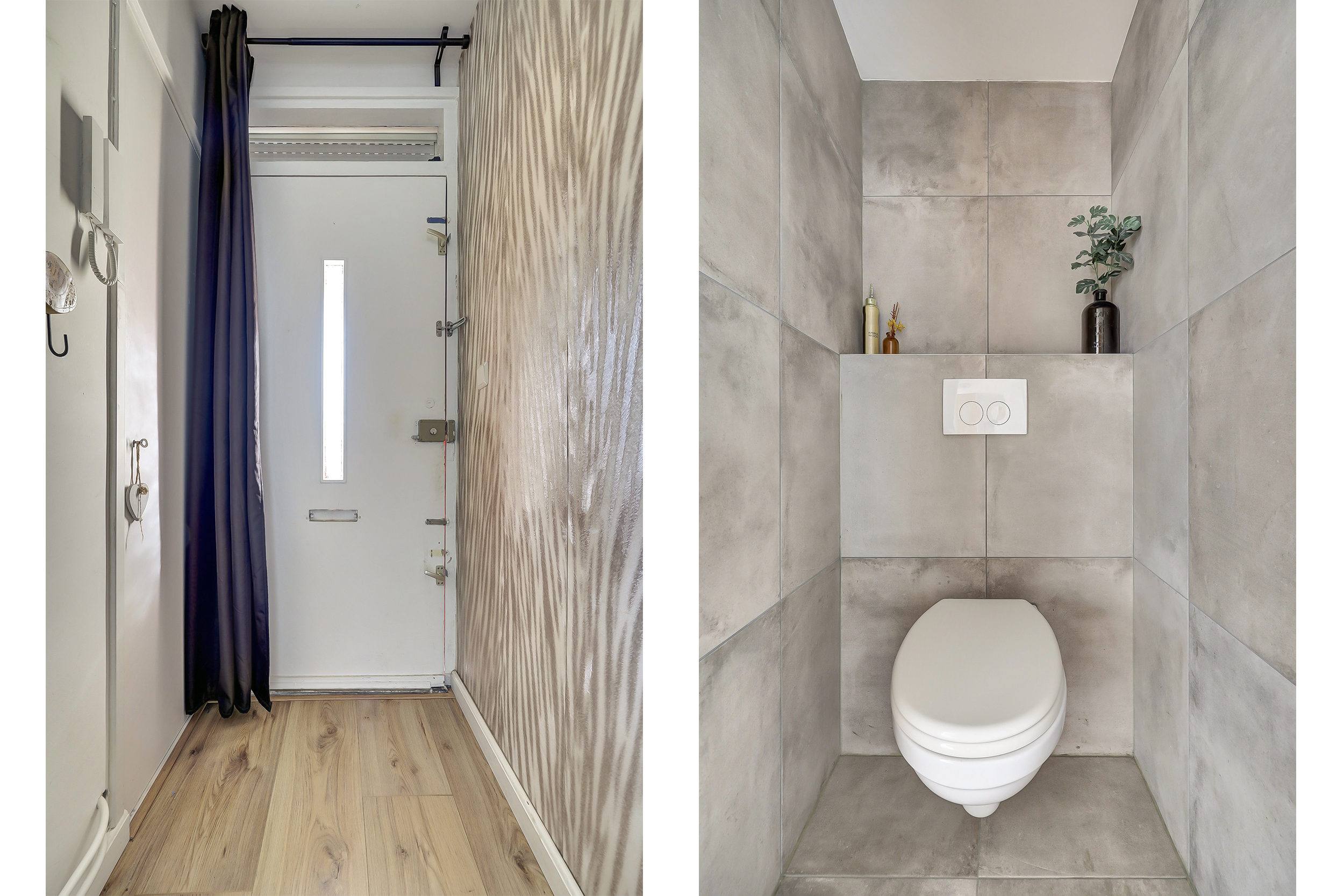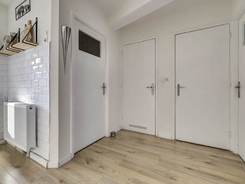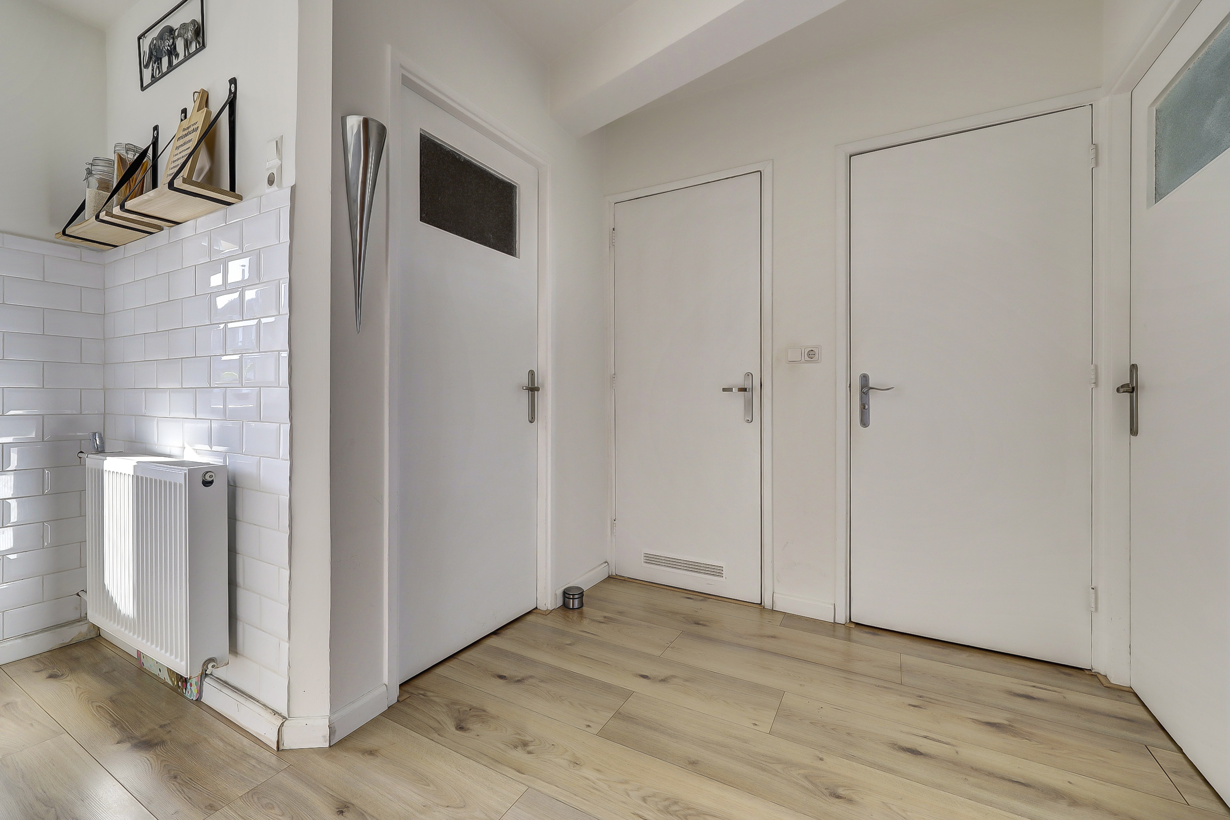 Het tussenportaal verbindt alle vertrekken en is voorzien van een laminaatvloer. Vanuit hier zijn het moderne toilet met zwevend closet, de witgoedkast (wasmachine/droger), de slaapkamers en de badkamer bereikbaar.
