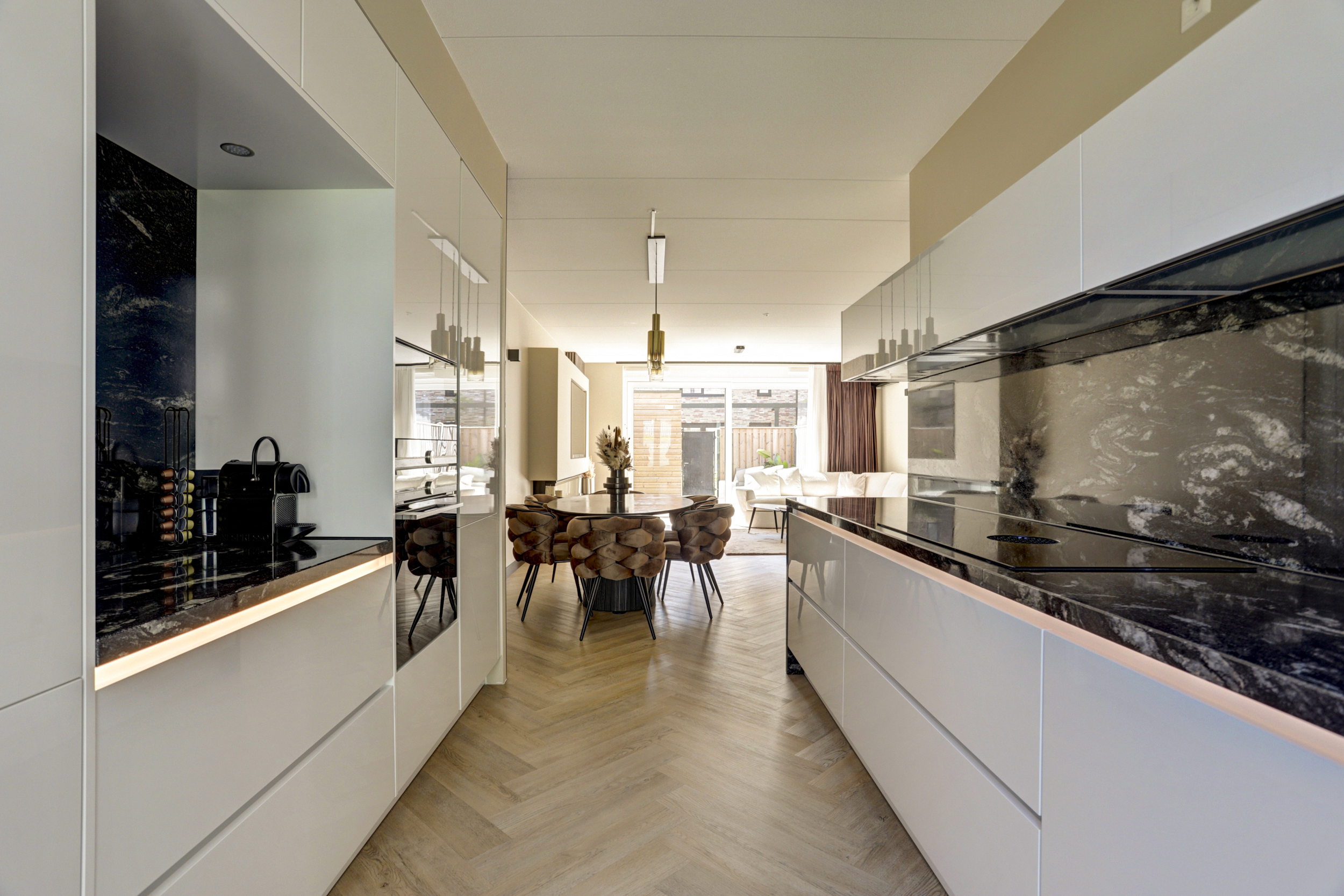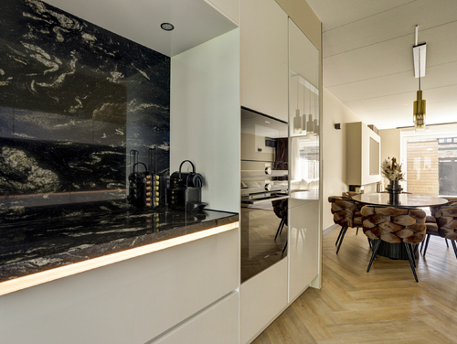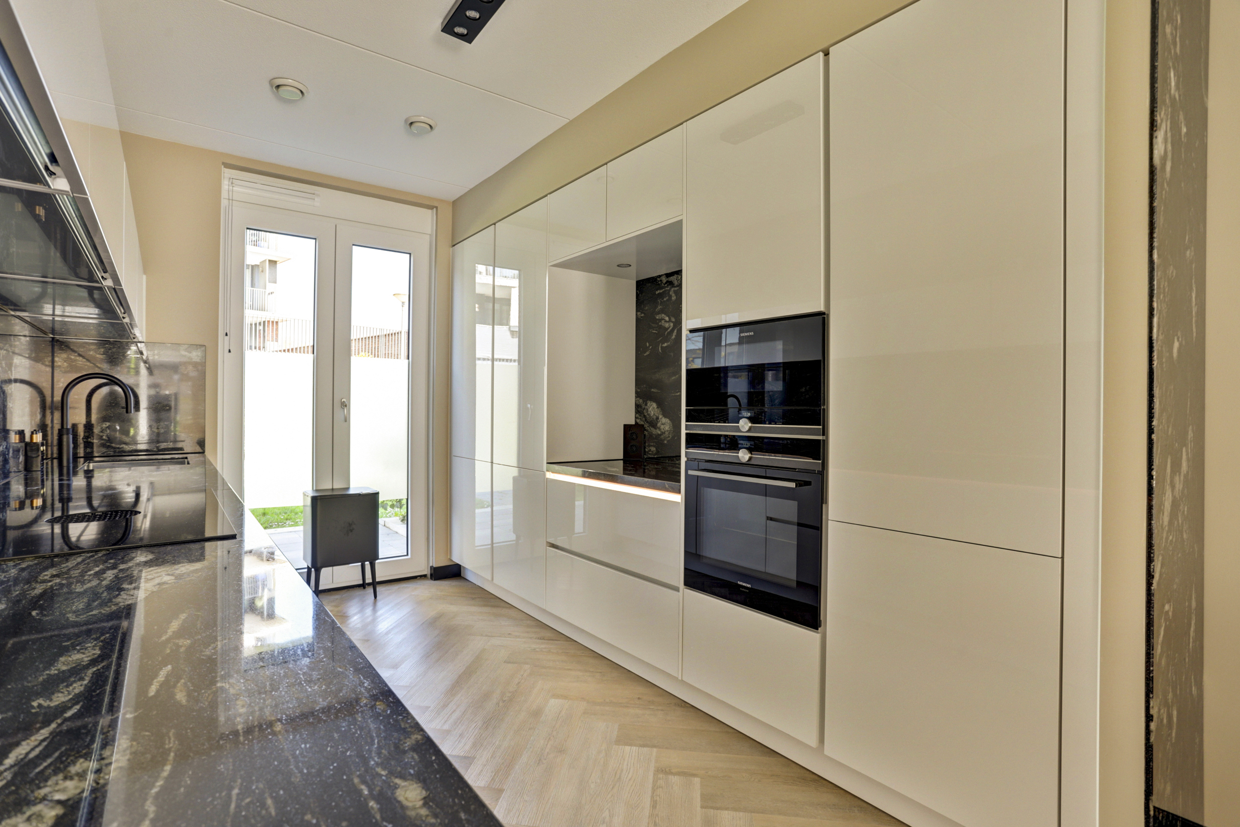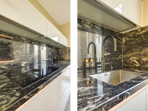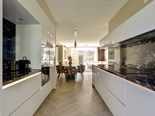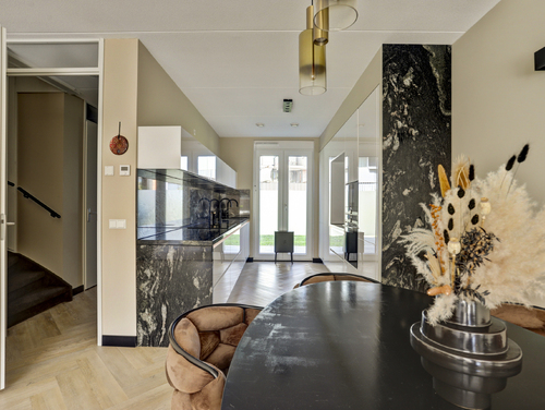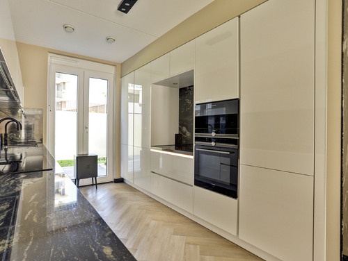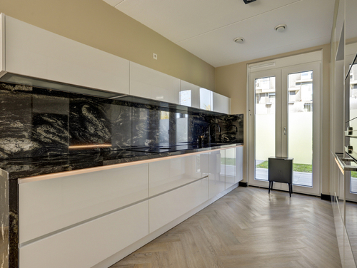 De super luxe open keuken (ca. 10 m²) is uitgerust met een moderne inrichting, gecombineerd met een natuurstenen bovenblad en diverse ingebouwde apparatuur zoals een grote koelkast, grote vriezer, "Bora" kookplaat met geïntegreerde afzuiging, magnetron, oven, vaatwasser en een "Quooker Cube" (heetwater & bruisend water). De vloer en wandafwerking van de woonkamer lopen vloeiend over in de keuken en vormen een bijpassend geheel.