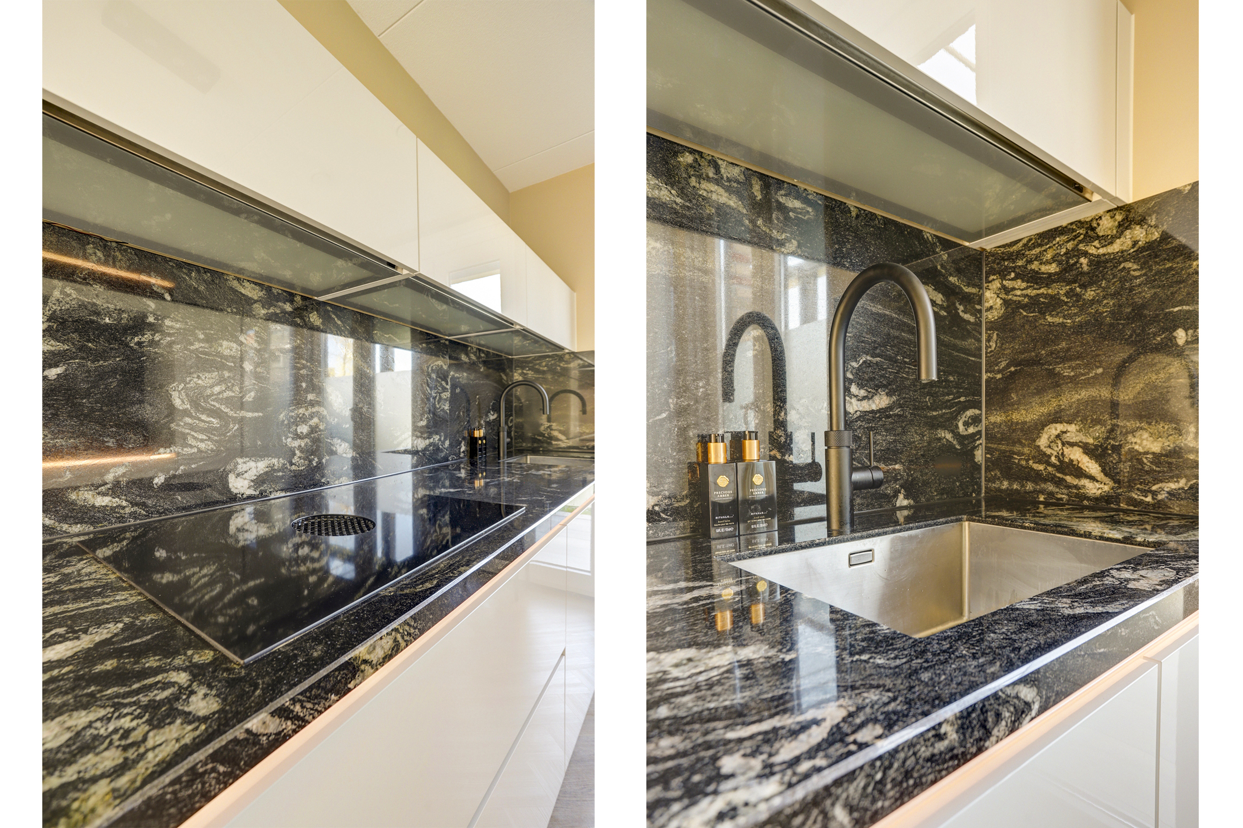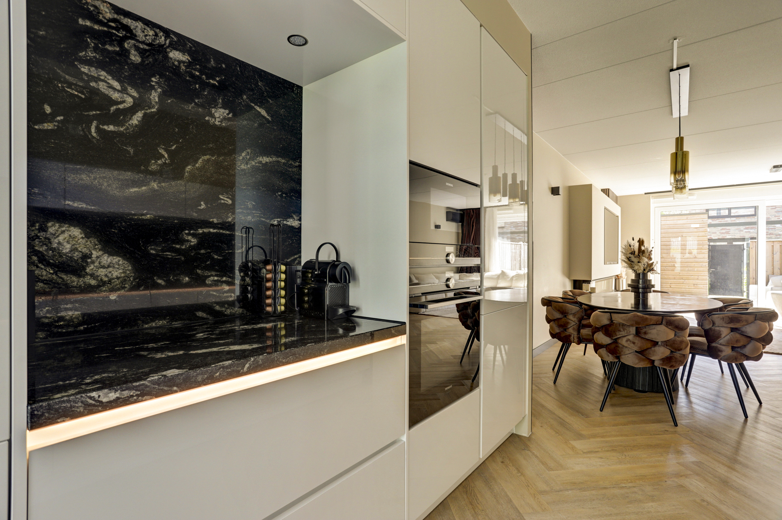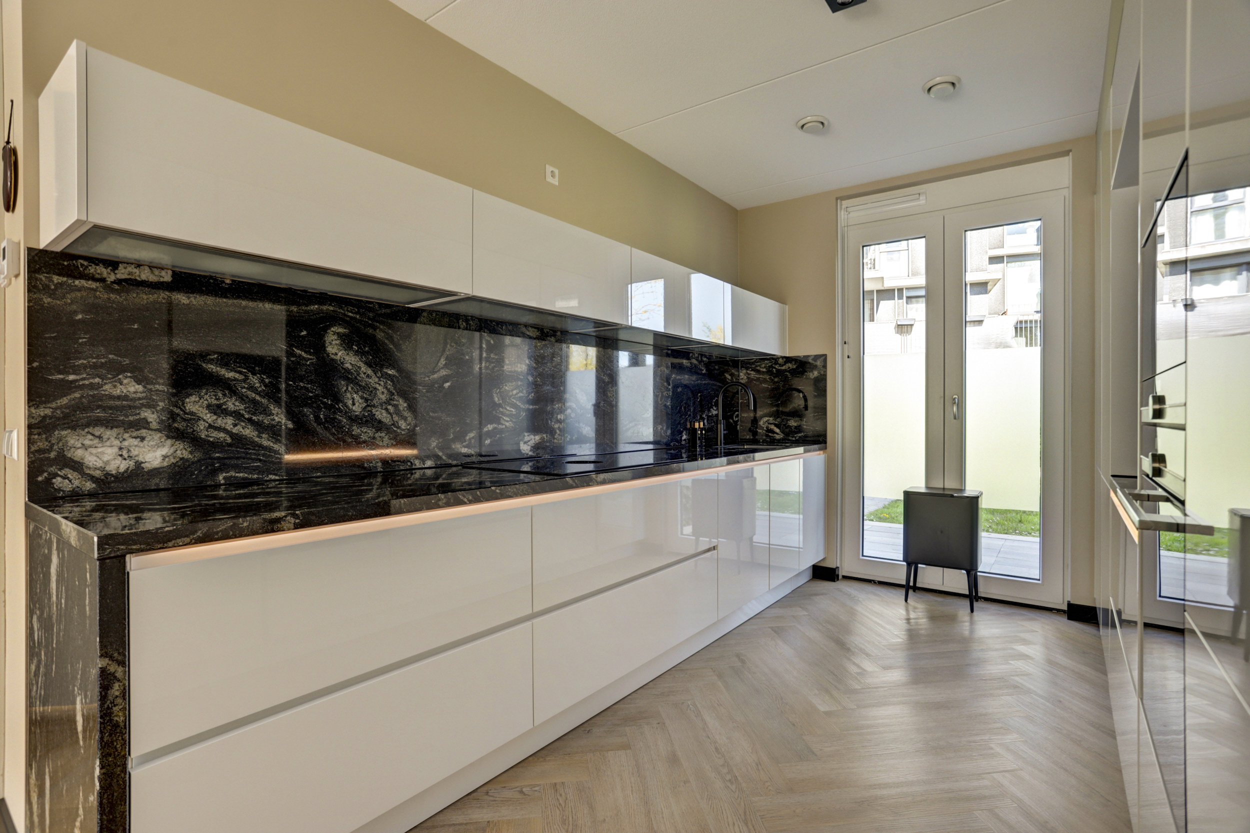 De super luxe open keuken (ca. 10 m²) is uitgerust met een moderne inrichting, gecombineerd met een natuurstenen bovenblad en diverse ingebouwde apparatuur zoals een grote koelkast, grote vriezer, "Bora" kookplaat met geïntegreerde afzuiging, magnetron, oven, vaatwasser en een "Quooker Cube" (heetwater & bruisend water). De vloer en wandafwerking van de woonkamer lopen vloeiend over in de keuken en vormen een bijpassend geheel.