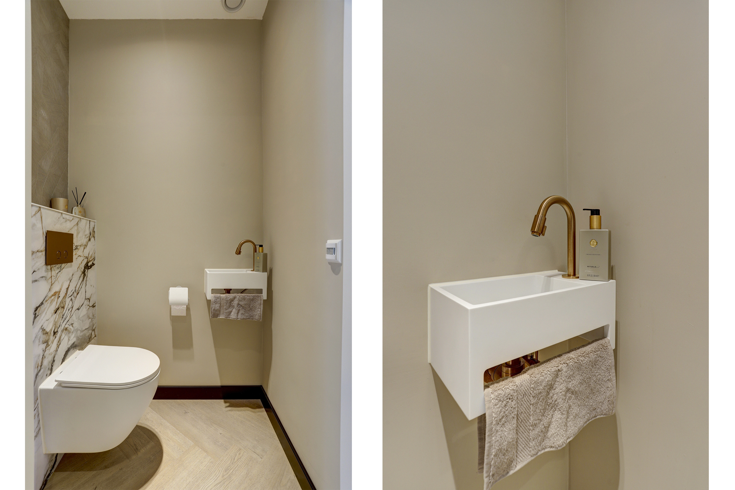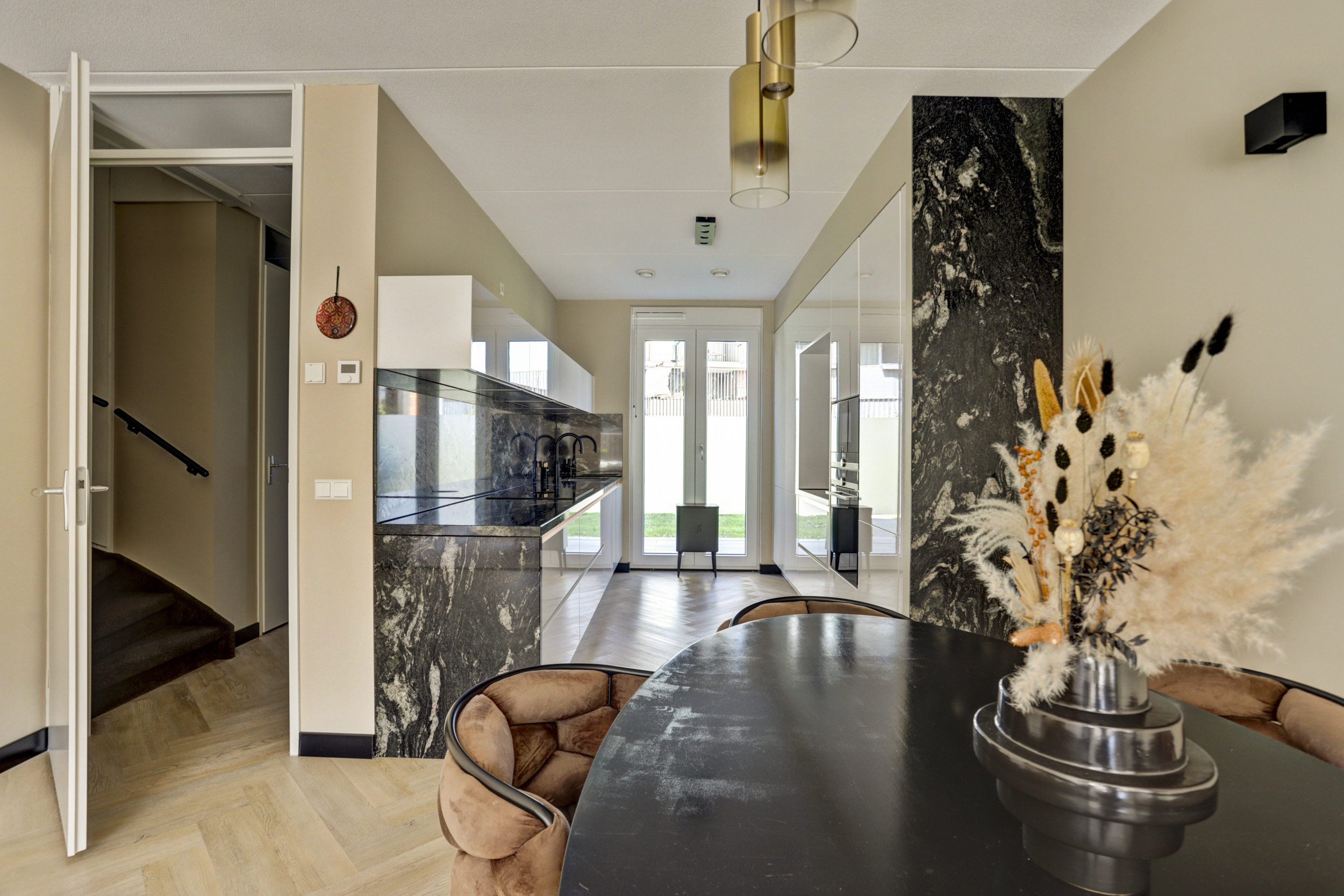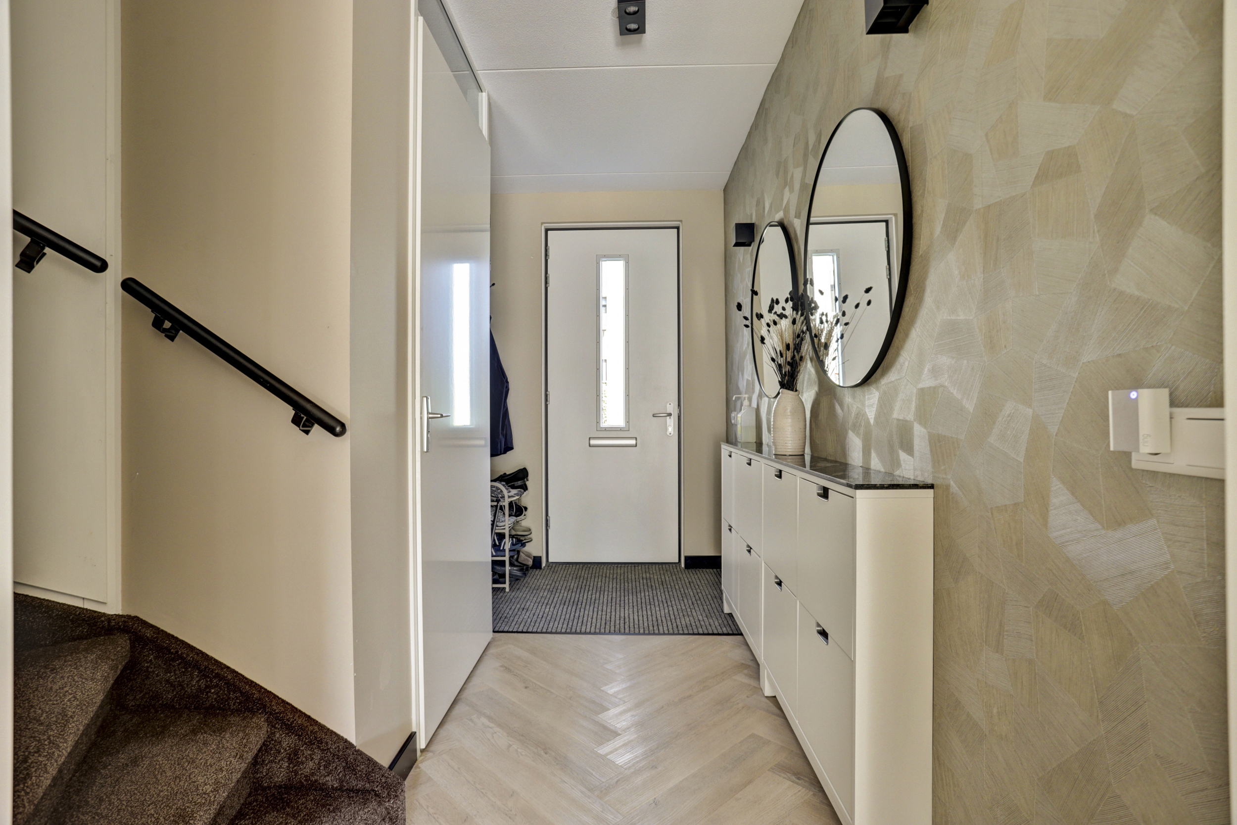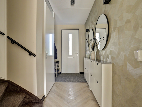 Hal/entree met moderne (uitgebreide) meterkast, garderoberuimte, licht gesausde wanden gecombineerd met visgraat pvc vloer, luxe toilet met zwevend closet en fonteintje, trapopgang en toegang tot de tuingerichte, sfeervolle woonkamer.