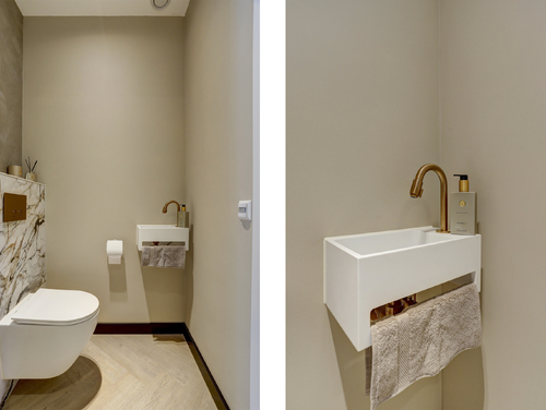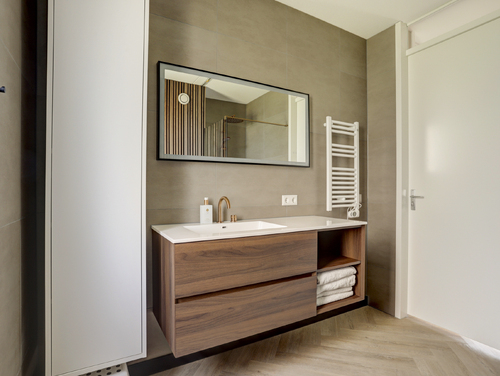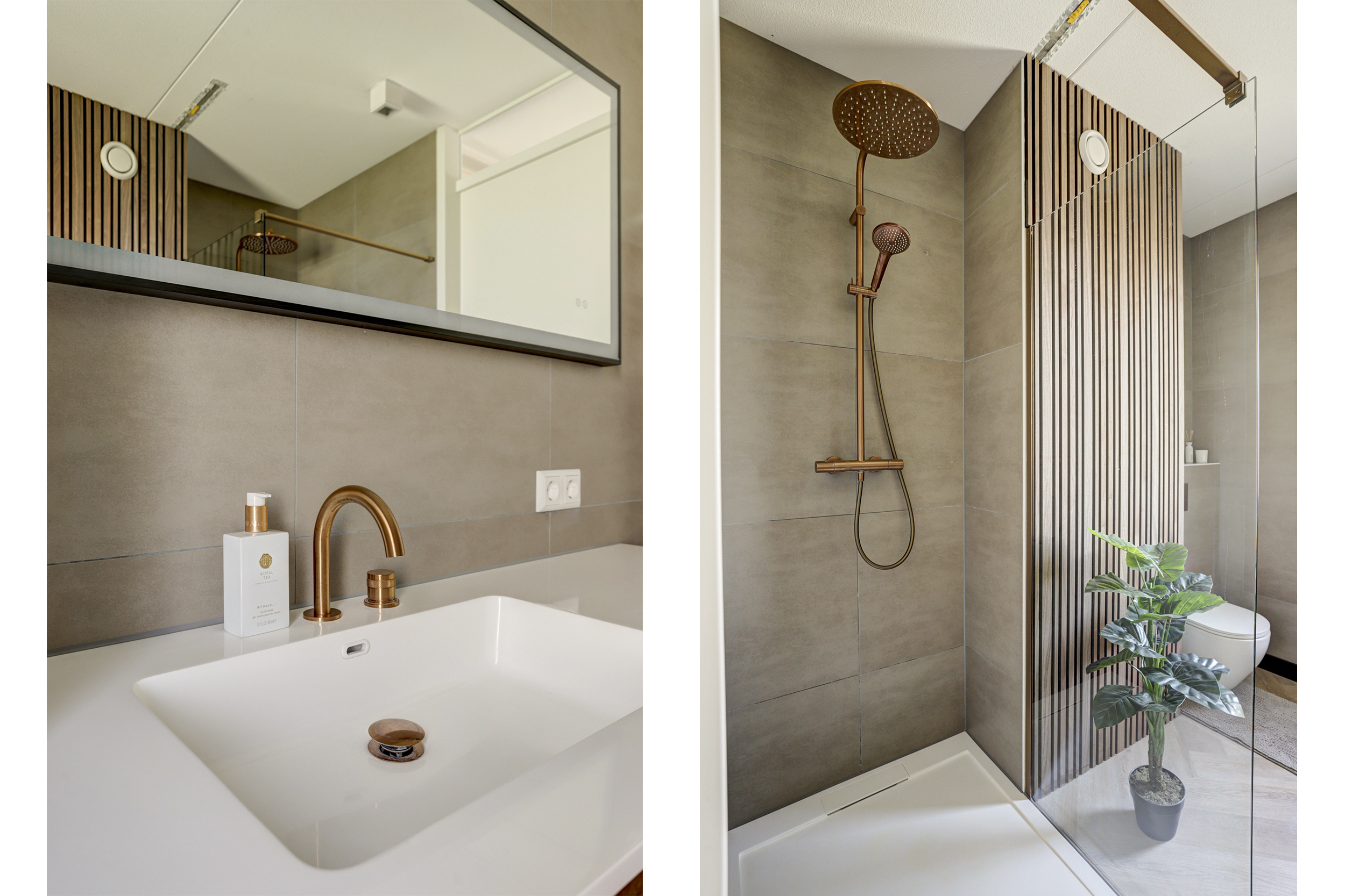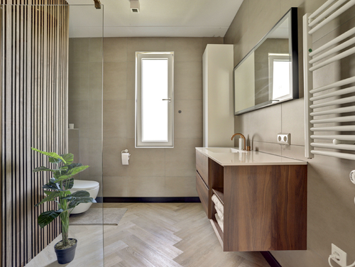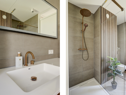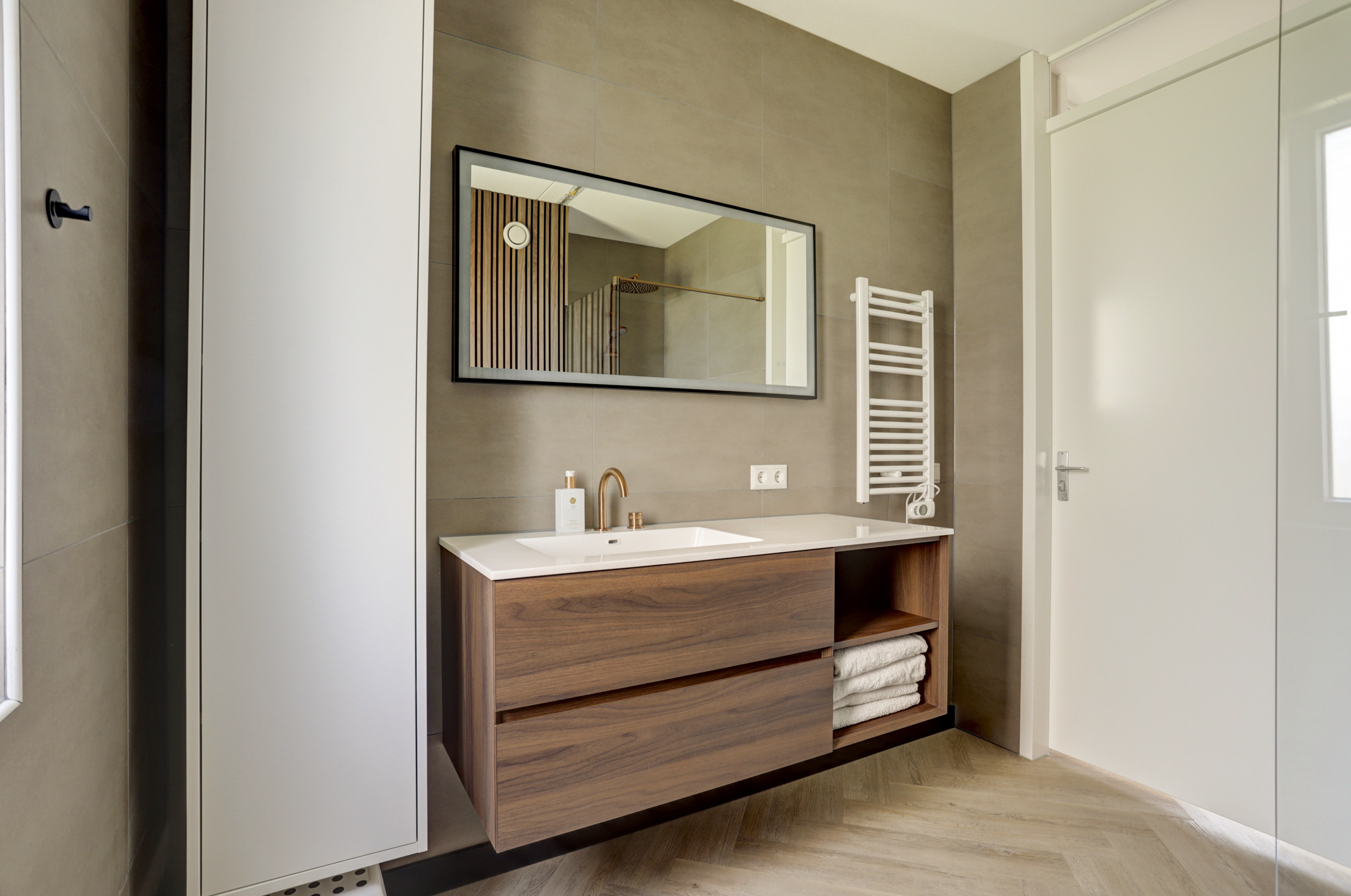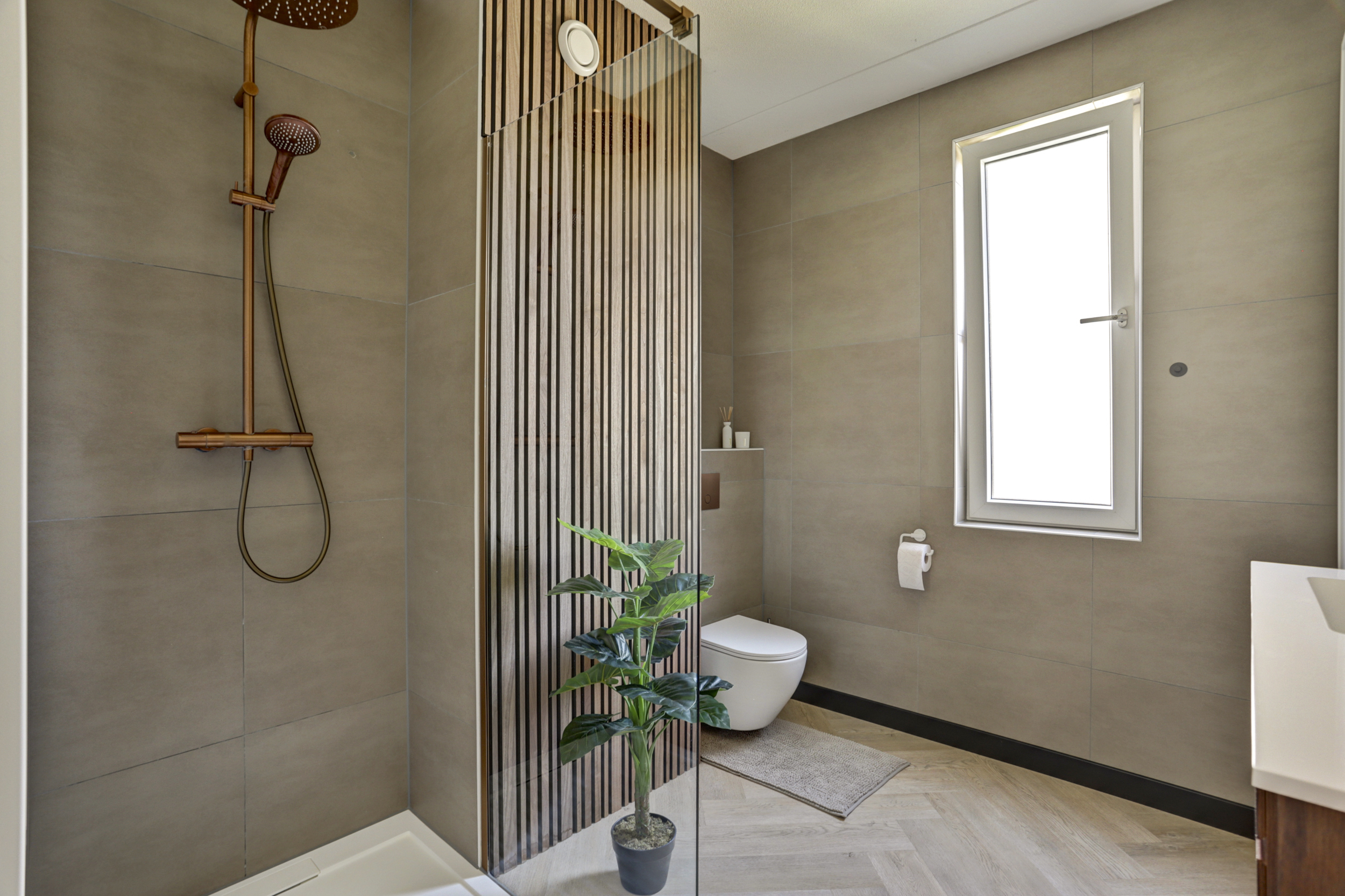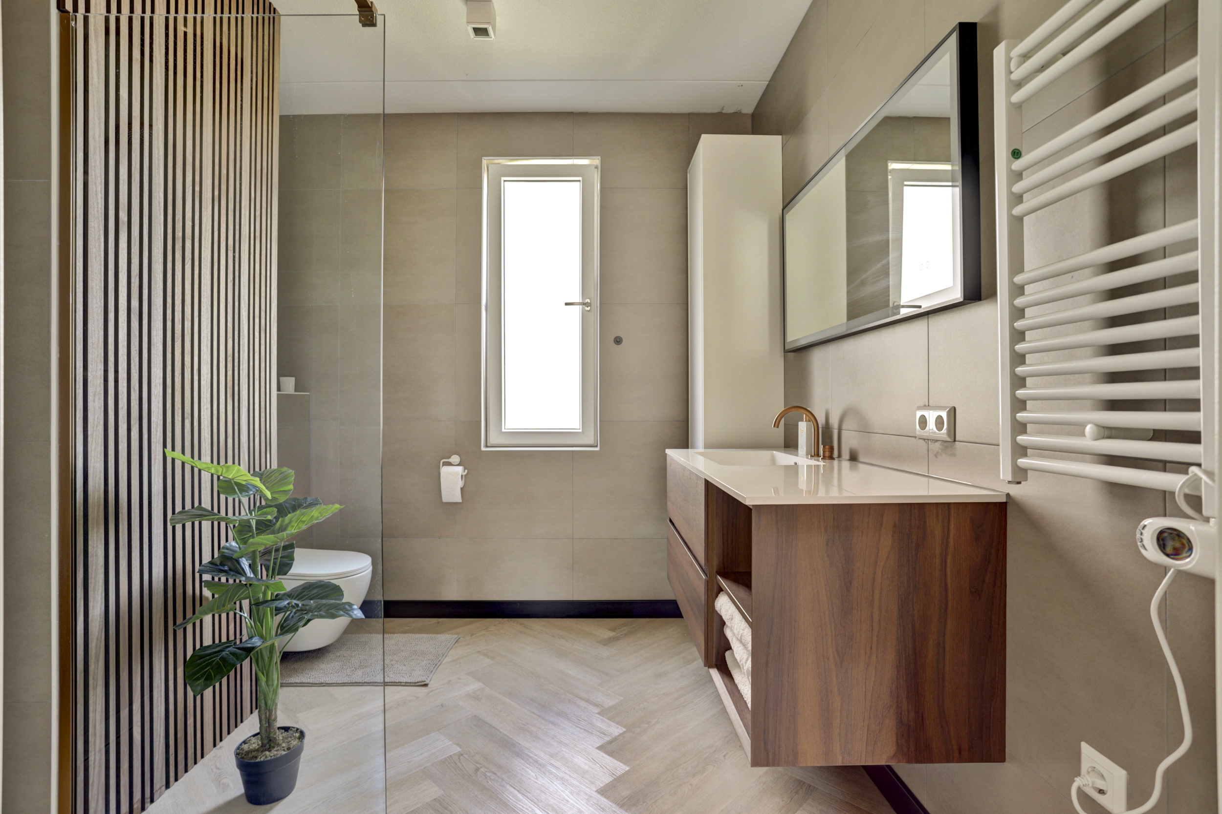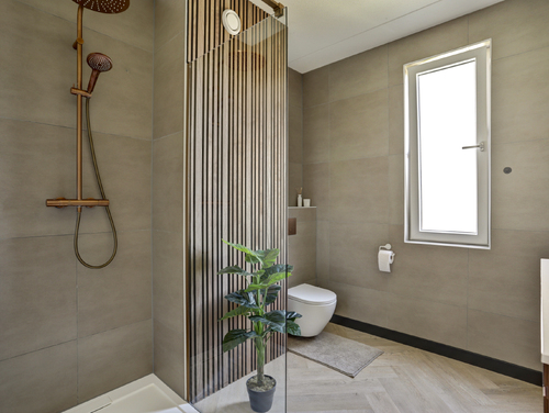 De geheel luxe uitgevoerde badkamer (ca. 7 m²) is uitgerust met een wastafel met meubel, ruime inloopdouche met regendouche, mechanische ventilatie, uitzetraam, design radiator en een 2e toilet met zwevend closet.