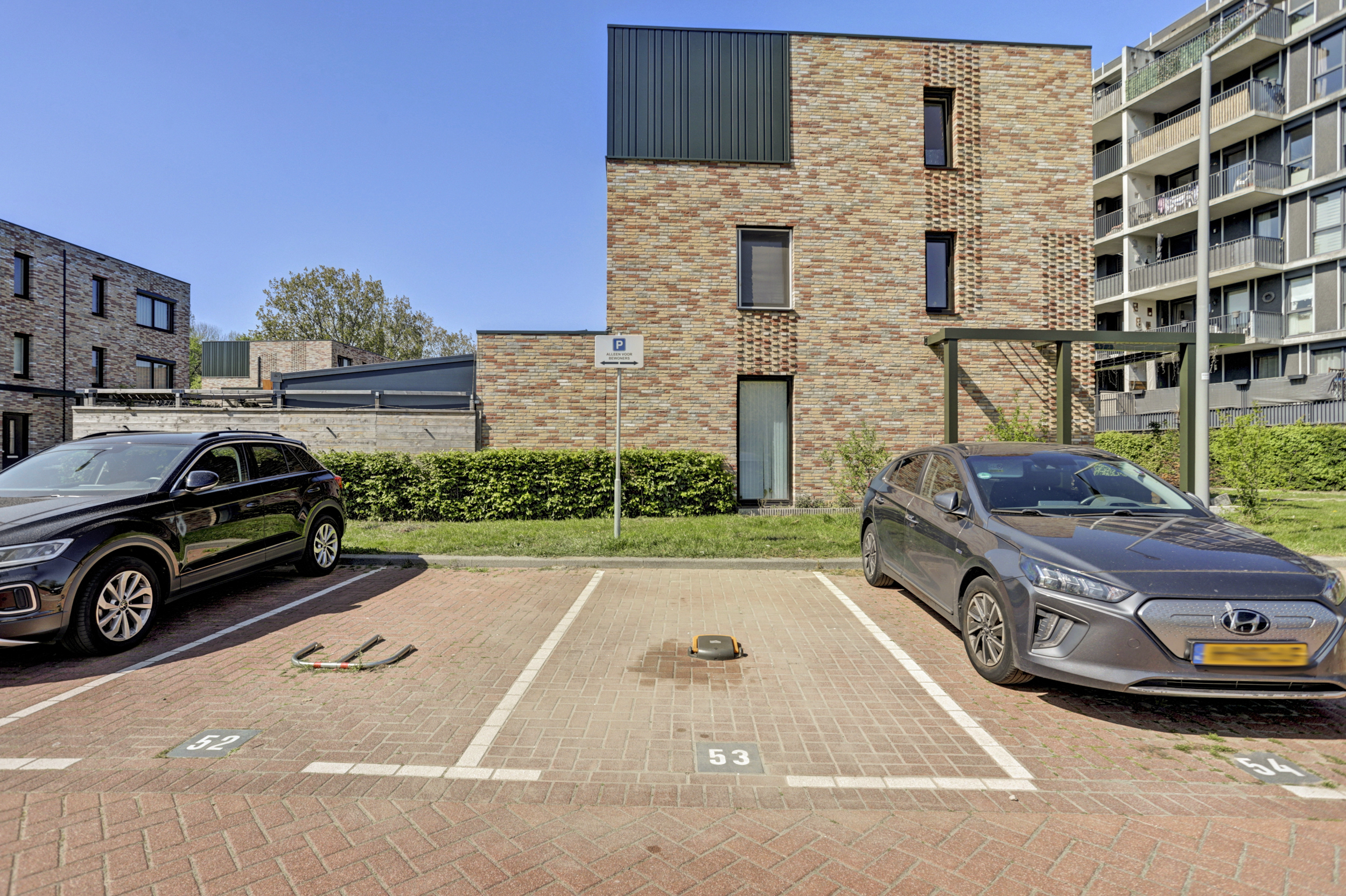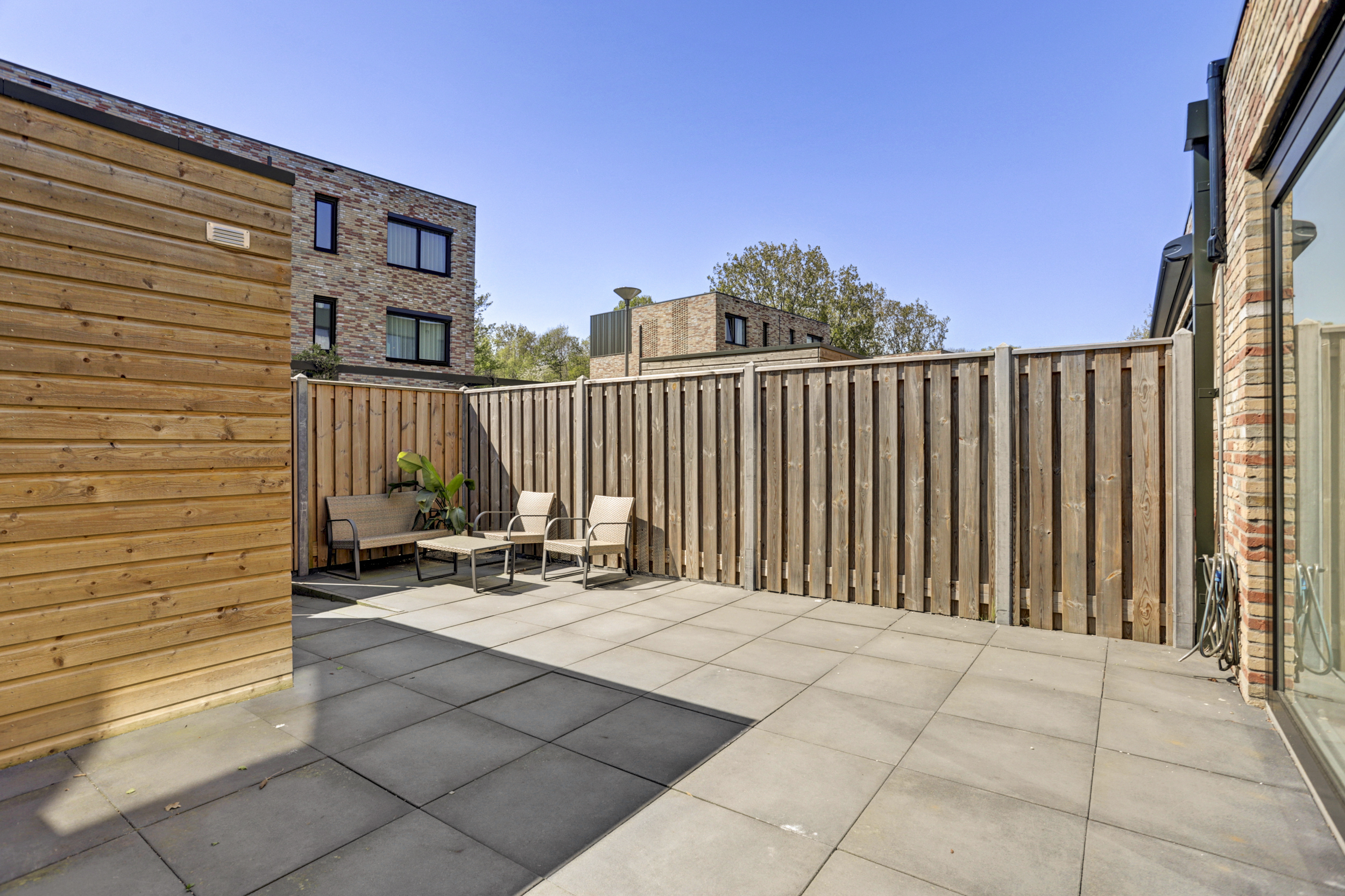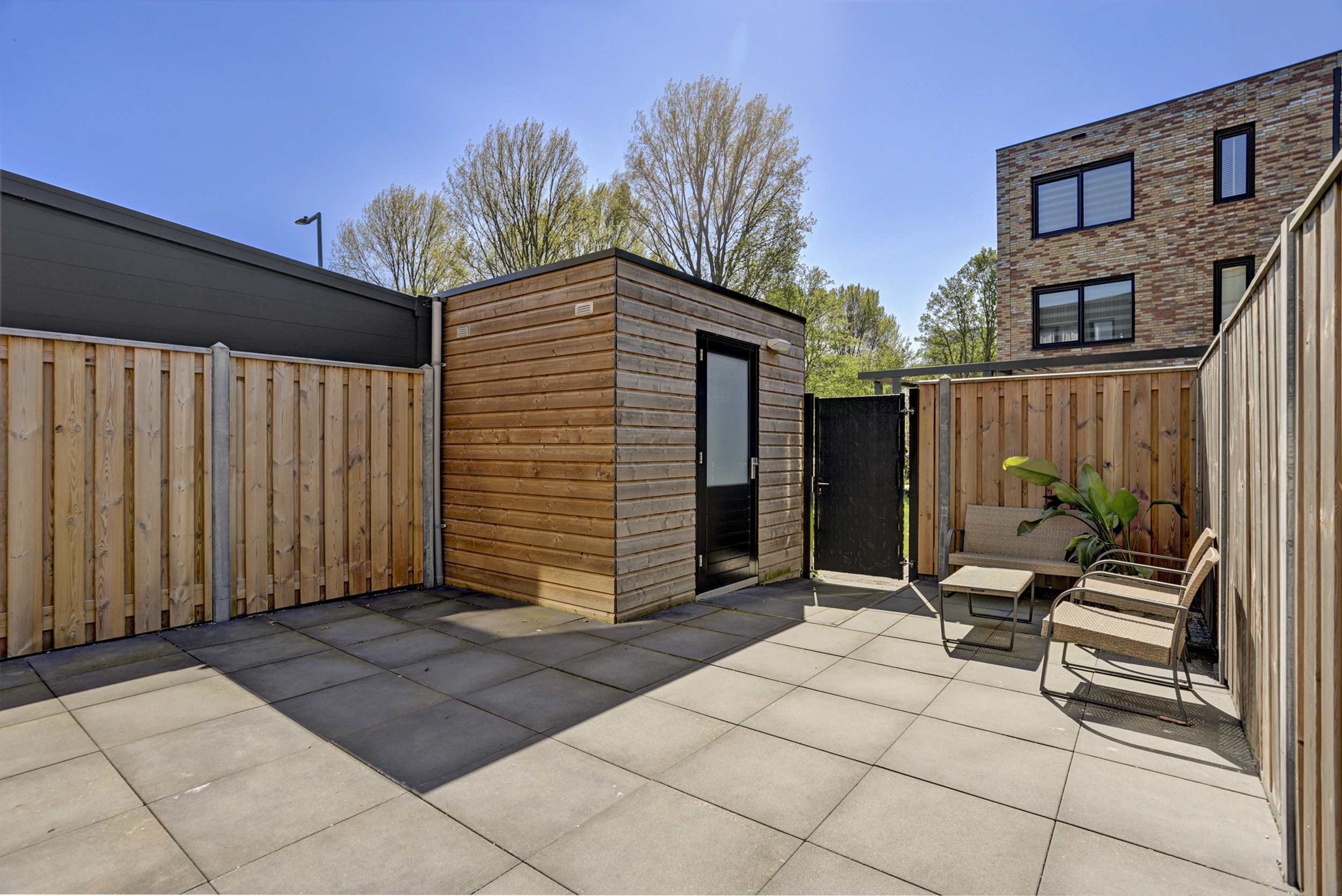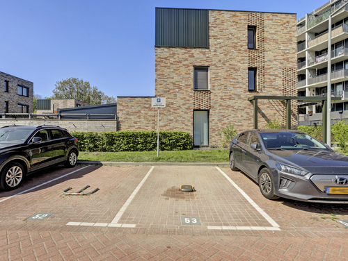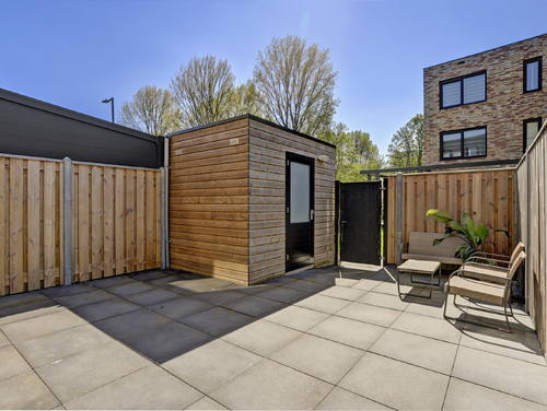 De achtertuin is geheel omheind en betegeld en gesitueerd op het zuidwesten. Deze is middels een achterom te bereiken en voorzien van een buitenkraan en een vrijstaande houden berging met elektra. Naast de woning bevindt zich een eigen parkeerplaats (nummer 53).