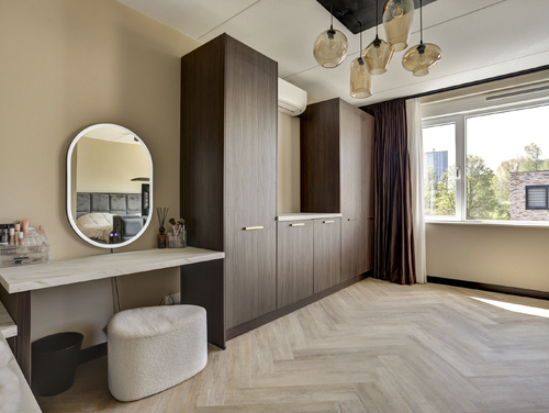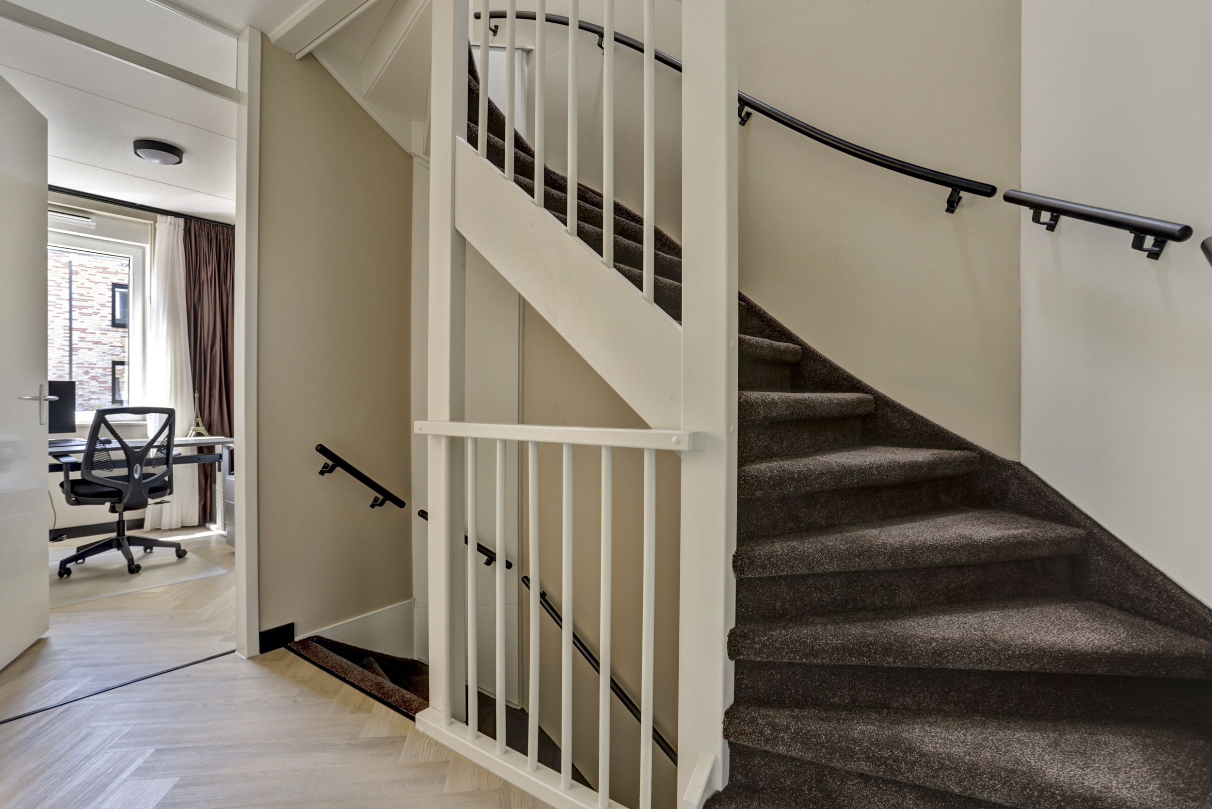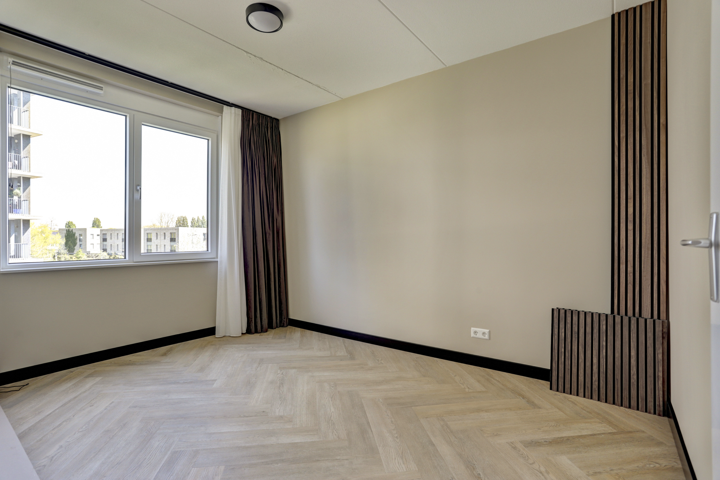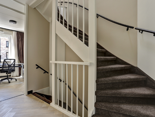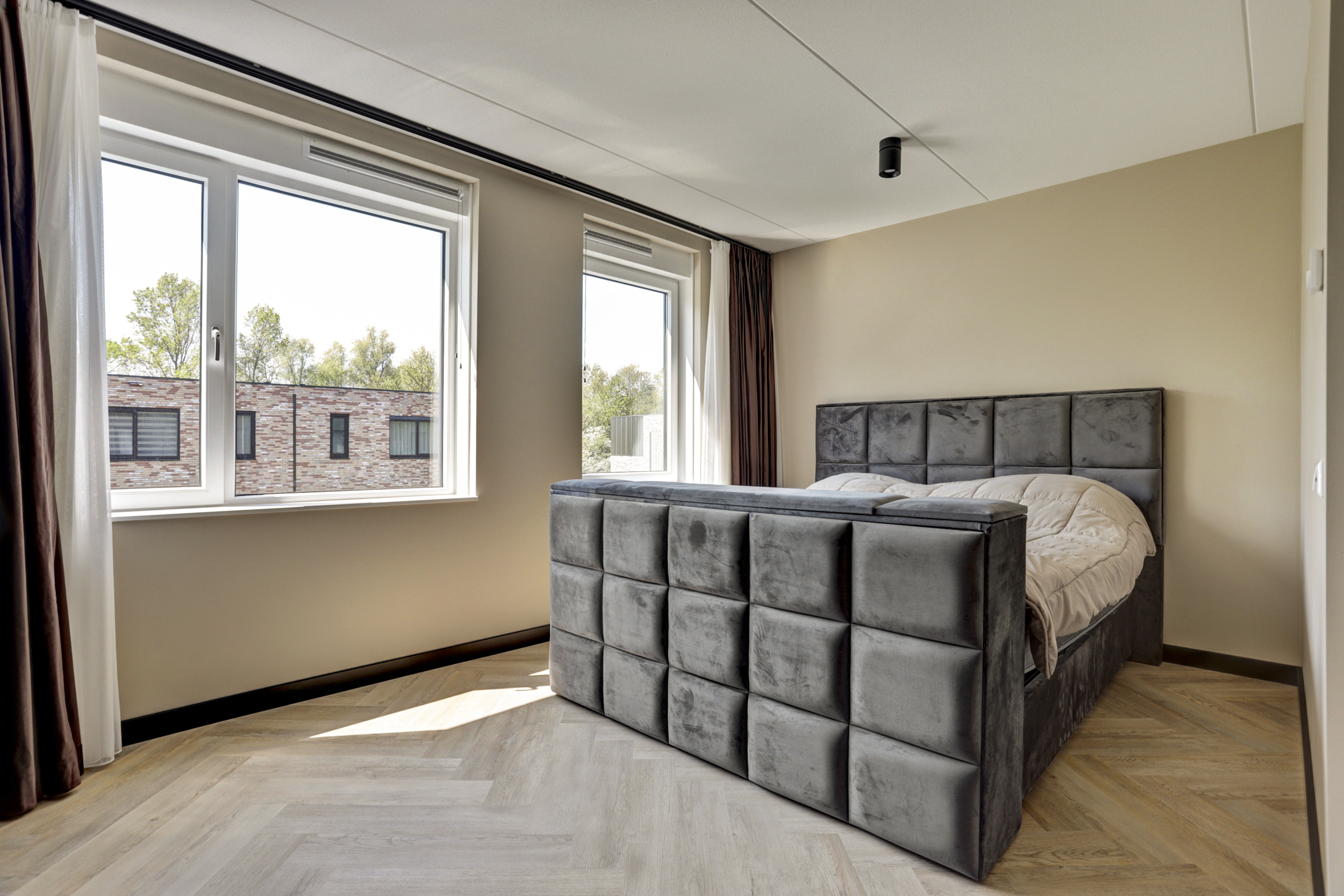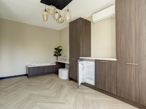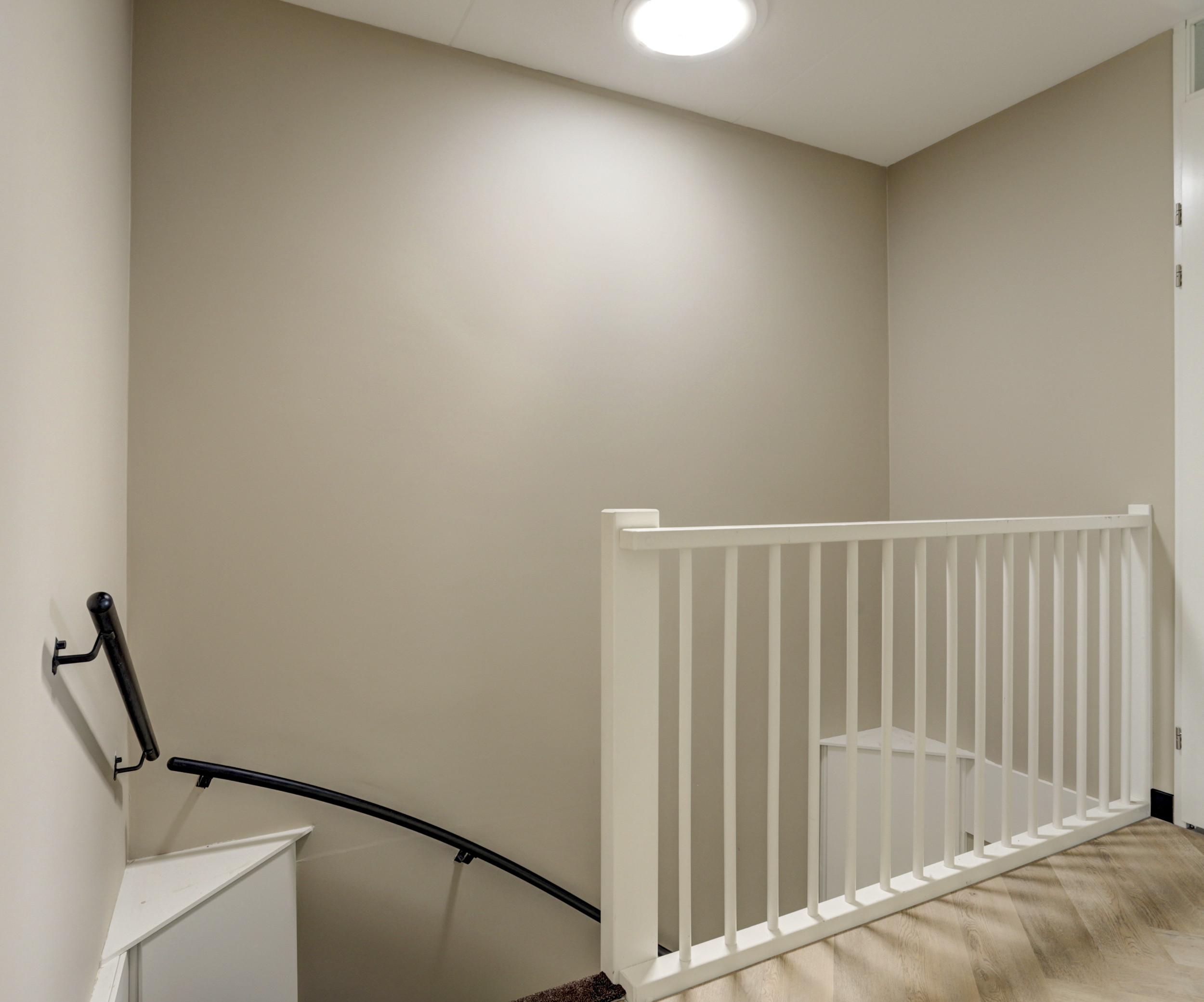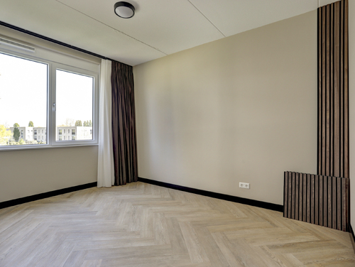 De gehele verdieping is uitgerust met een visgraat pvc vloer, vloerverwarming en licht gesausde wanden.