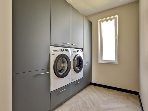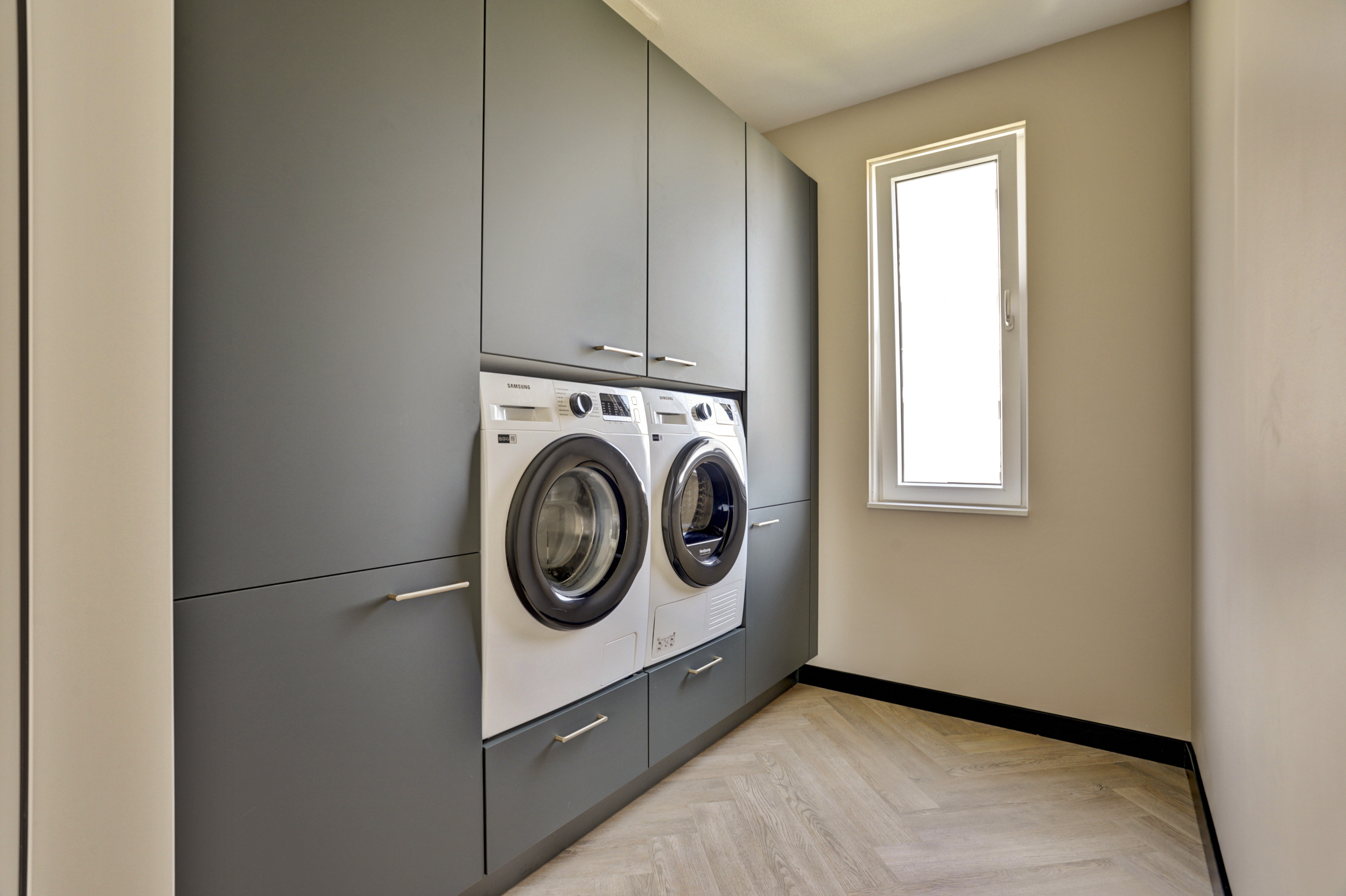 Deze ruimte (ca. 6 m²) is voorzien van een op maat gemaakte waskast, waarin netjes de wasmachine, droger, omvormer en de unit van de mechanische ventilatie zijn weggewerkt.