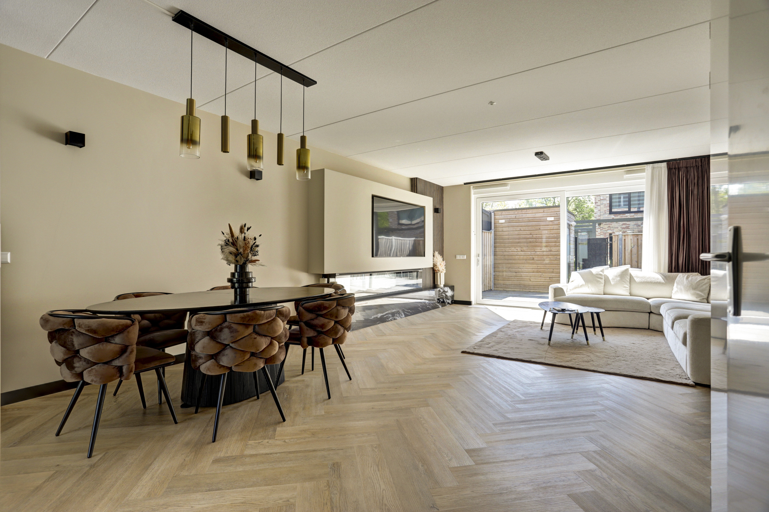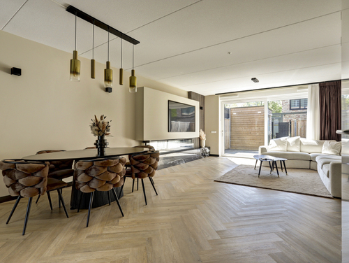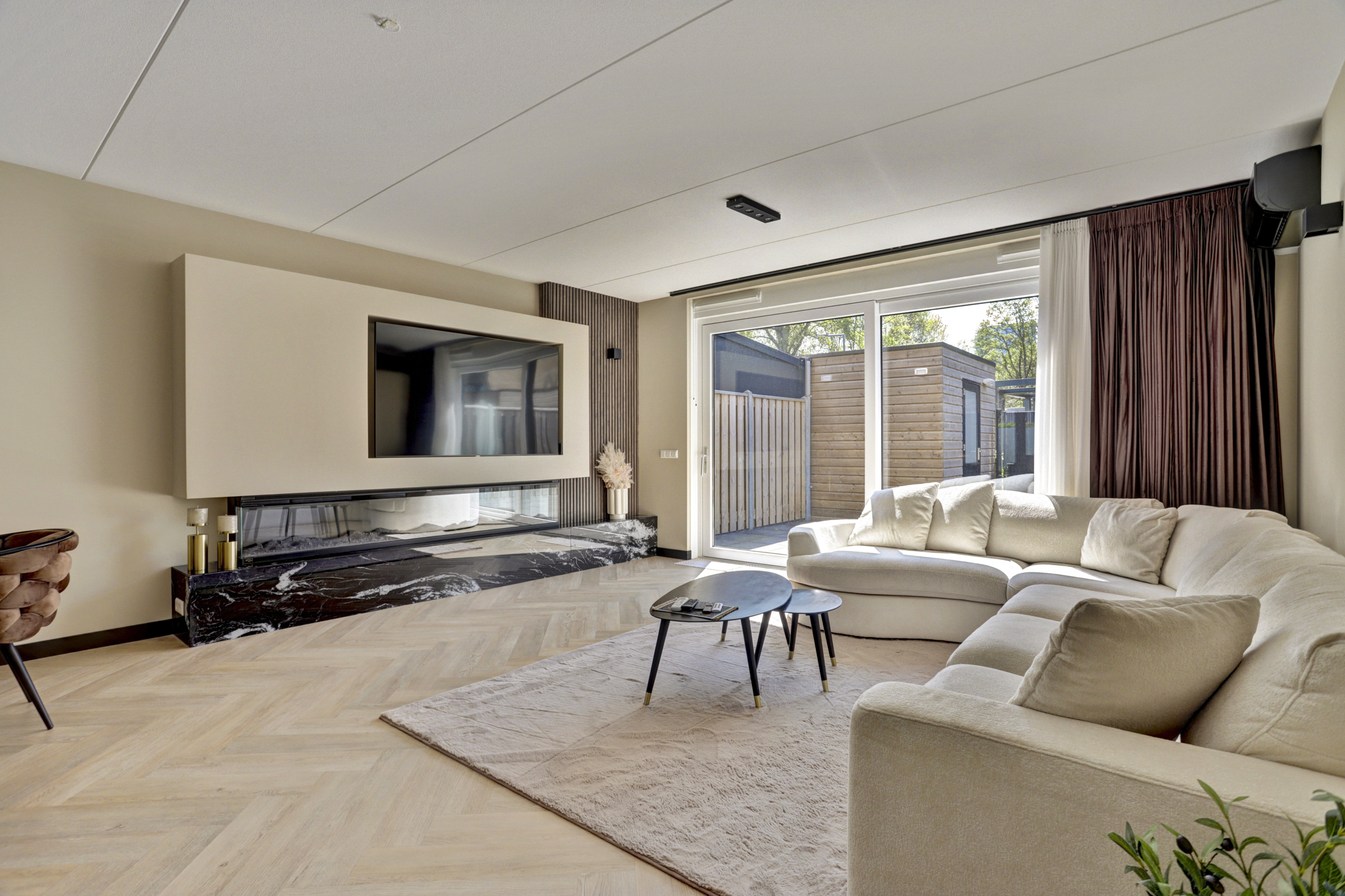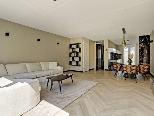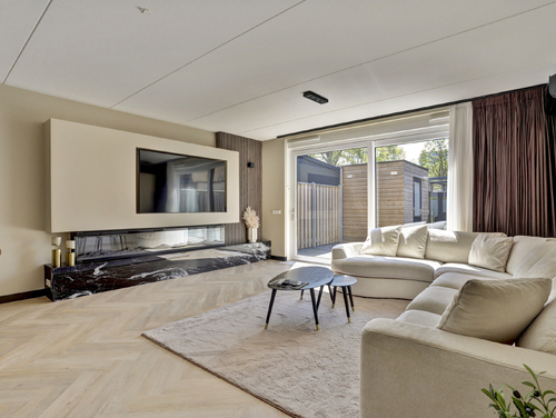 De aan de achterzijde uitgebouwde woonkamer (ca. 35 m²) is voorzien van een grote kunststof schuifpui, licht gestucte en gesausde wanden, fraaie sfeerverlichting, airconditioning, een handige voorraadkast, een schitterende cine wall met sfeervolle sierhaard en een bijpassende visgraat pvc vloer met vloerverwarming (hoofdverwarming).