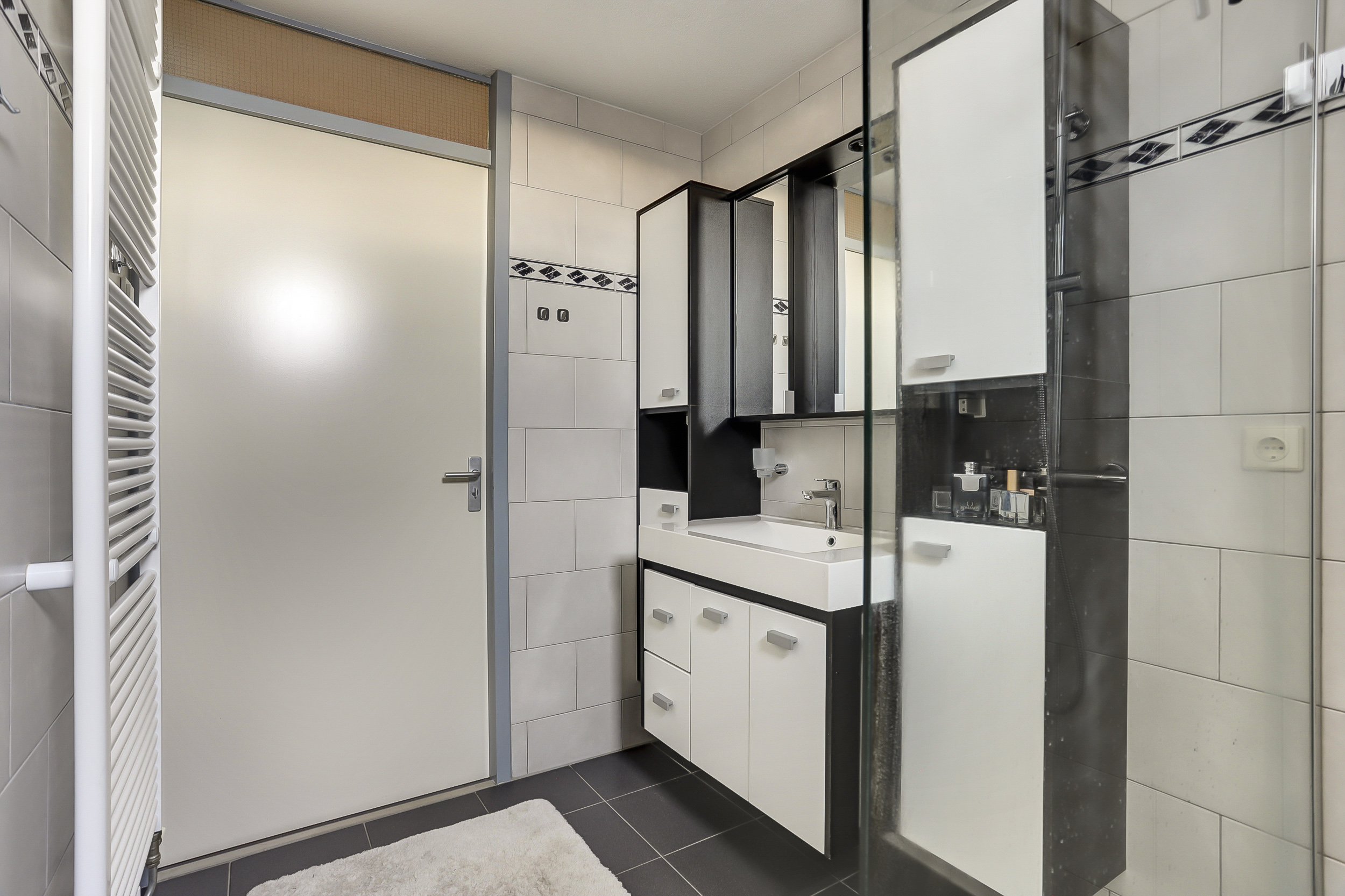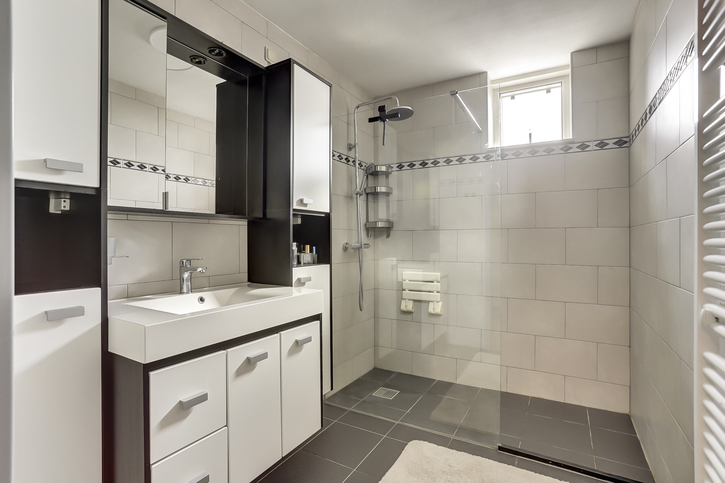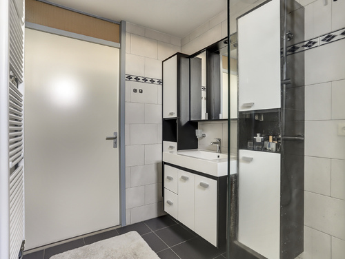 De geheel licht betegelde badkamer (ca. 5 m²) is uitgerust met een inloopdouche, een design radiator en een wastafel met meubel.
