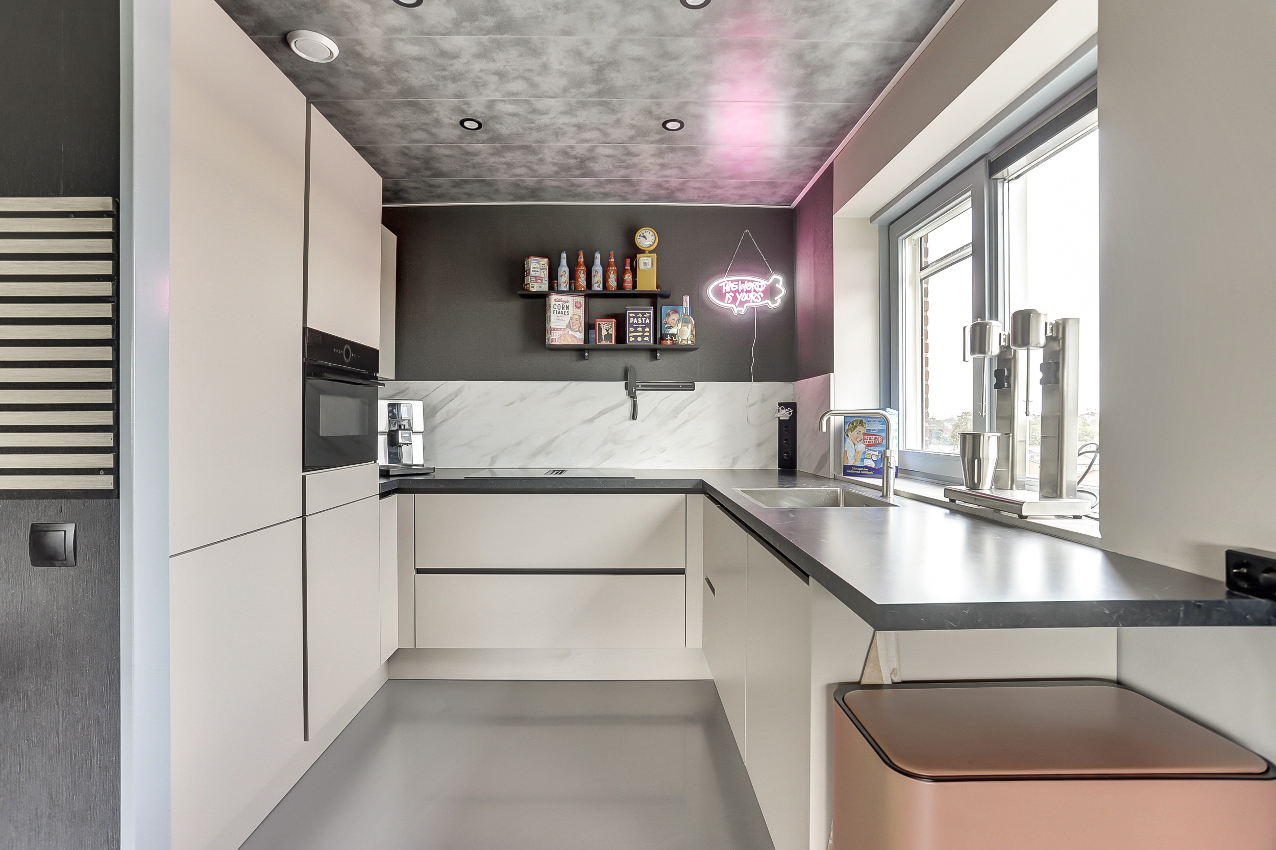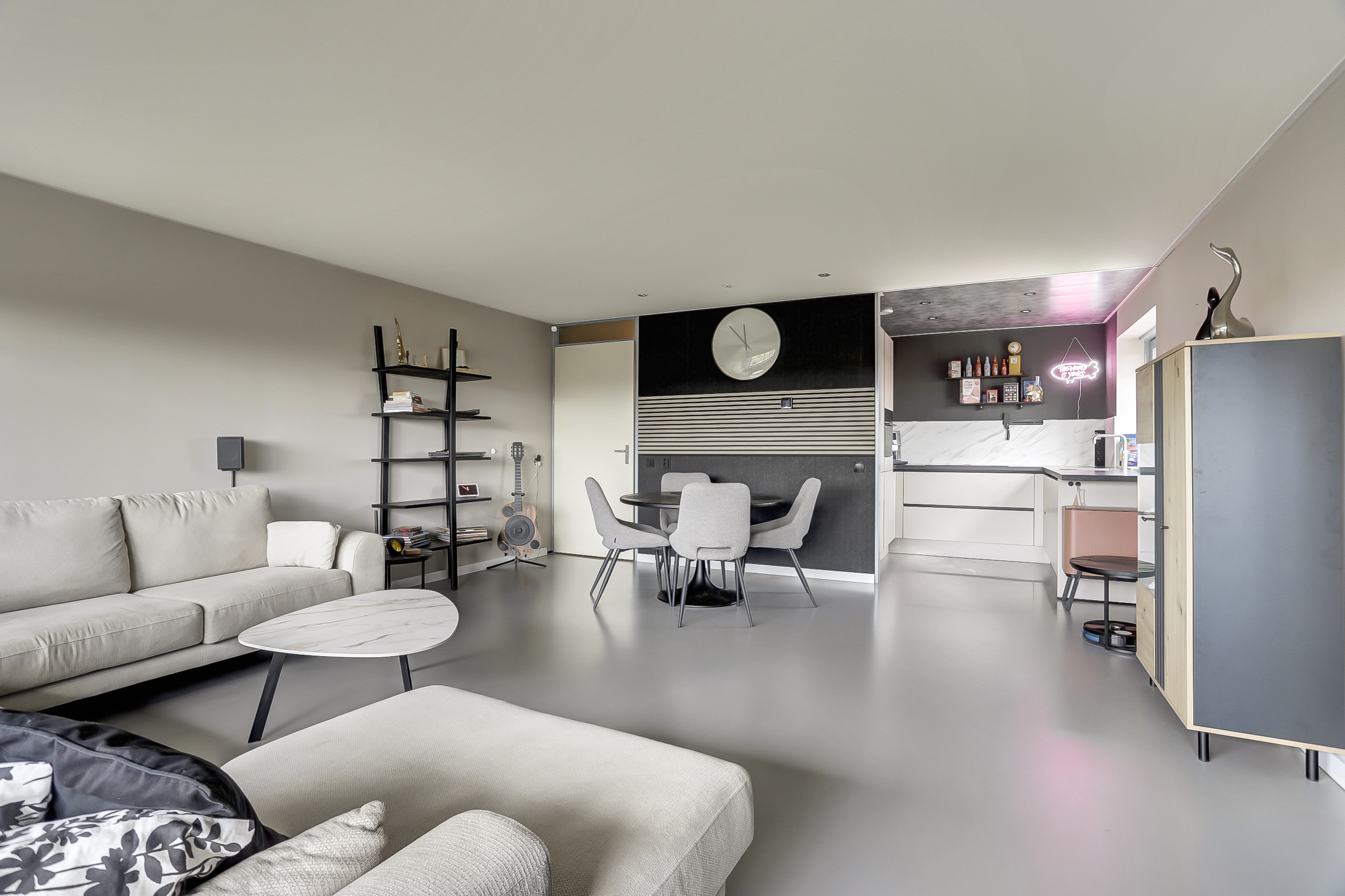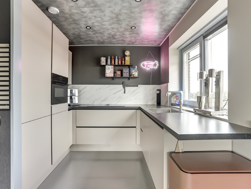 De recent geplaatste open keuken (ca. 5 m²) beschikt over een U-vormige keukenopstelling met diverse inbouwapparatuur zoals een inductiekookplaat met geïntegreerde afzuiging, een koelkast, een vriezer, combimagnetron en een Quooker (heetwater). Ook hier tref je een gietvloer en licht gesausde wanden aan.