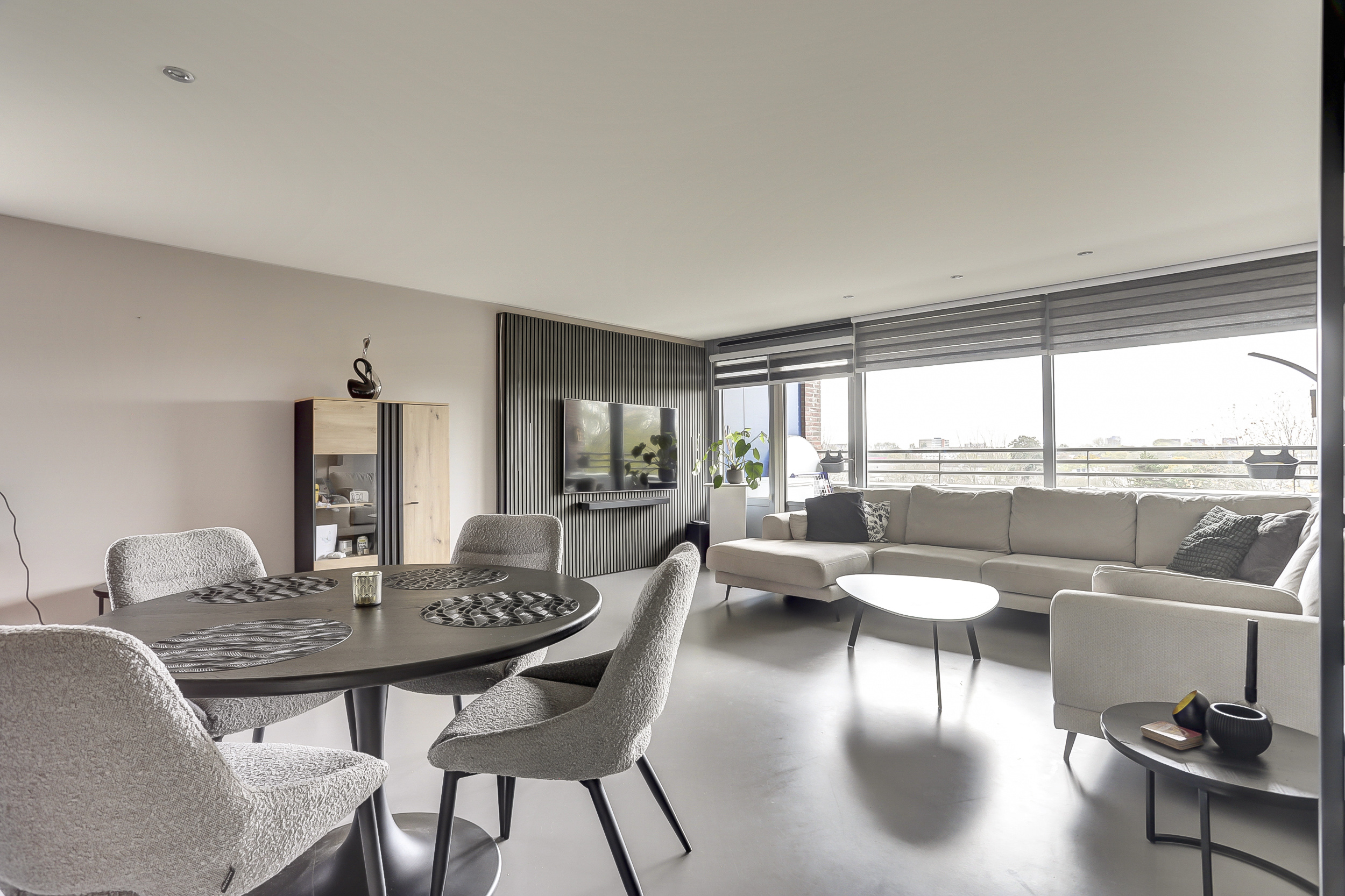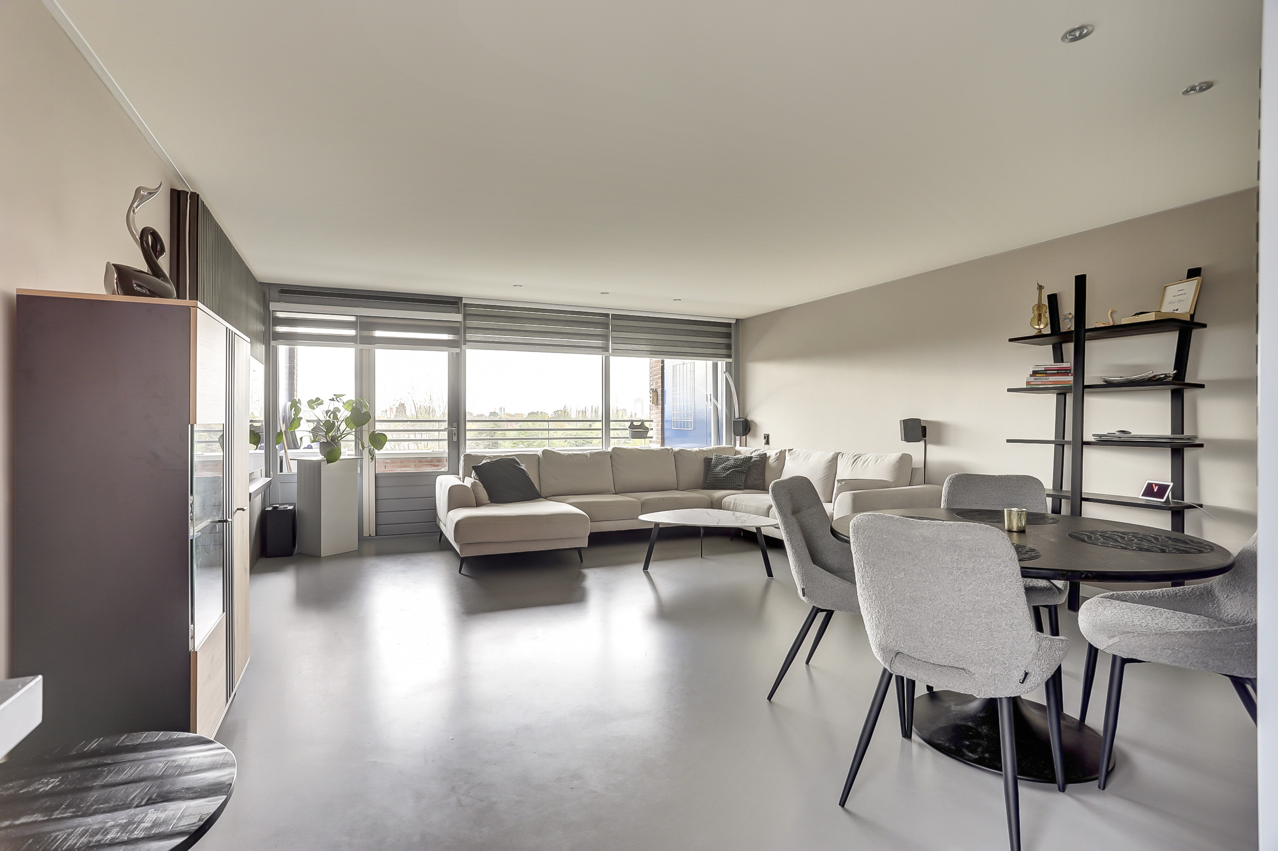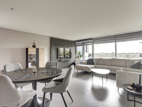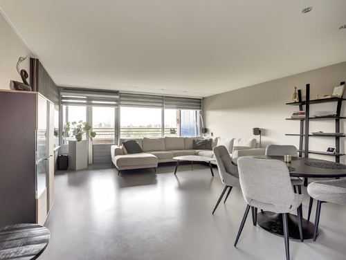 De ruime, lichte woonkamer van ca. 30 m², beschikt over een gietvloer, ingebouwde verlichting en een deur naar het zonnige balkon. De grote raampartij over de gehele breedte geeft een fantastisch uitzicht over het water en groenvoorziening.