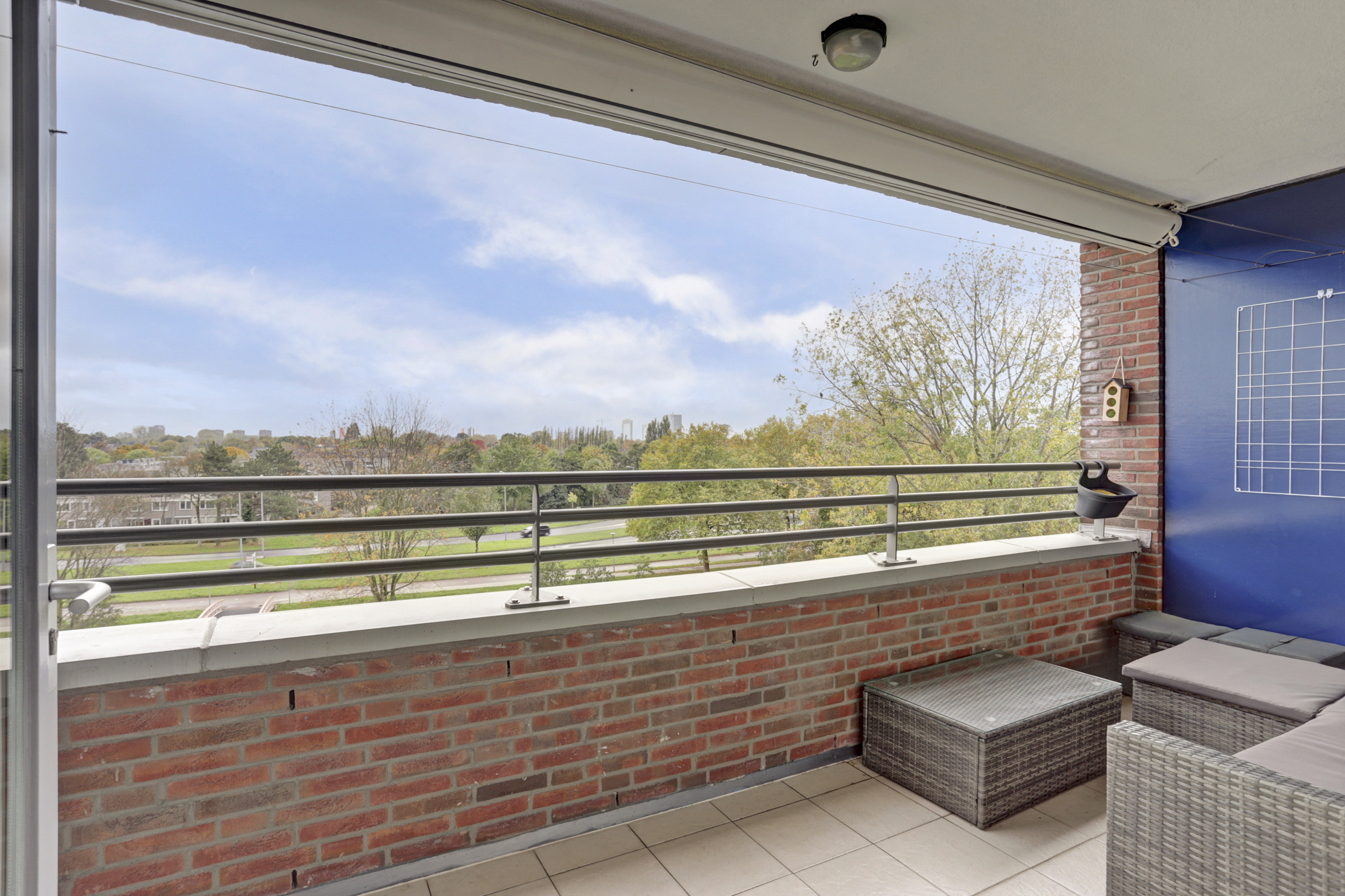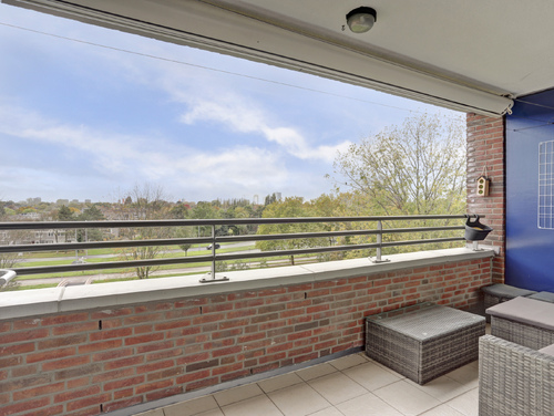 Het balkon (ca. 8 m²) met plavuizenvloer en zonwering is op het zuiden gericht, biedt veel privacy en heeft een vrij uitzicht.