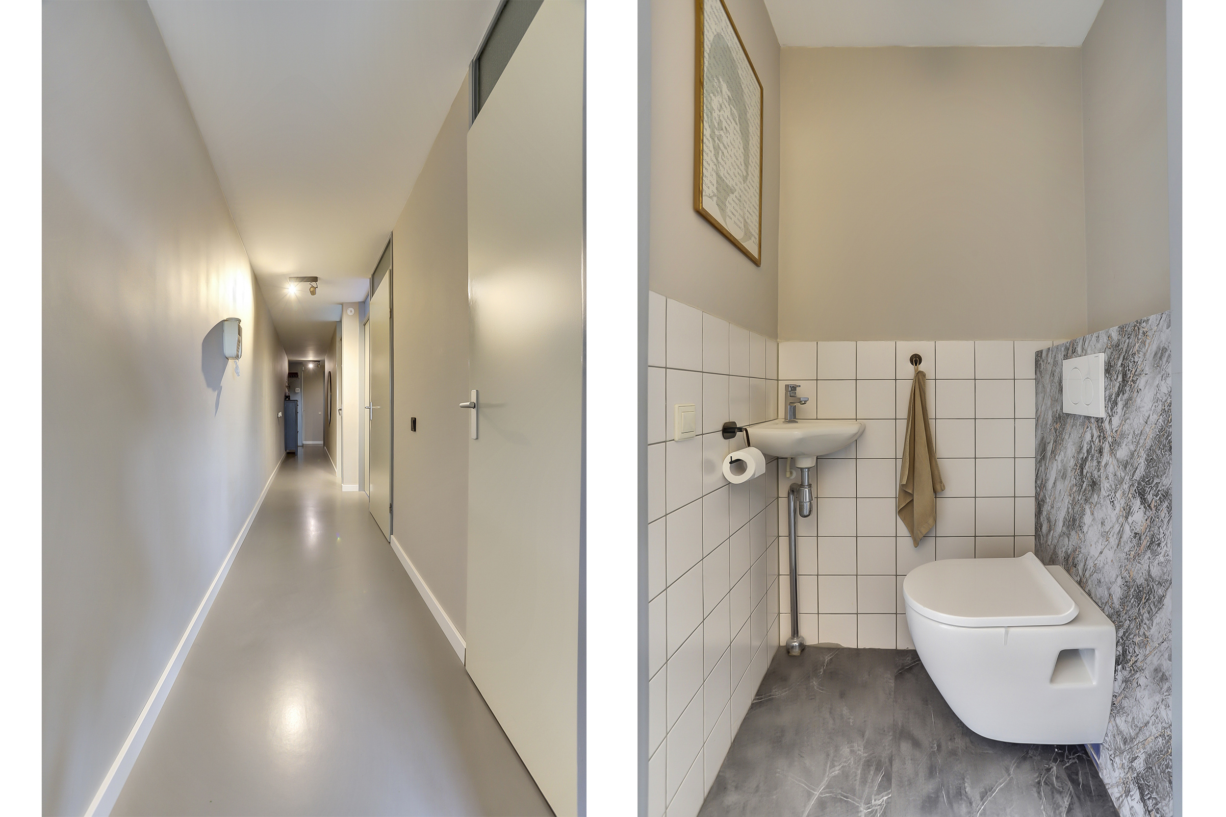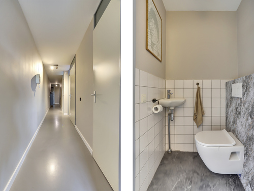 Ruime hal/entree met fraaie gietvloer, uitgebreide meterkast (slimme meters/glasvezel), modern toilet voorzien van zwevend closet en fonteintje, videofoon, toegang tot de bergruimte, de badkamer en de 3 slaapkamers.