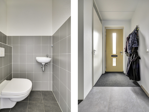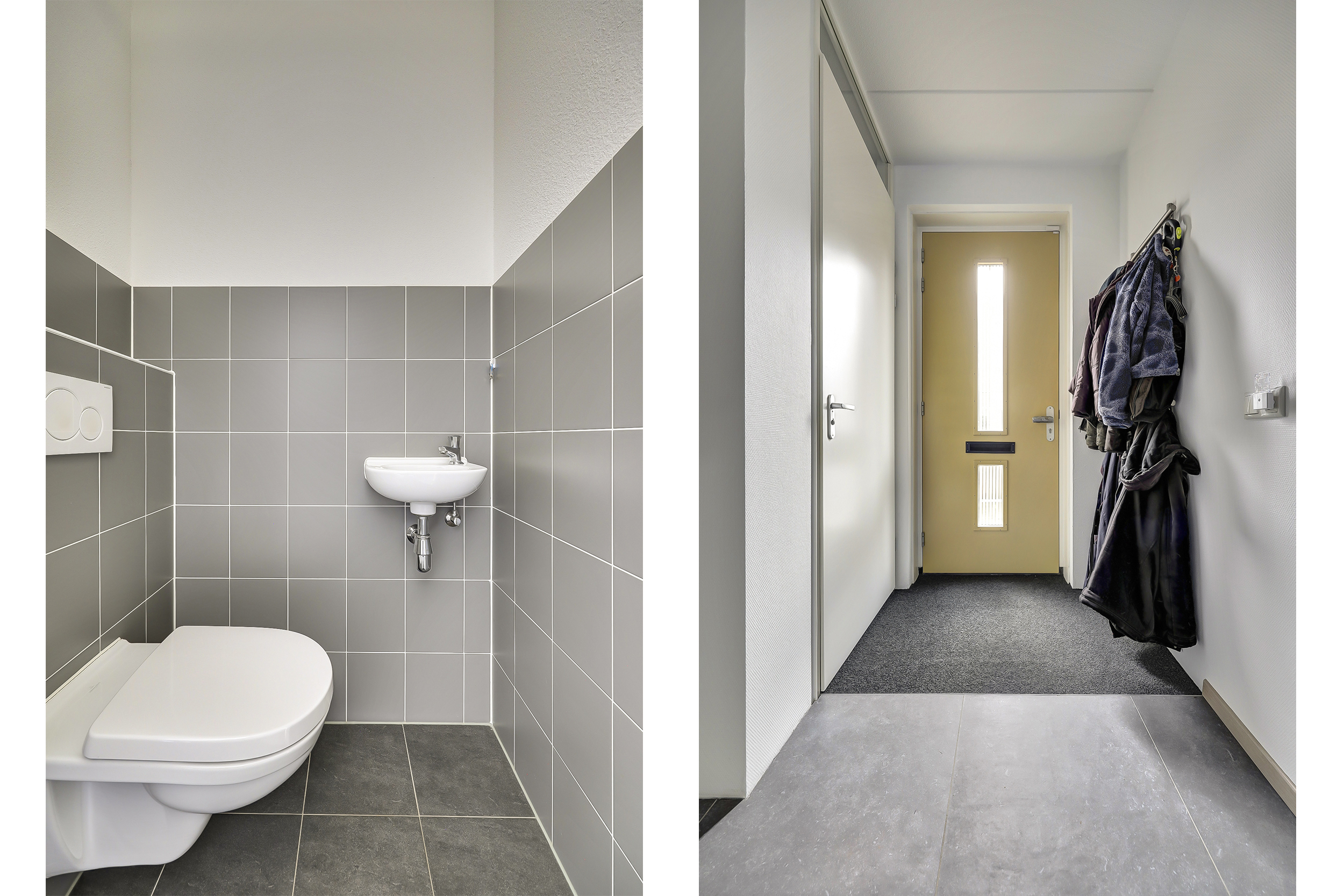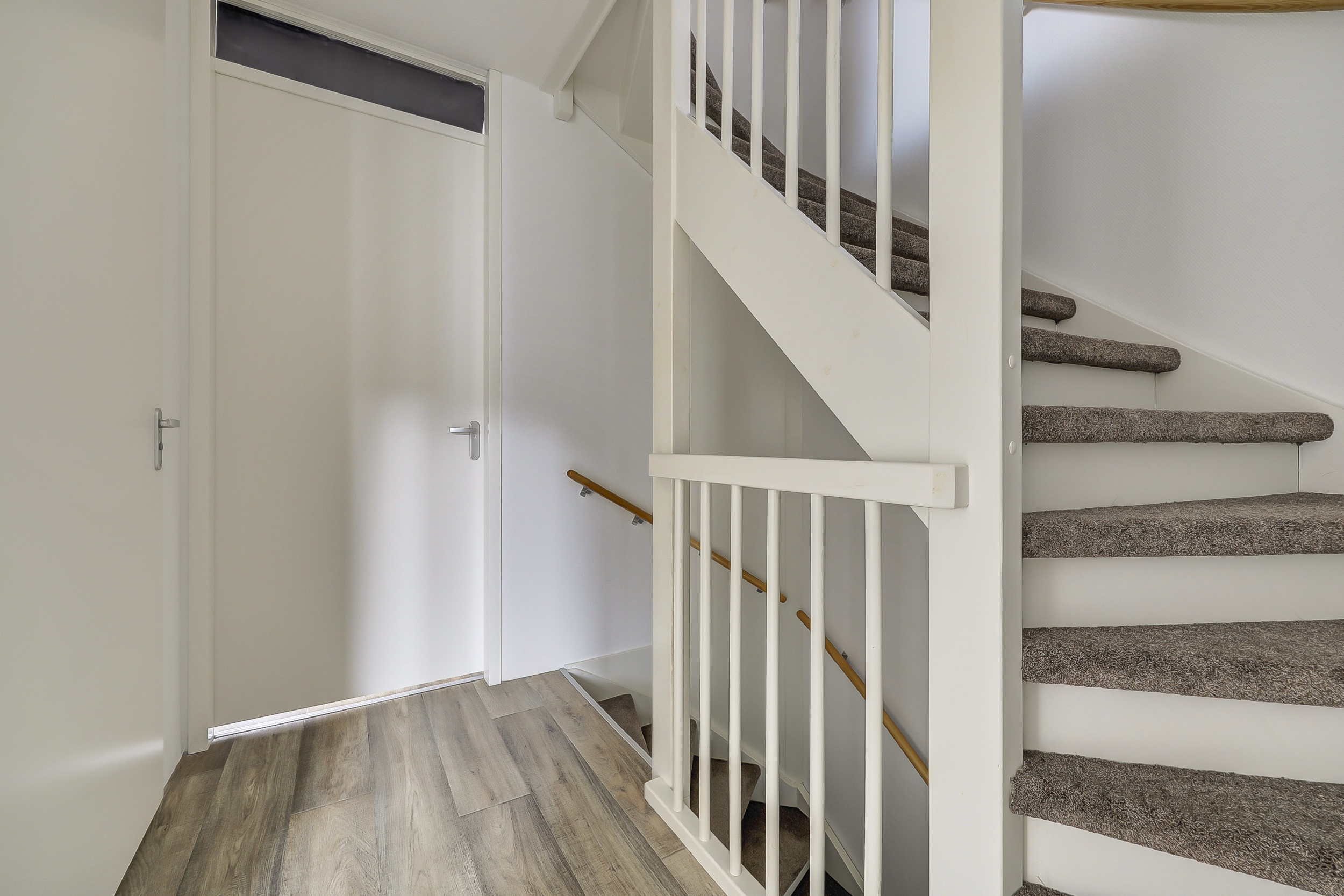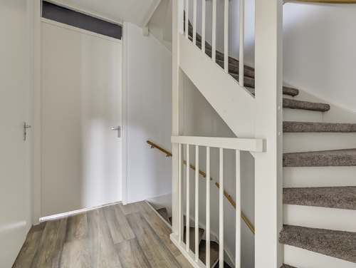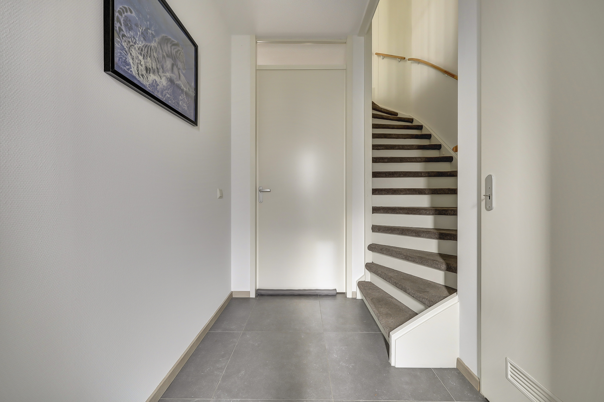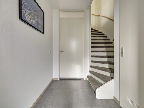 Hal/entree met glasvezelwandafwerking, plavuizenvloer, toilet met zwevend closet en fonteintje, meterkast (9 groepen met slimme meters/stadsverwarming/glasvezel), trapopgang en de toegang tot de tuingerichte woonkamer.