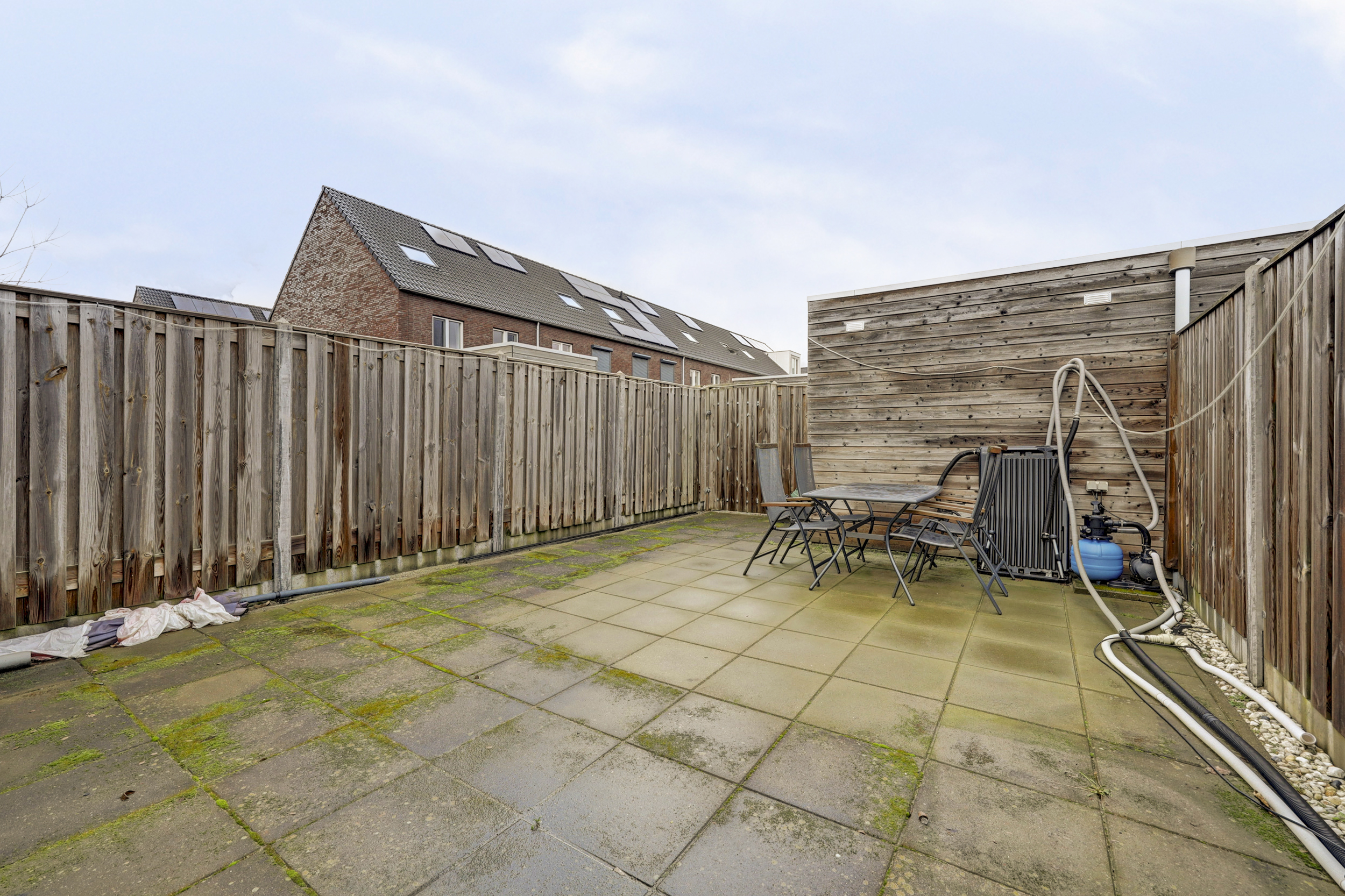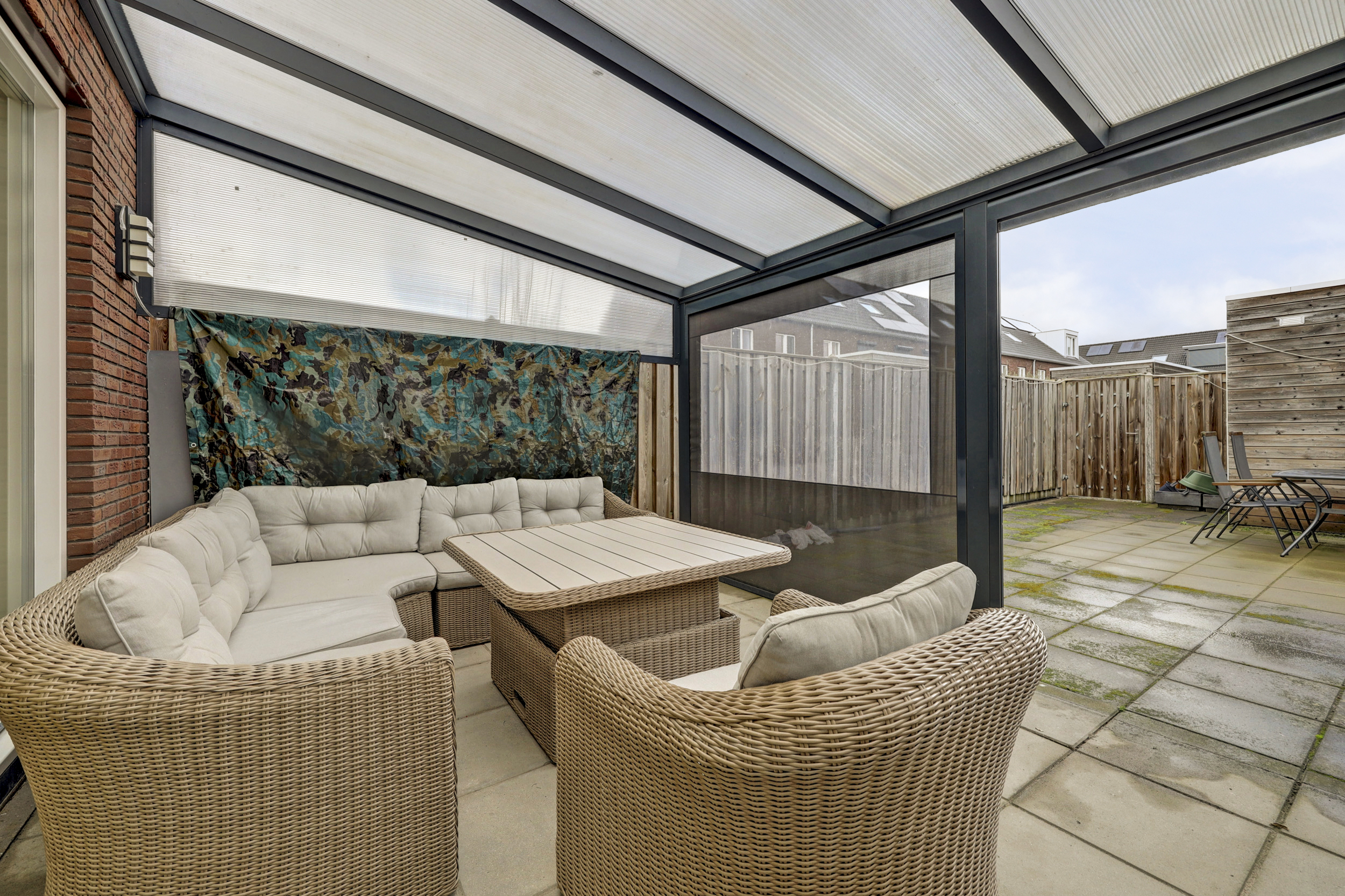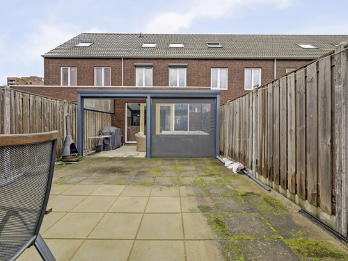 De besloten tuin op het noordoosten is voorzien van sierbestrating, een achterom en een vrijstaande houten berging met elektra. Grenzend aan de woning bevindt zich de serre die geplaatst is in 2022 van ca. 18 m² met screen zonwering (afstandsbediening).