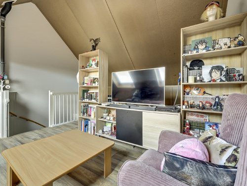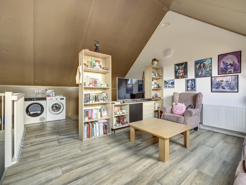 Via een vaste trap bereik je de riante open zolder (ca. 30 m²) waar met gemak twee kamers te realiseren zijn. De ruimte met een hoge nok is voorzien van twee "Velux" dakramen, opberggelegenheid achter de knieschotten, de opstelling van de wasmachine en droger, een omvormer (merk SolarEdge) en de unit van de mechanische ventilatie. Daarnaast tref je hier 3 batterijen met een totale opslag van 8,1 KWh (deze zijn ter overname).