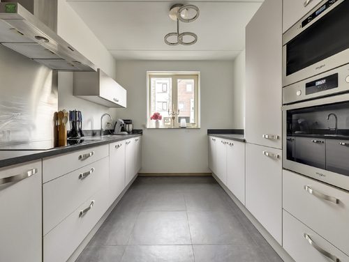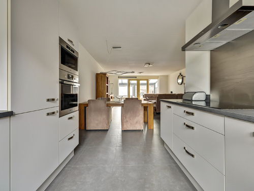 De open keuken (ca. 14 m²), eveneens met plavuizenvloer en vloerverwarming, beschikt aan weerzijde over een moderne wandopstelling en diverse apparatuur zoals een inductiekookplaat, rvs afzuigschouw, vaatwasser, oven , magnetron, koelkast, vriezer en een elektrisch rolluik.