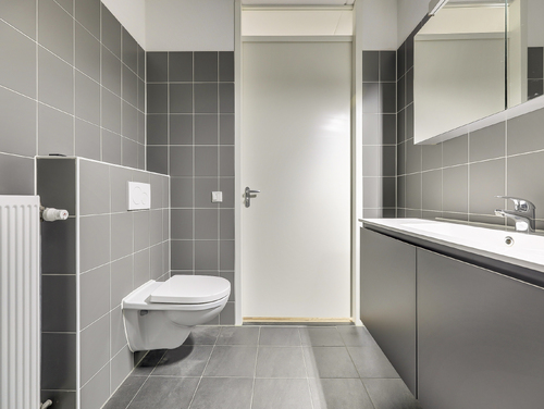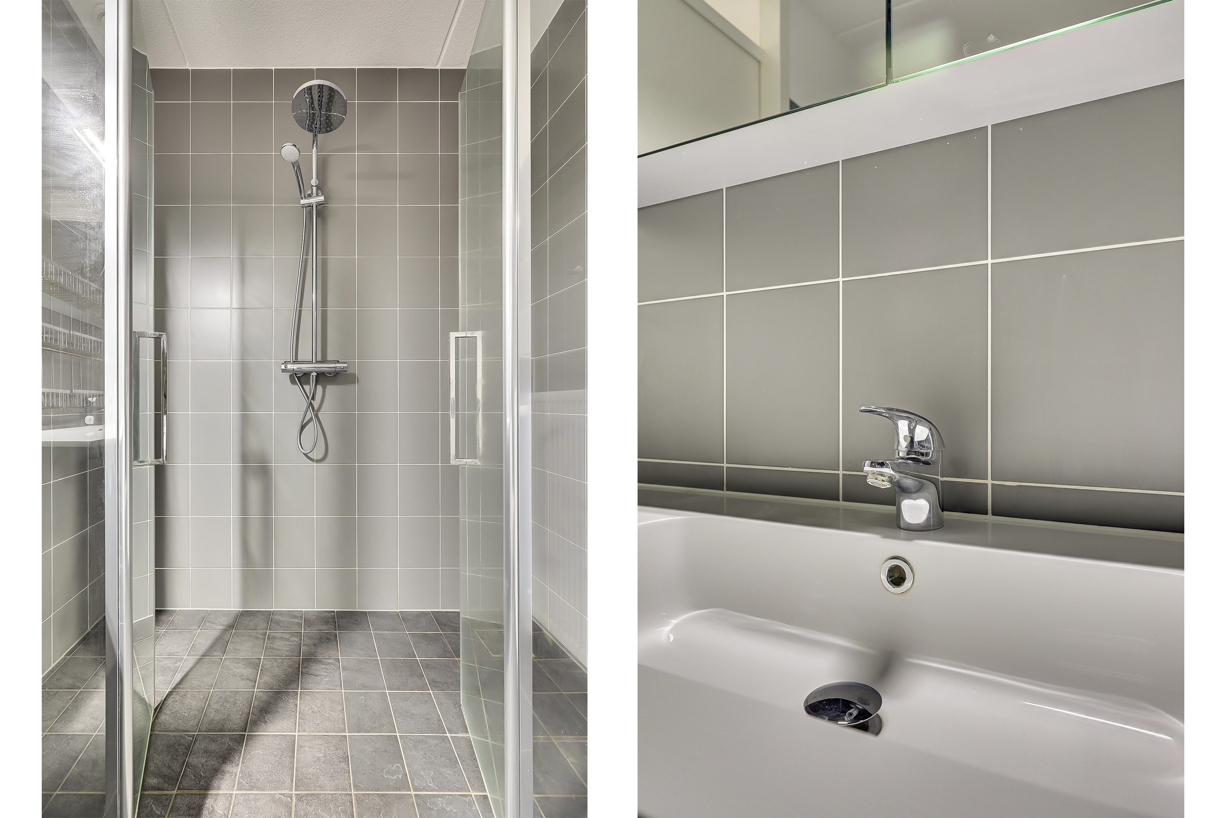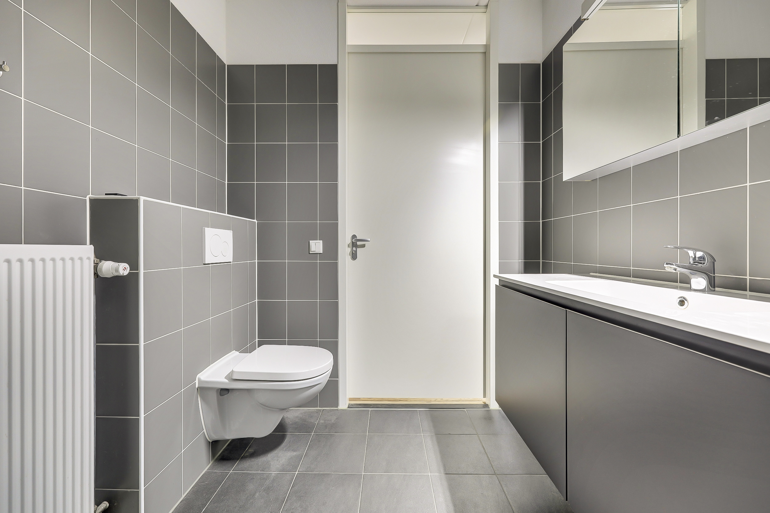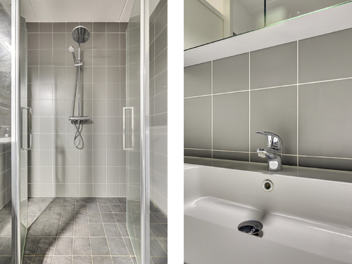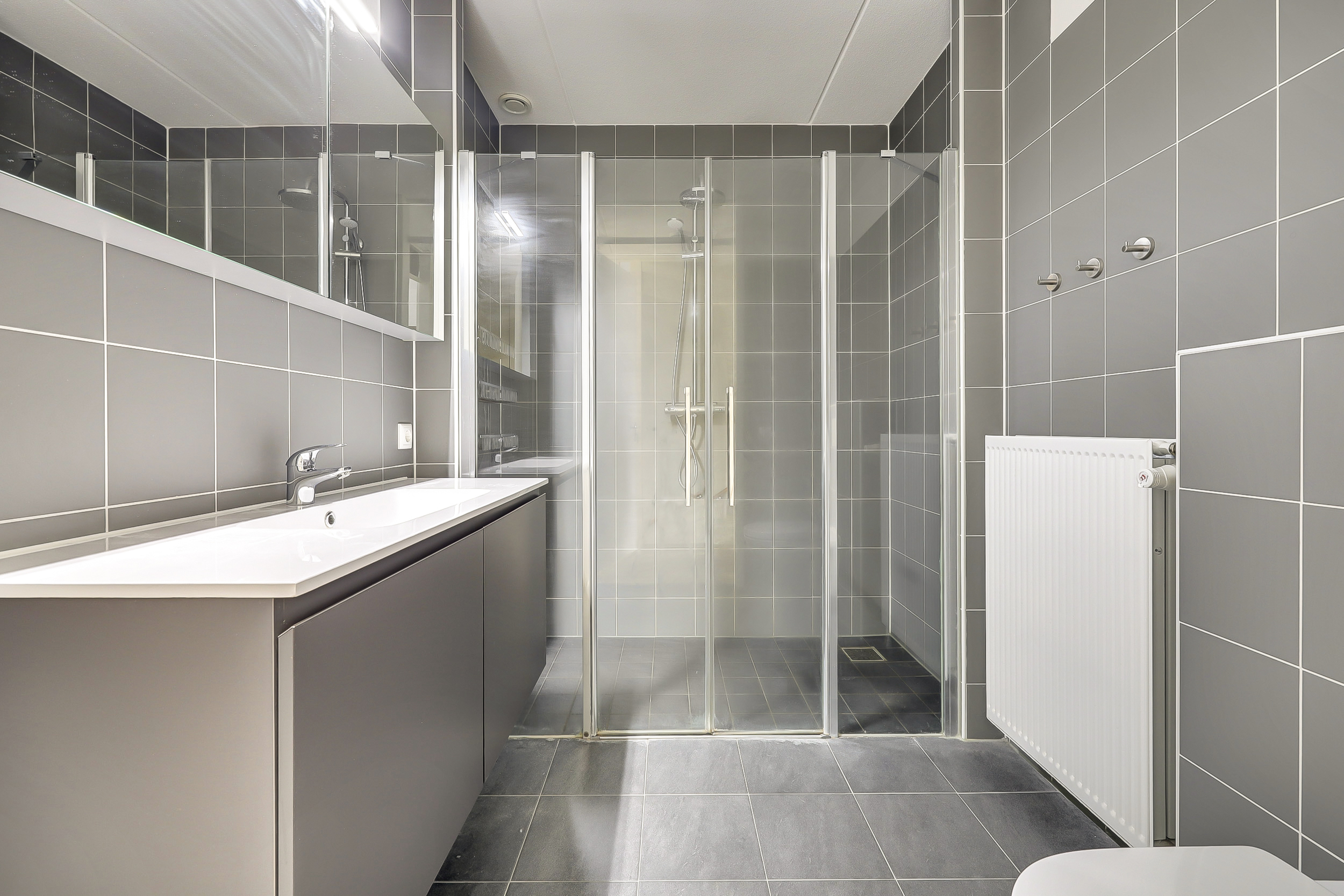 De badkamer (ca. 5 m²) is uitgerust met een royale douchecabine met regendouche, 2e toilet met zwevend closet, wastafel met meubel en mechanische ventilatie.