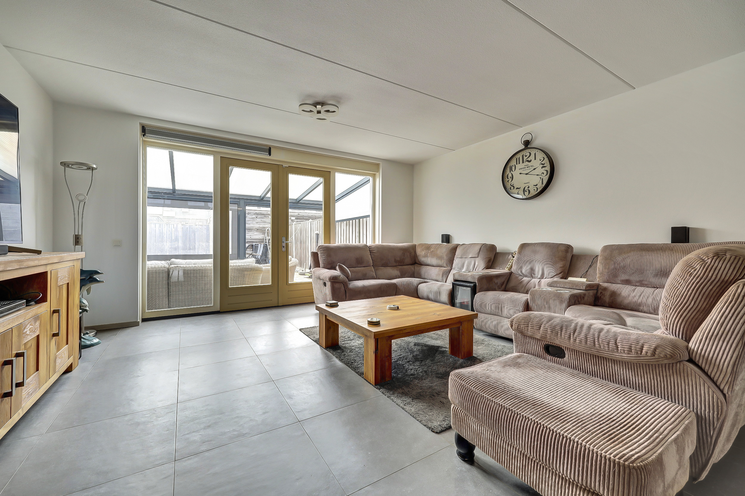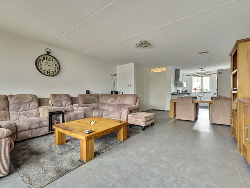 De uitgebouwde en royale woonkamer (ca. 40 m²) is voorzien van een plavuizenvloer met vloerverwarming (hoofdverwarming), glasvezelwandafwerking, een handige voorraadkast en biedt middels de openslaande deuren toegang tot de aangebouwde serre van ca. 18 m².