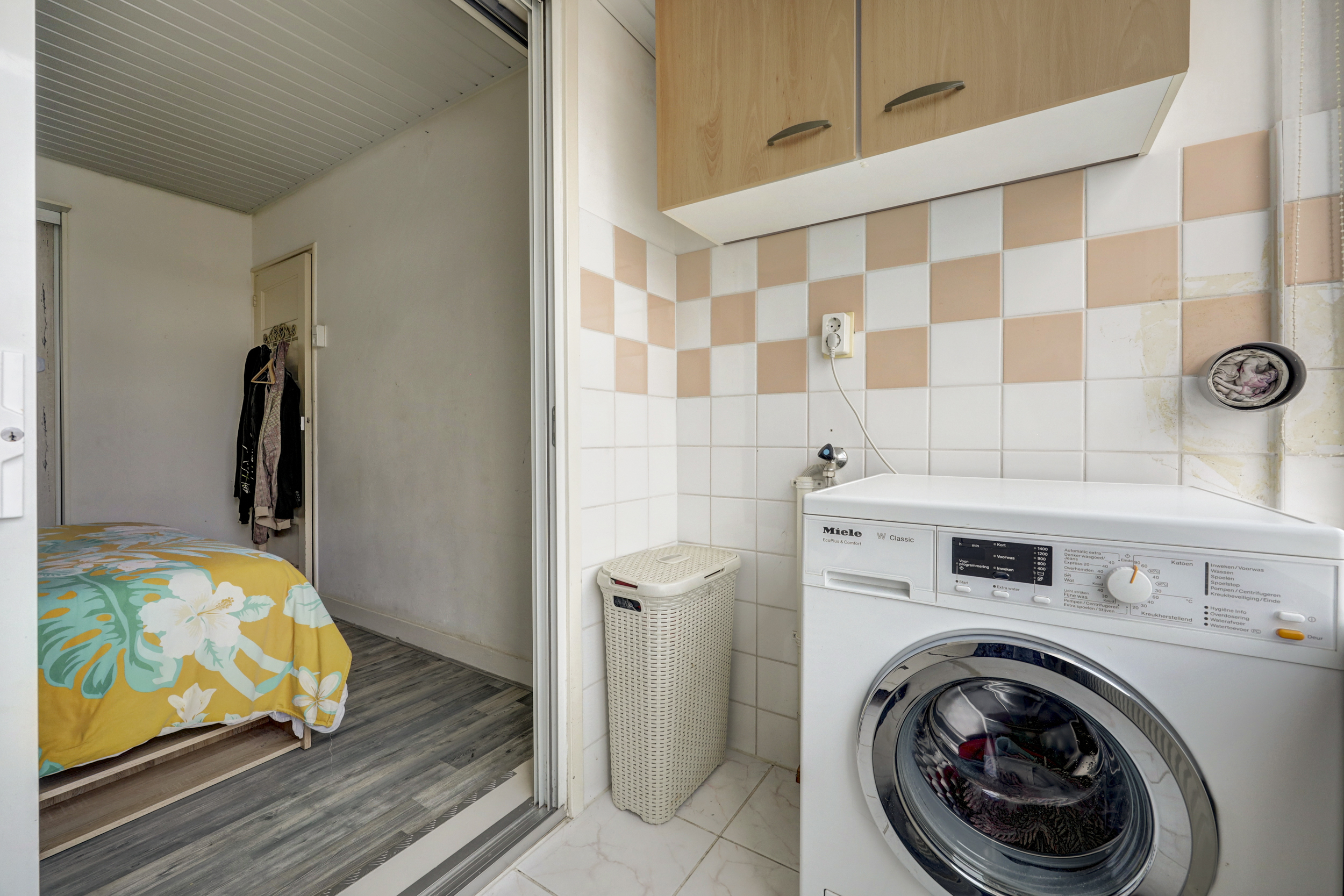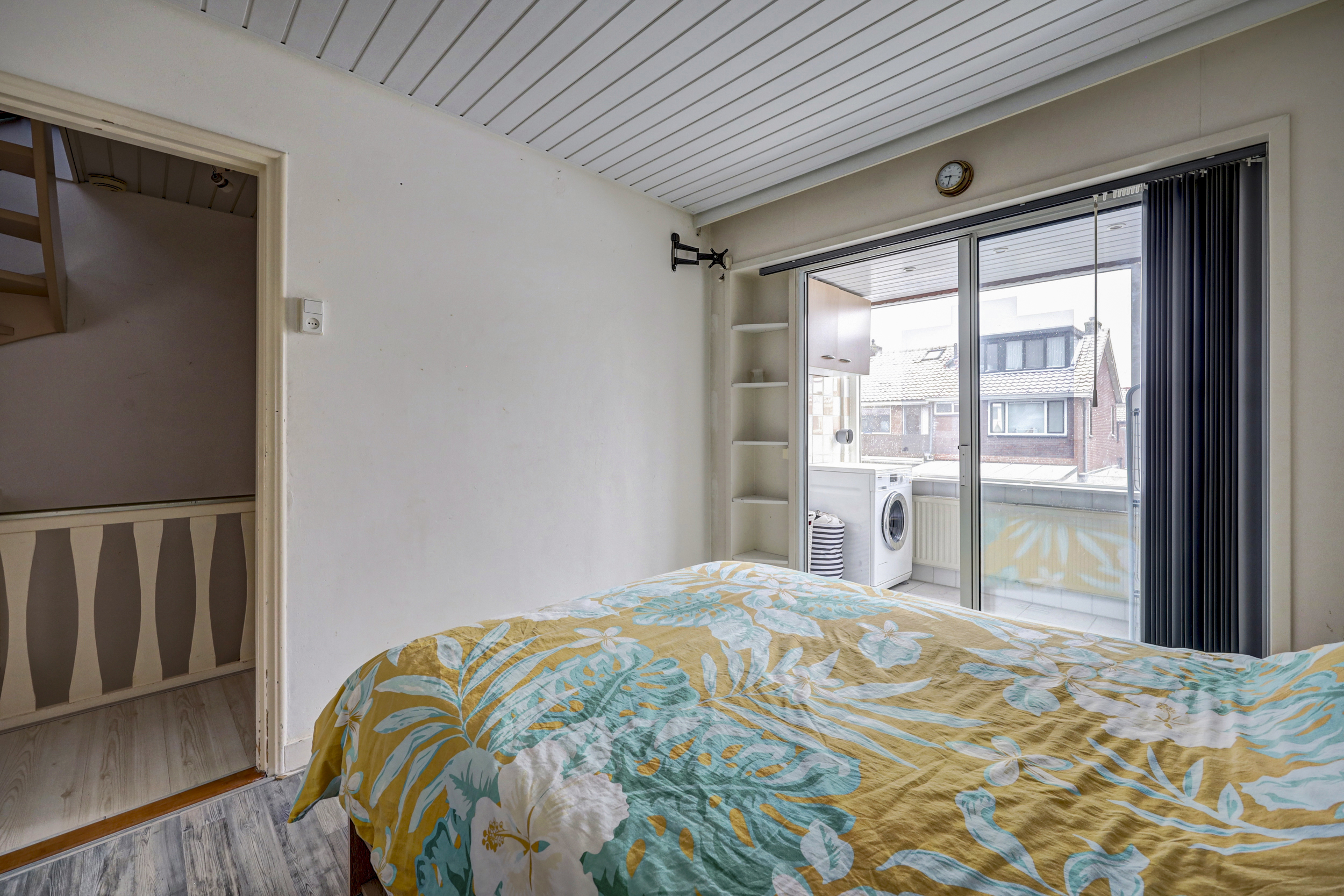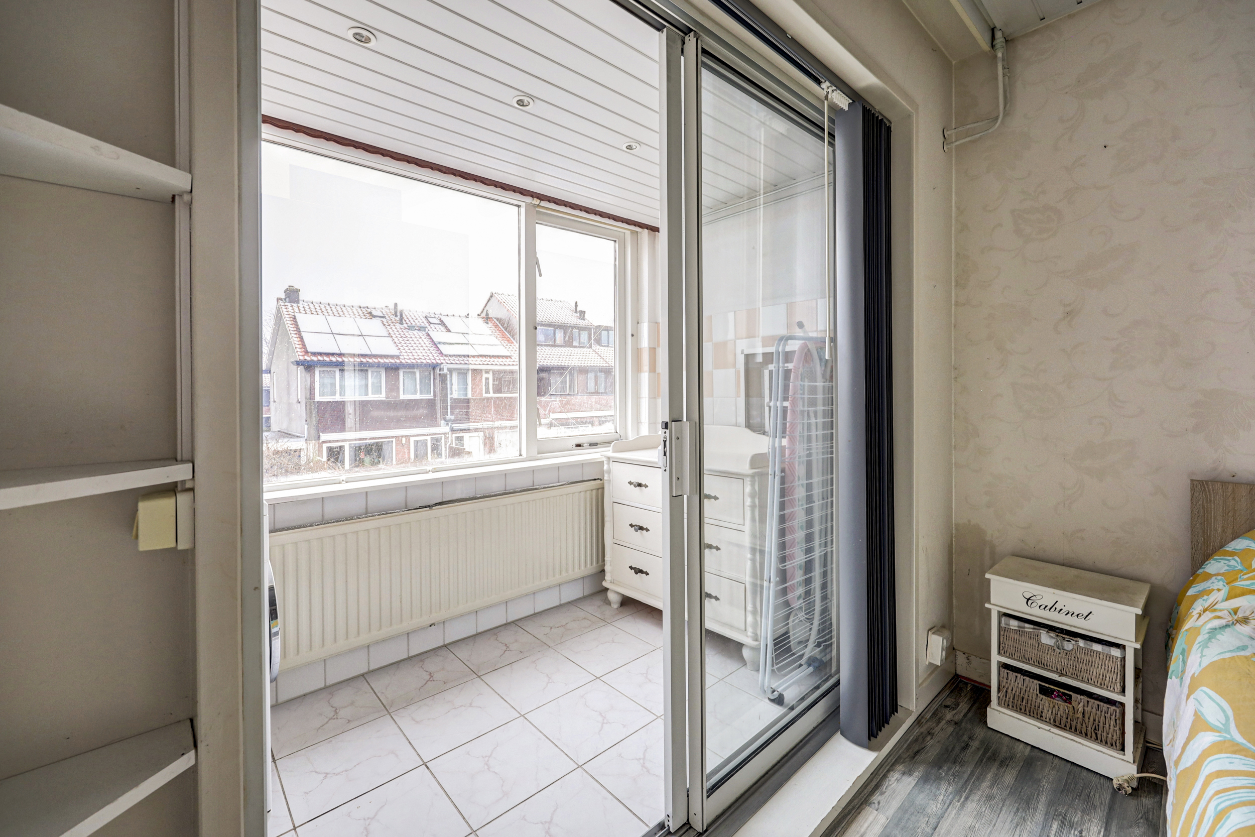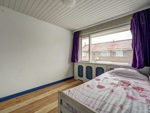 De ouderslaapkamer is gelegen aan de achterzijde van de woning en ca. 10 m² groot. De aangrenzende wasruimte (ca. 4 m², voormalig balkon) is middels een aluminium schuifpui te bereiken vanuit de slaapkamer en is voorzien van een plavuizenvloer, ingebouwde verlichting en de opstelling van de wasmachine en droger.