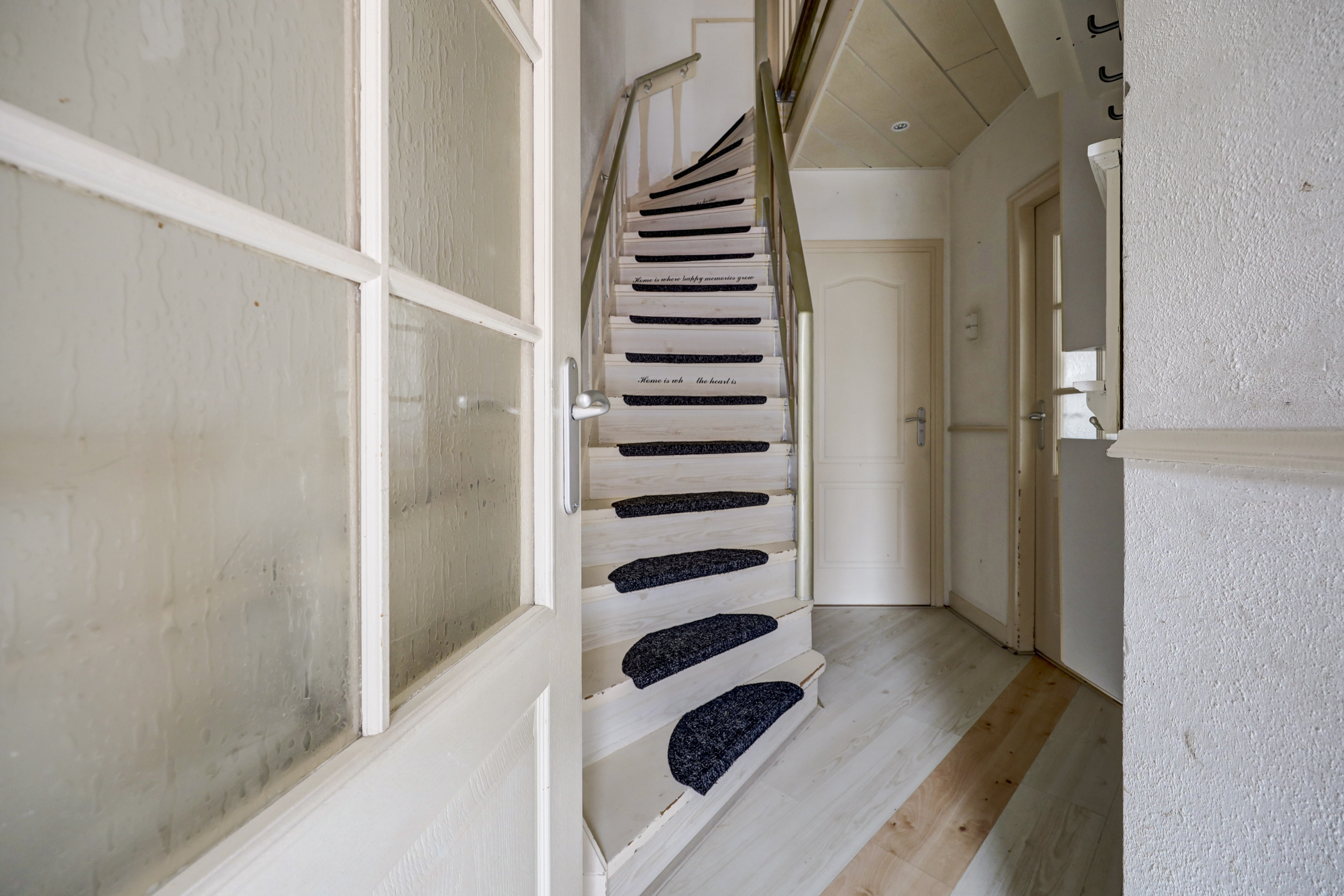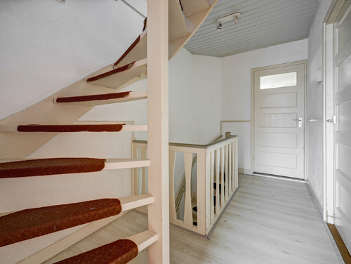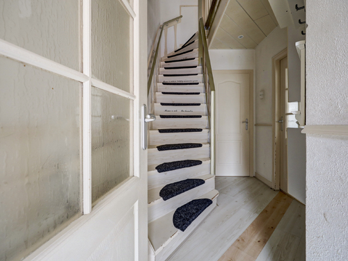 Hal/entree met laminaatvloer, licht gesausde wandafwerking, een handige trapkast, trapopgang, toilet met fonteintje en de toegang tot de gezellige woonkamer.