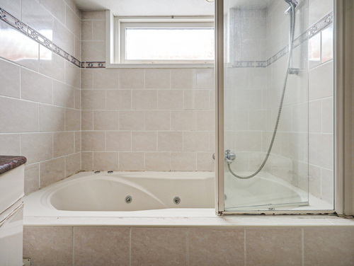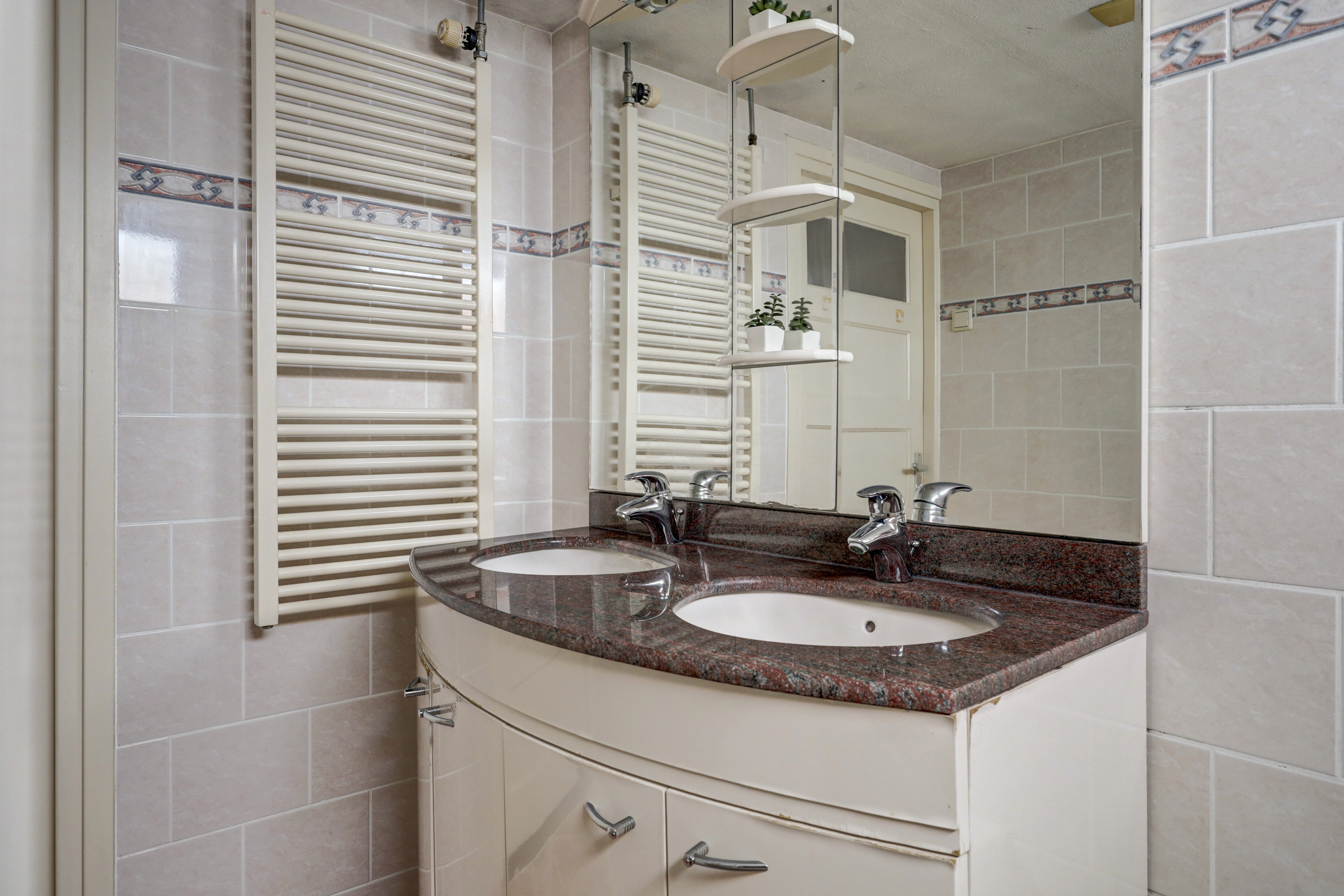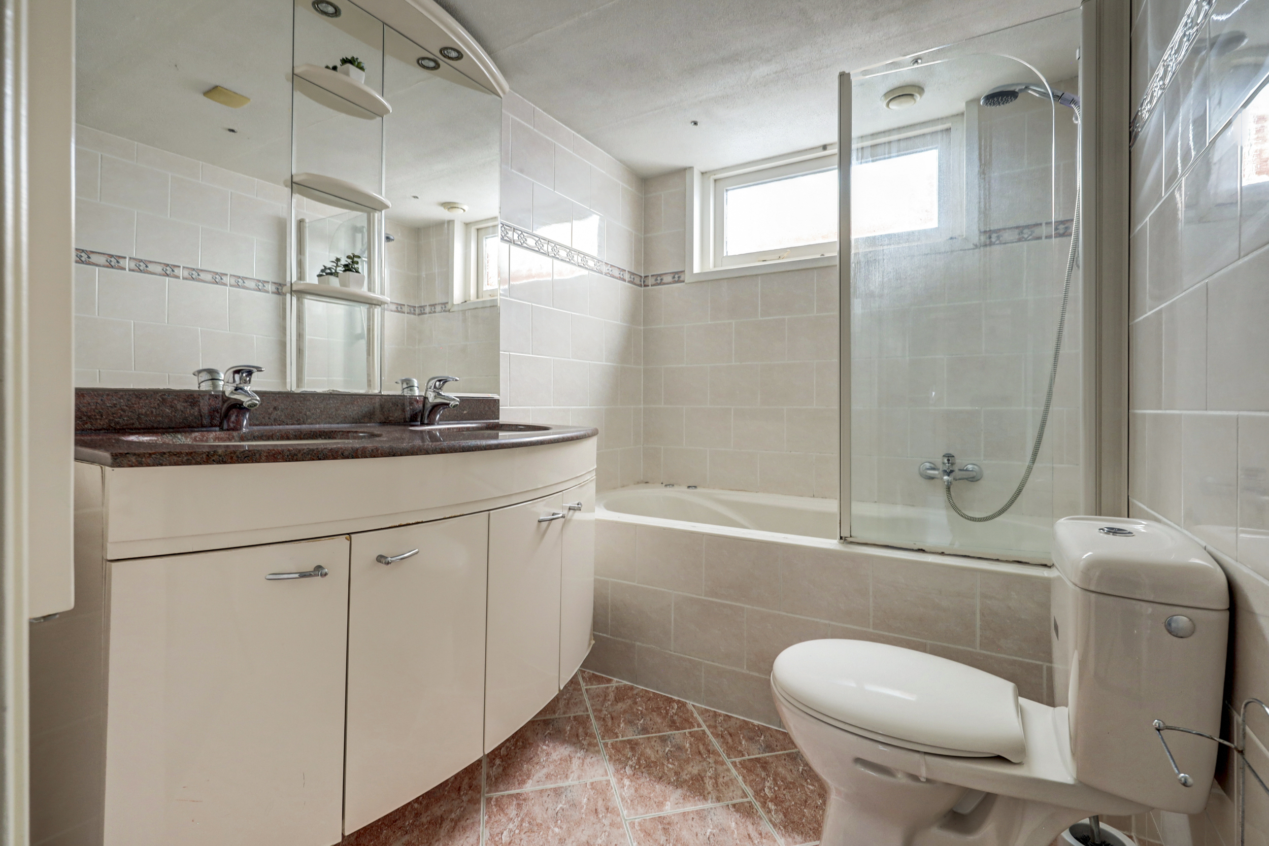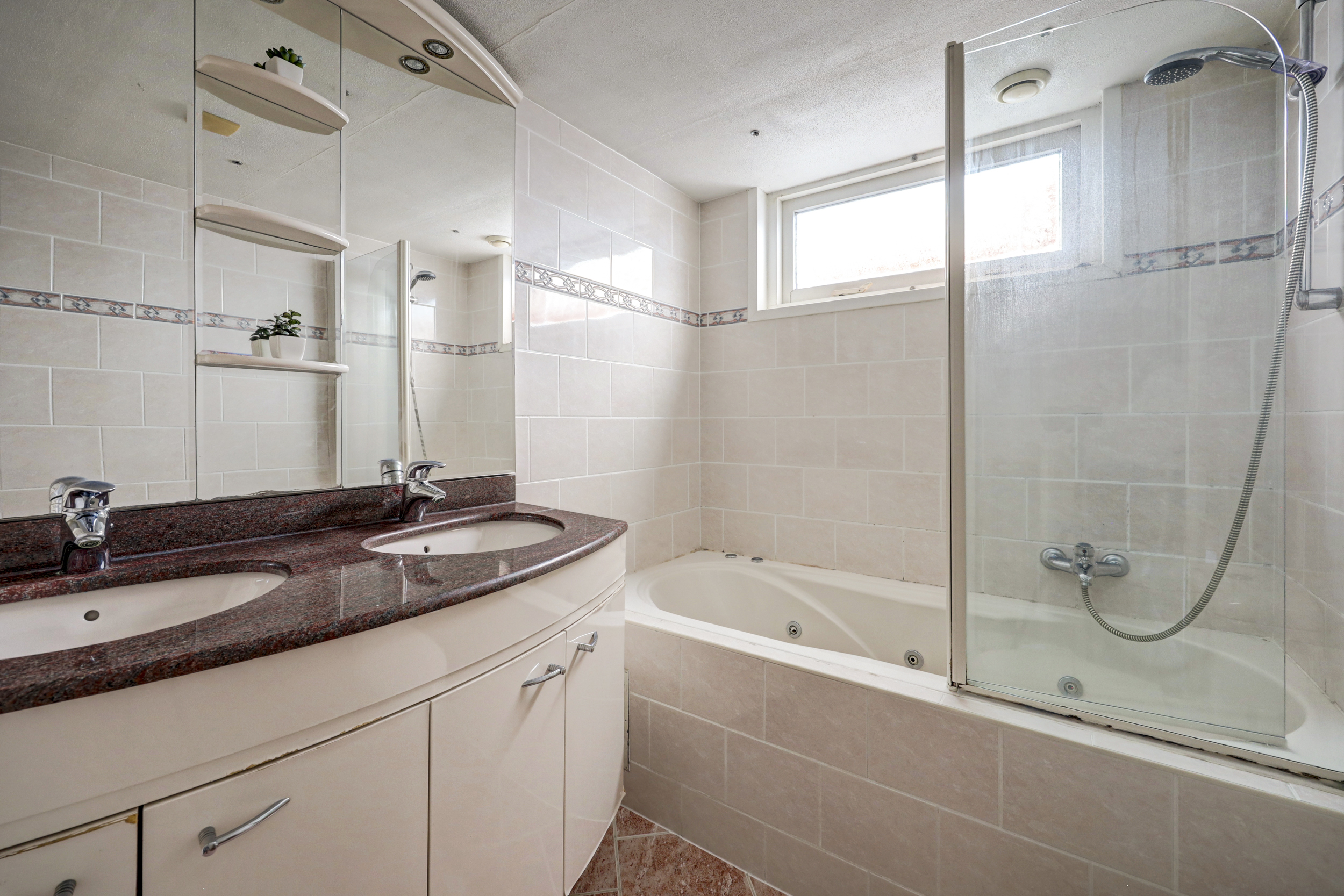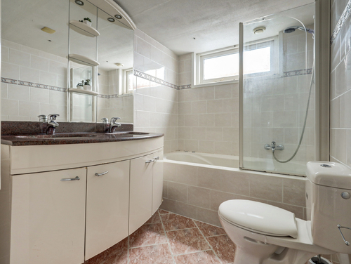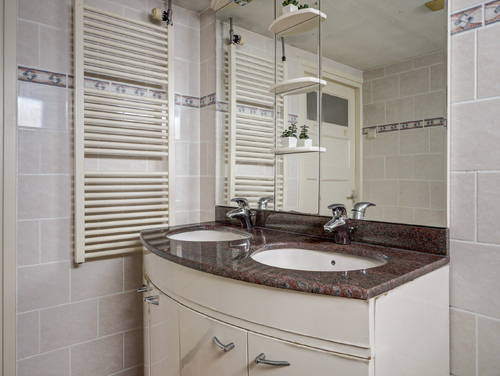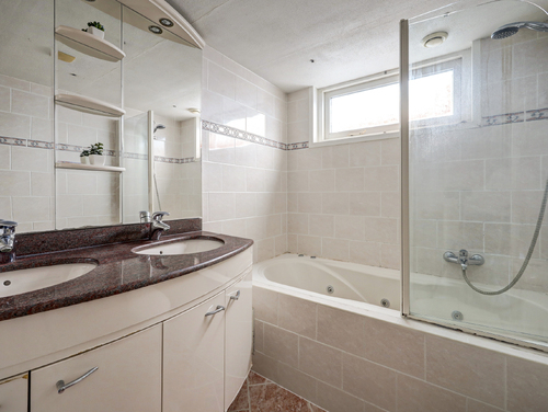 De geheel betegelde badkamer (ca. 5 m²) is voorzien van een dubbele wastafel met meubel, een 2e toilet, een uitzetraam, ingebouwde verlichting en een whirlpool met spatscherm.