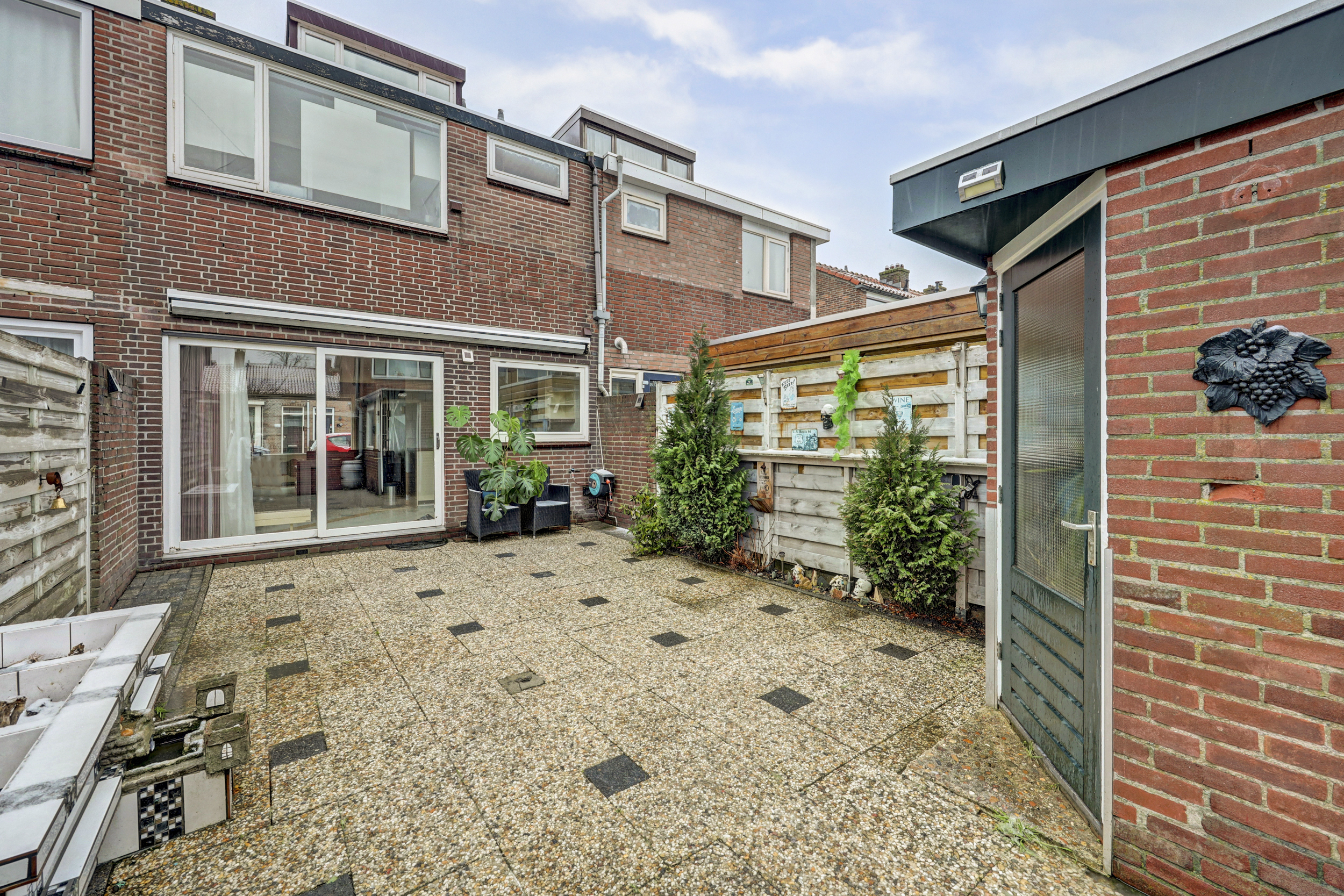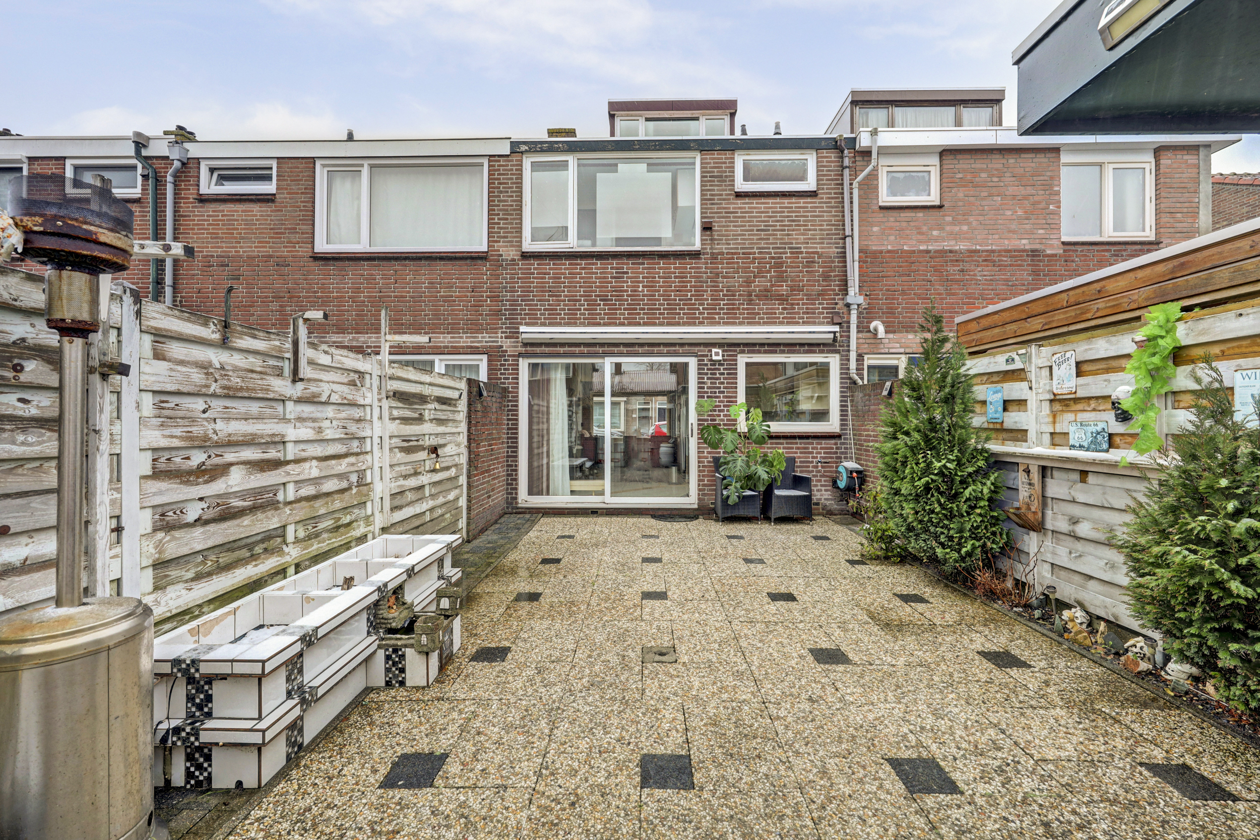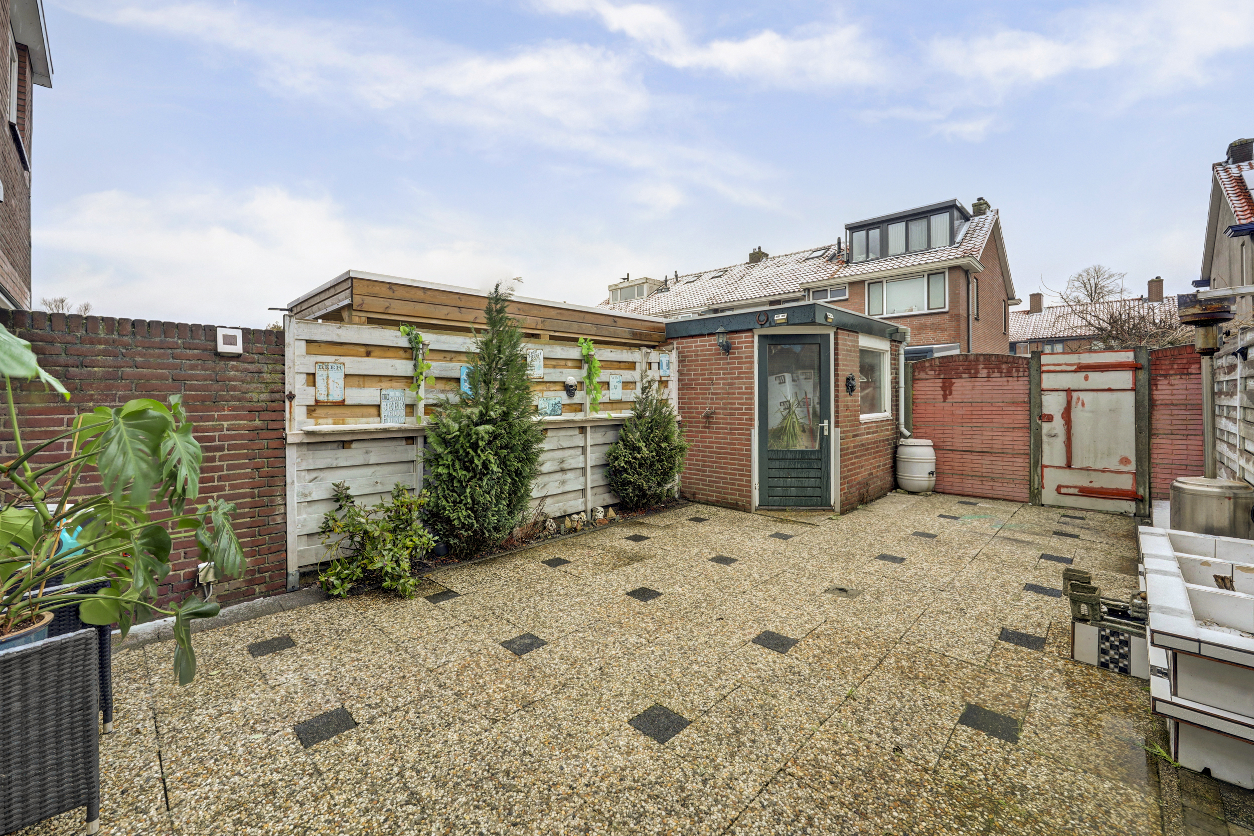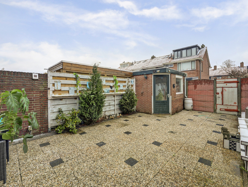 De tuin is geheel omheind en uitgerust met betegeling, een buitenkraan, zonwering, achterom en een vrijstaande stenen berging.