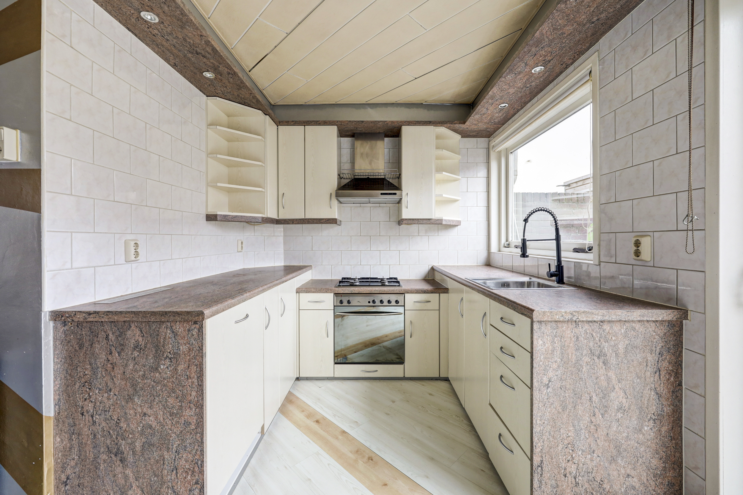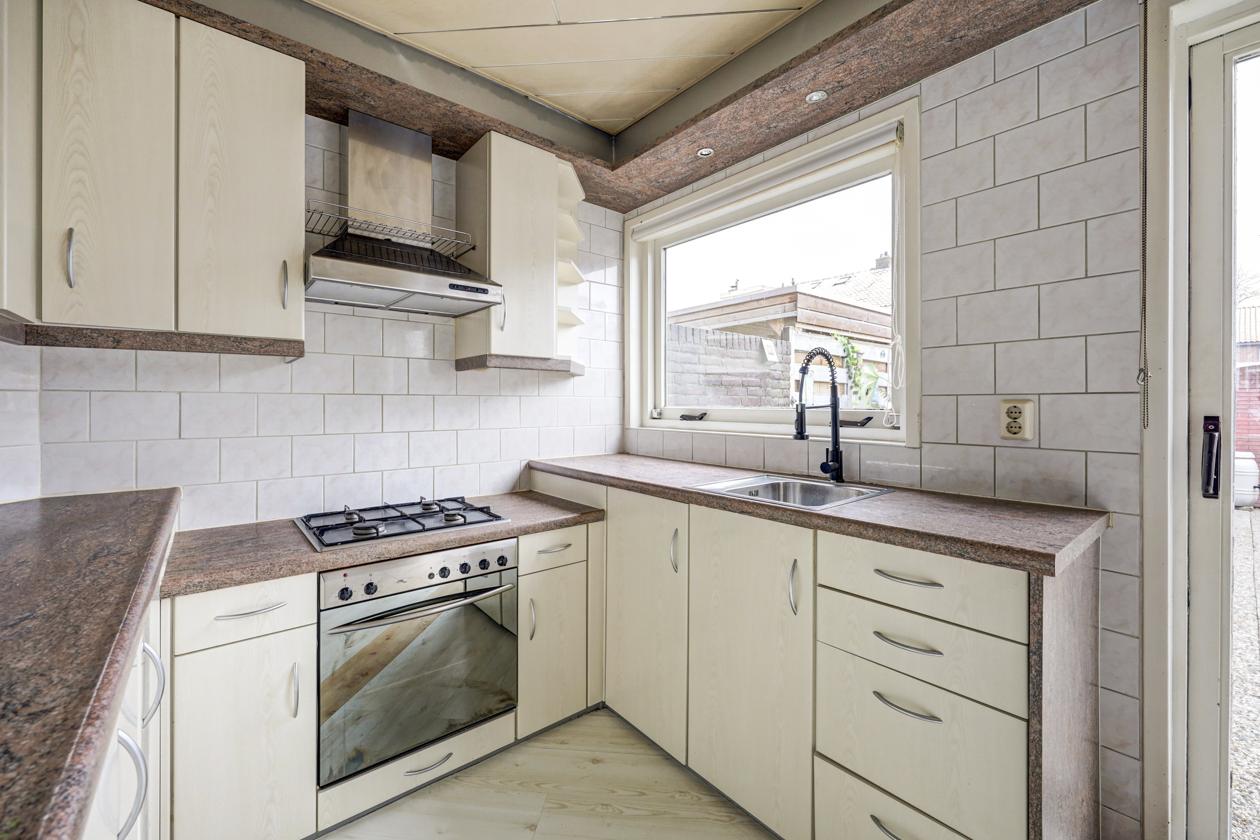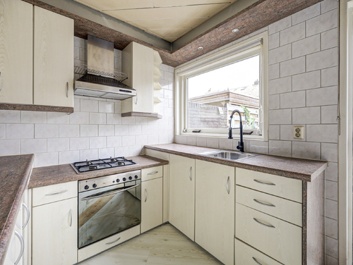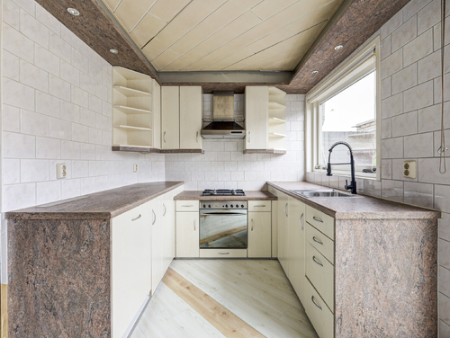De open keuken (ca. 5 m²) is gesitueerd aan de achterzijde van de woning en U-vormig uitgevoerd met diverse apparatuur zoals een vaatwasser, oven, gaskookplaat een RVS afzuigkap en een 15 liter close in boiler. Hier tref je ook een groot raam en een schuifpui die toegang geeft tot de besloten achtertuin.